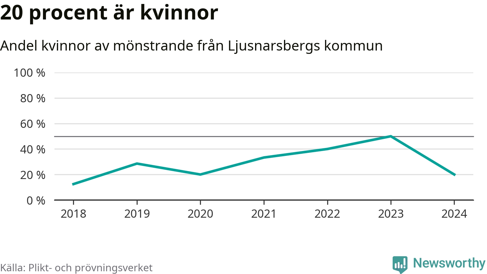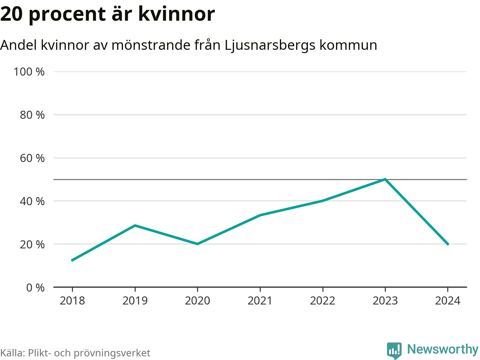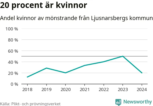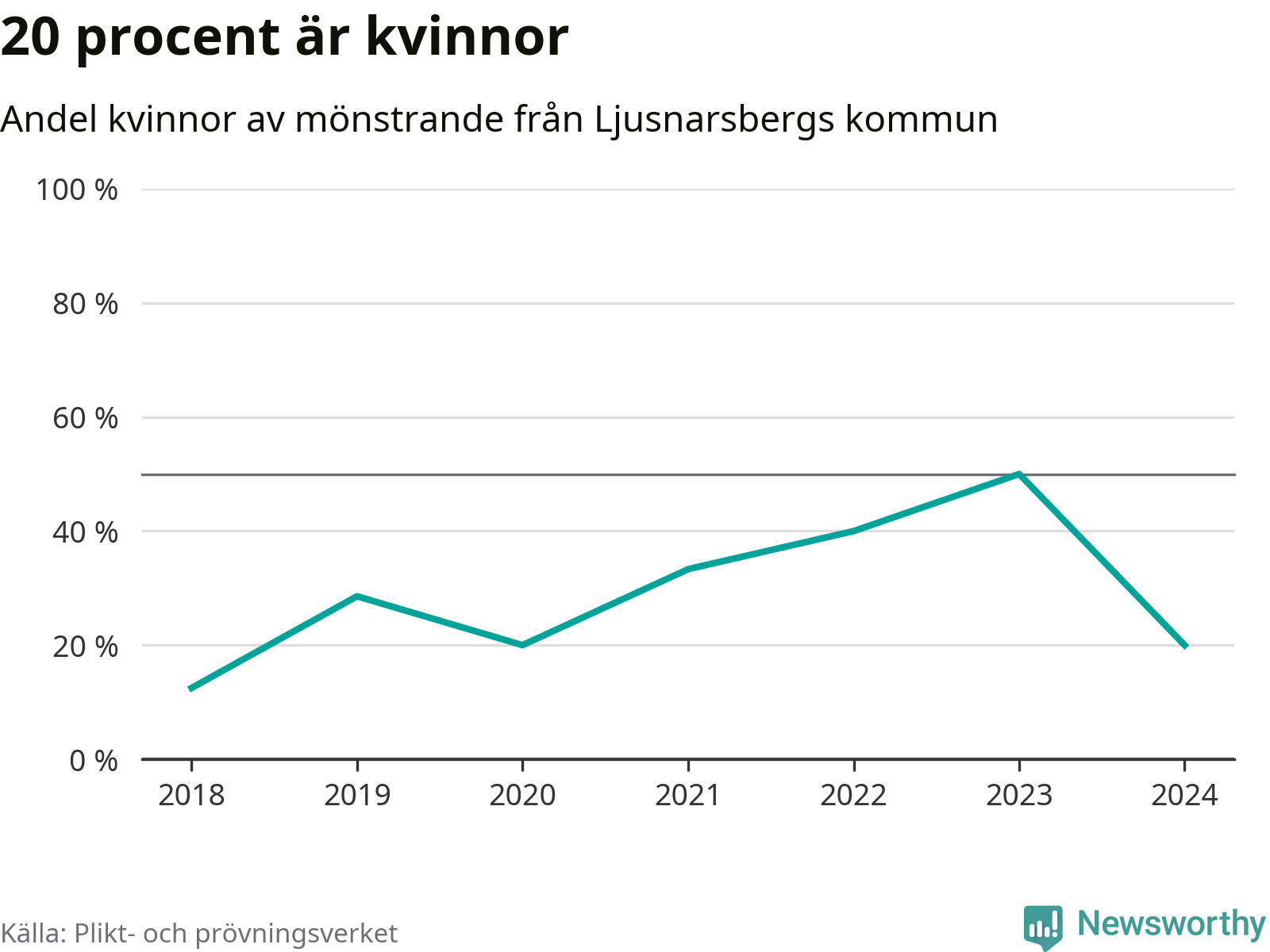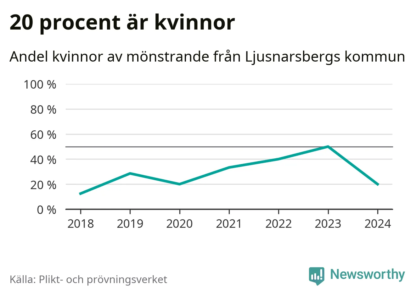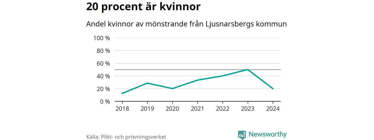 En av de som kallats till mönstring från Ljusnarsberg är kvinna. Som mest har fyra kvinnor kallats från kommunen (2023). I riket som helhet är 30 procent av de mönstrande tjejer.