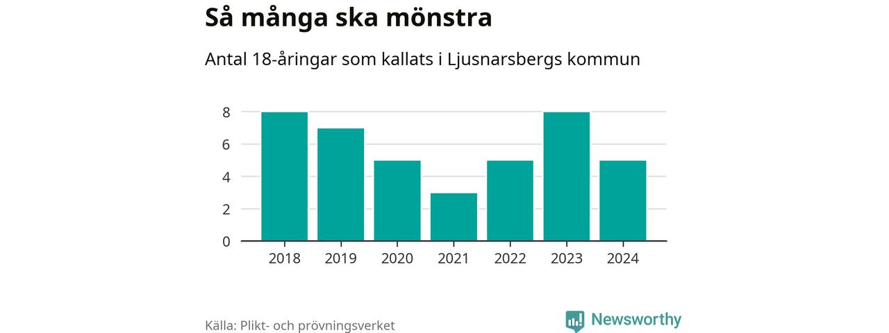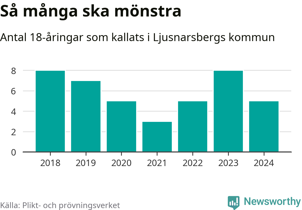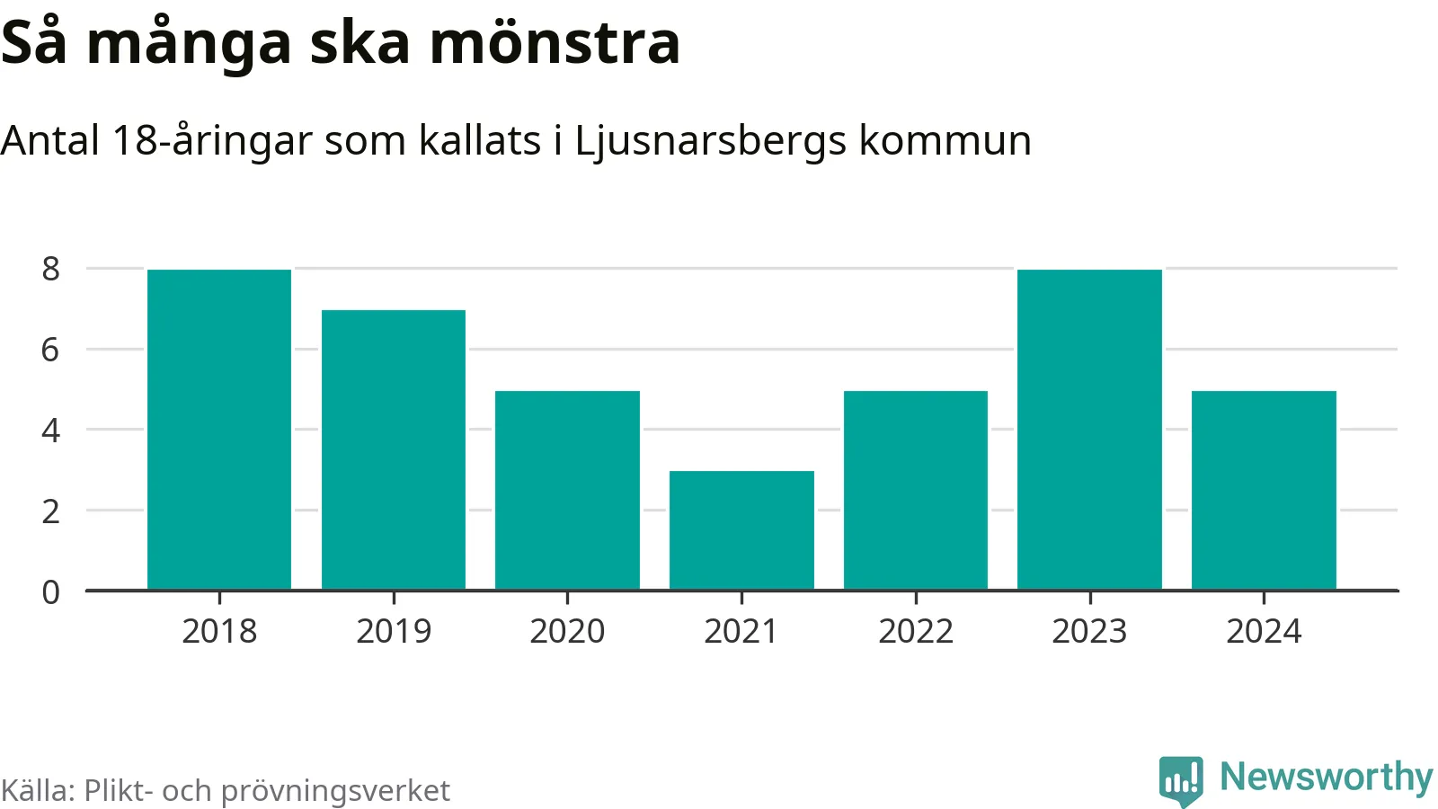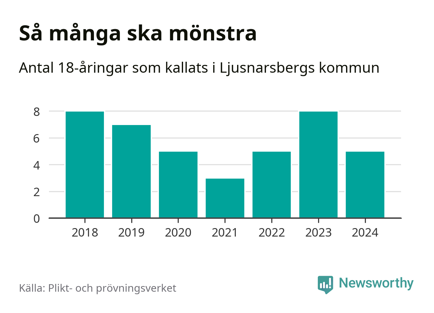 Fem personer är tre färre än 2023. 2018 kallades som jämförelse åtta 18-åringar från Ljusnarsberg till mönstring. Det motsvarade ungefär 15 procent av årskullen född år 2000. Totalt från Örebro län kallas 786 personer födda 2006 i år.