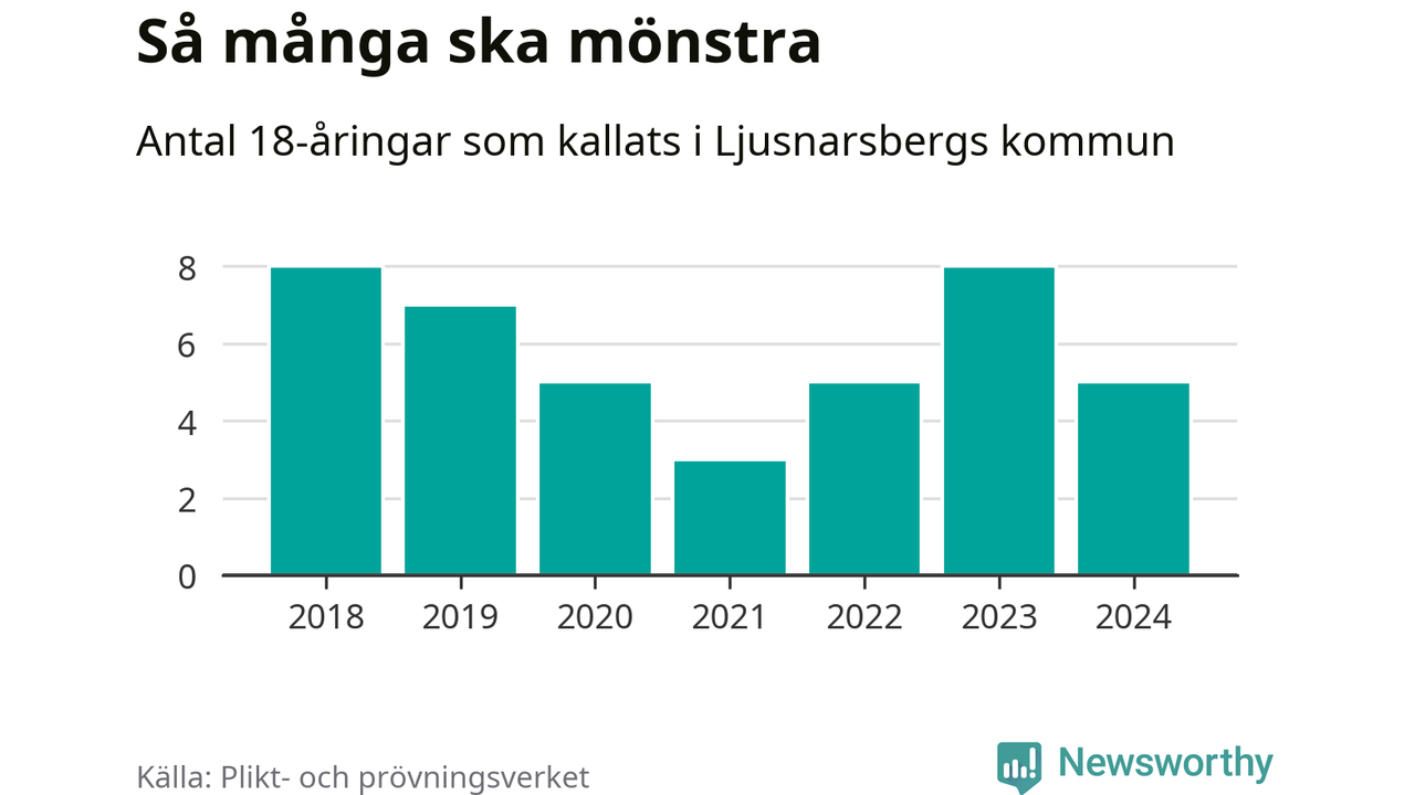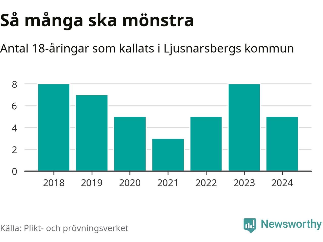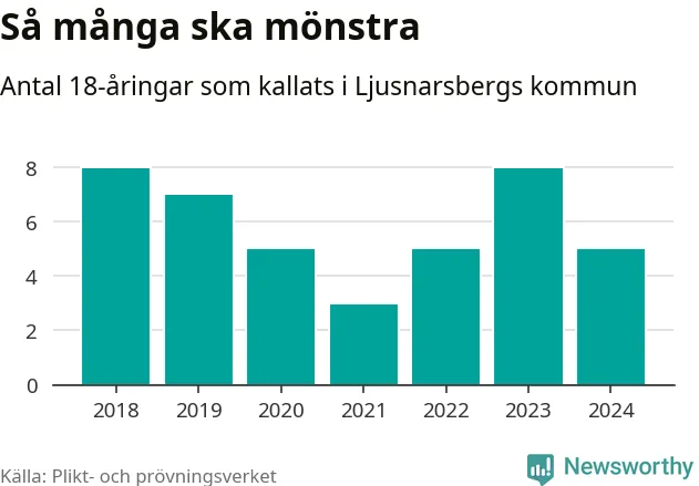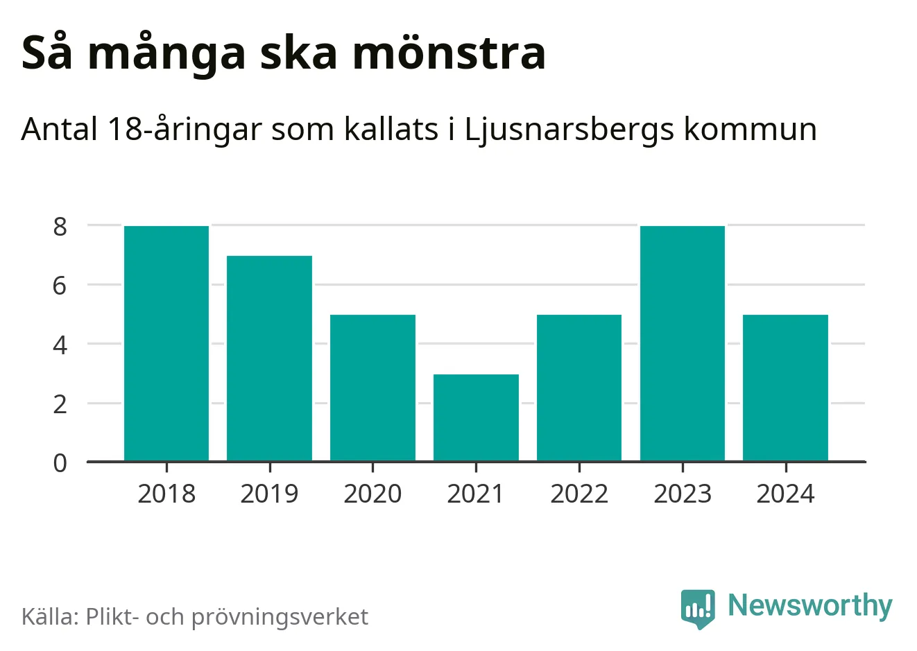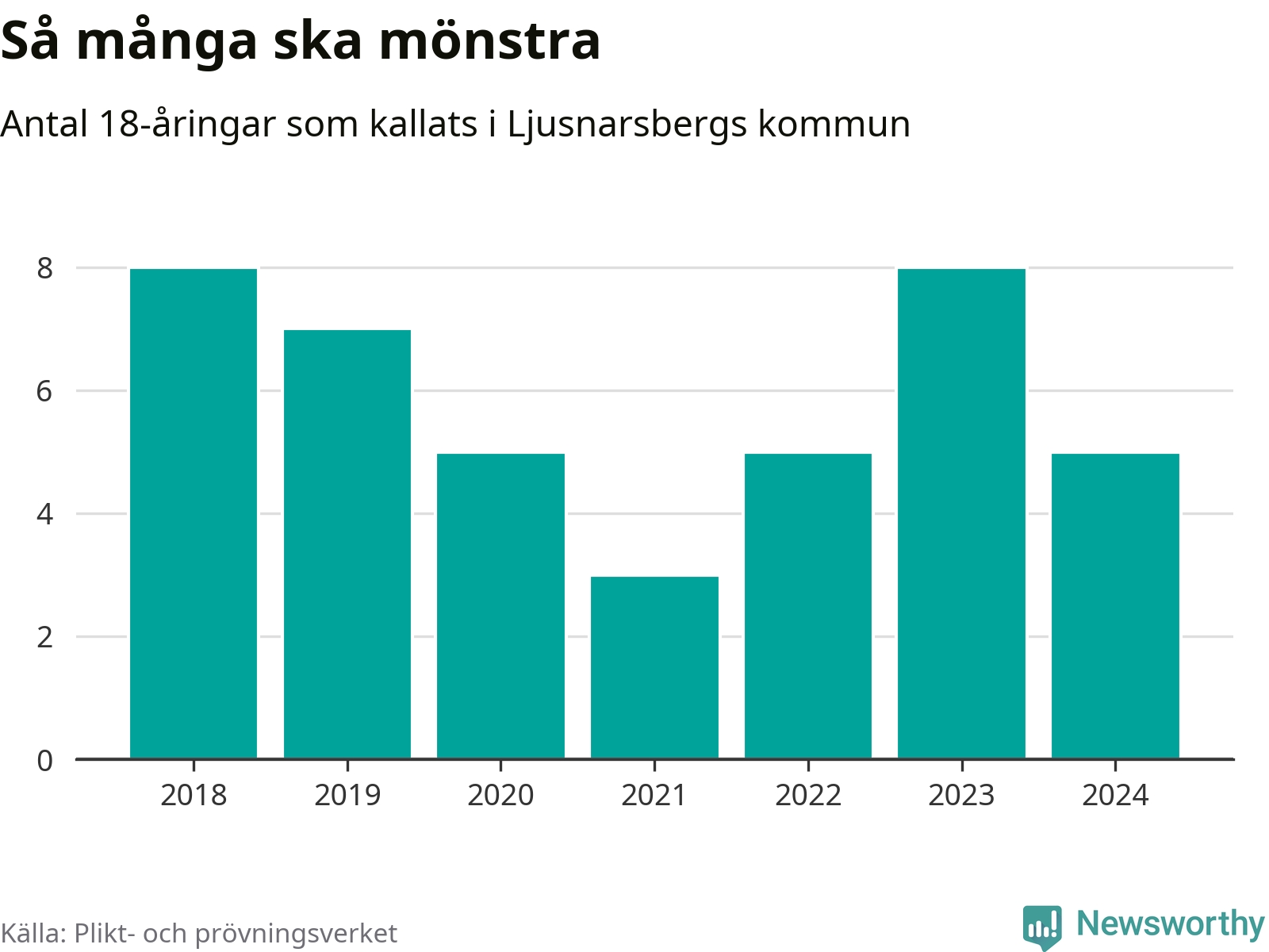 Fem personer är tre färre än 2023. 2018 kallades som jämförelse åtta 18-åringar från Ljusnarsberg till mönstring. Det motsvarade ungefär 15 procent av årskullen född år 2000. Totalt från Örebro län kallas 786 personer födda 2006 i år.