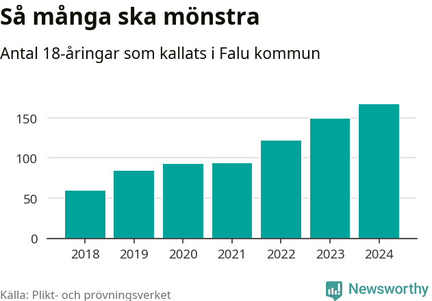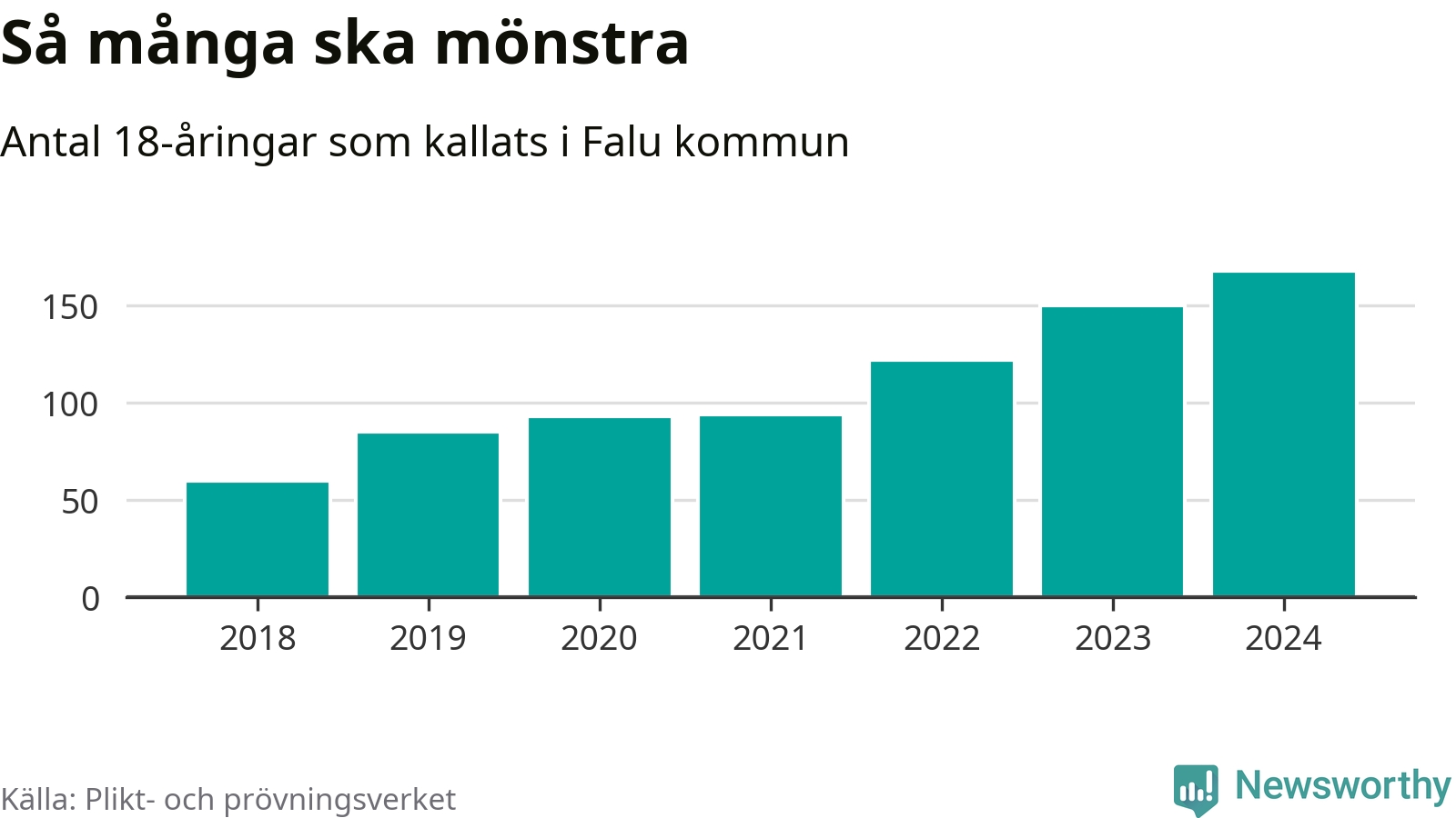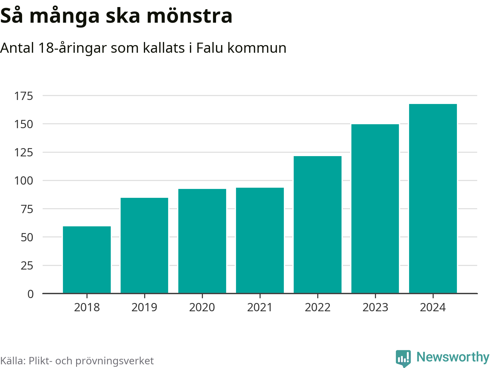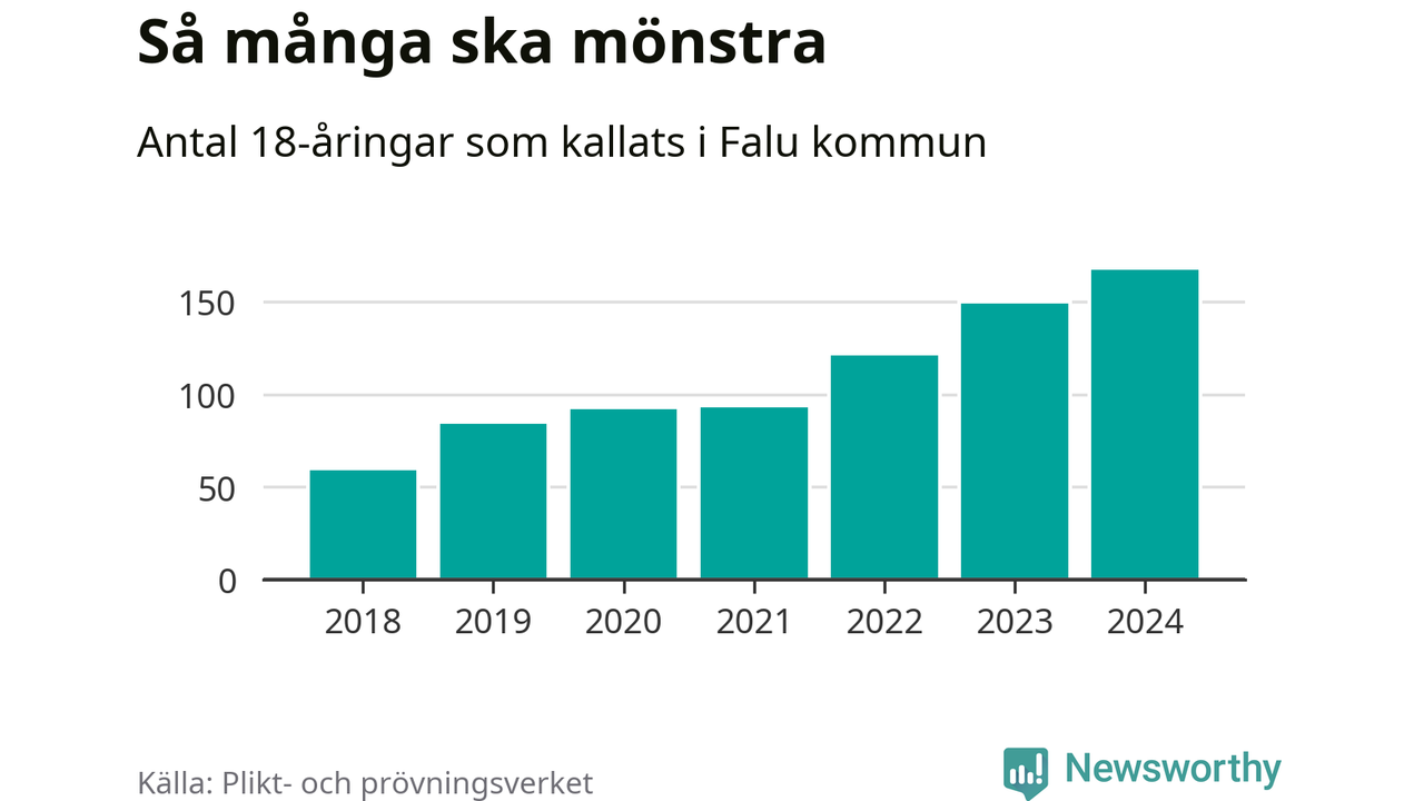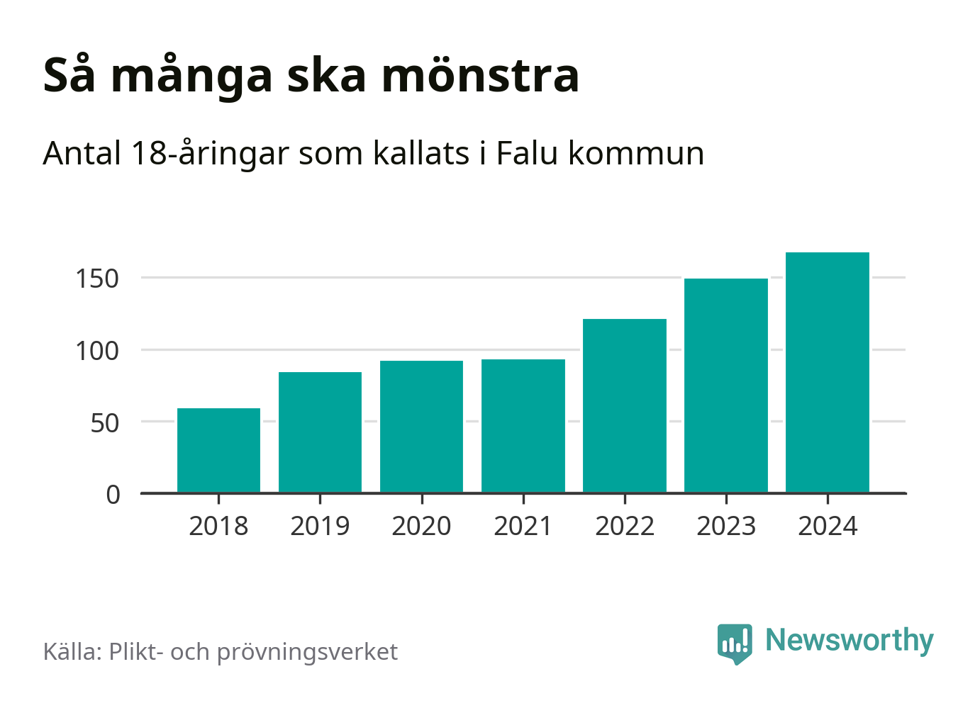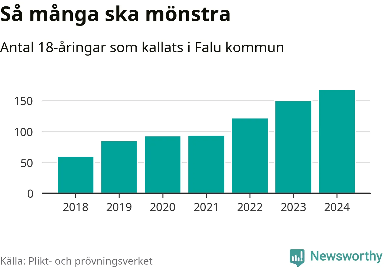Antalet kallade i Falun har ökat varje år sedan 2018, som är första året med statistik på kommunnivå (värnplikten återinfördes 2017), och jämfört med 2023 är det 18 fler i år. 2018 kallades som jämförelse 60 artonåringar från Falun till mönstring. Det motsvarade ungefär 9 procent av årskullen född år 2000. Totalt från Dalarnas län kallas 729 personer födda 2006 i år.