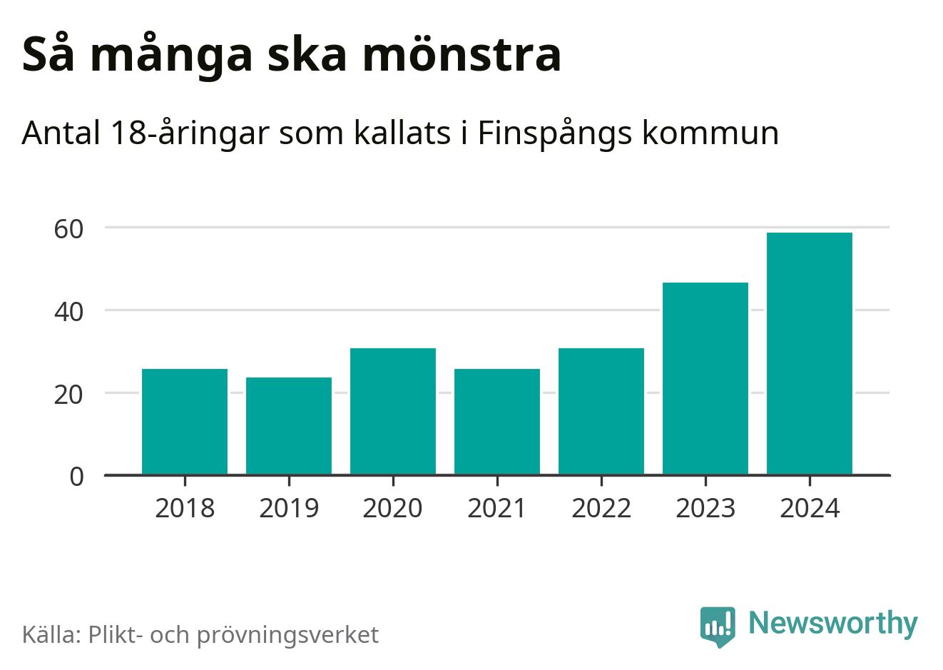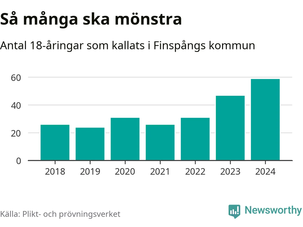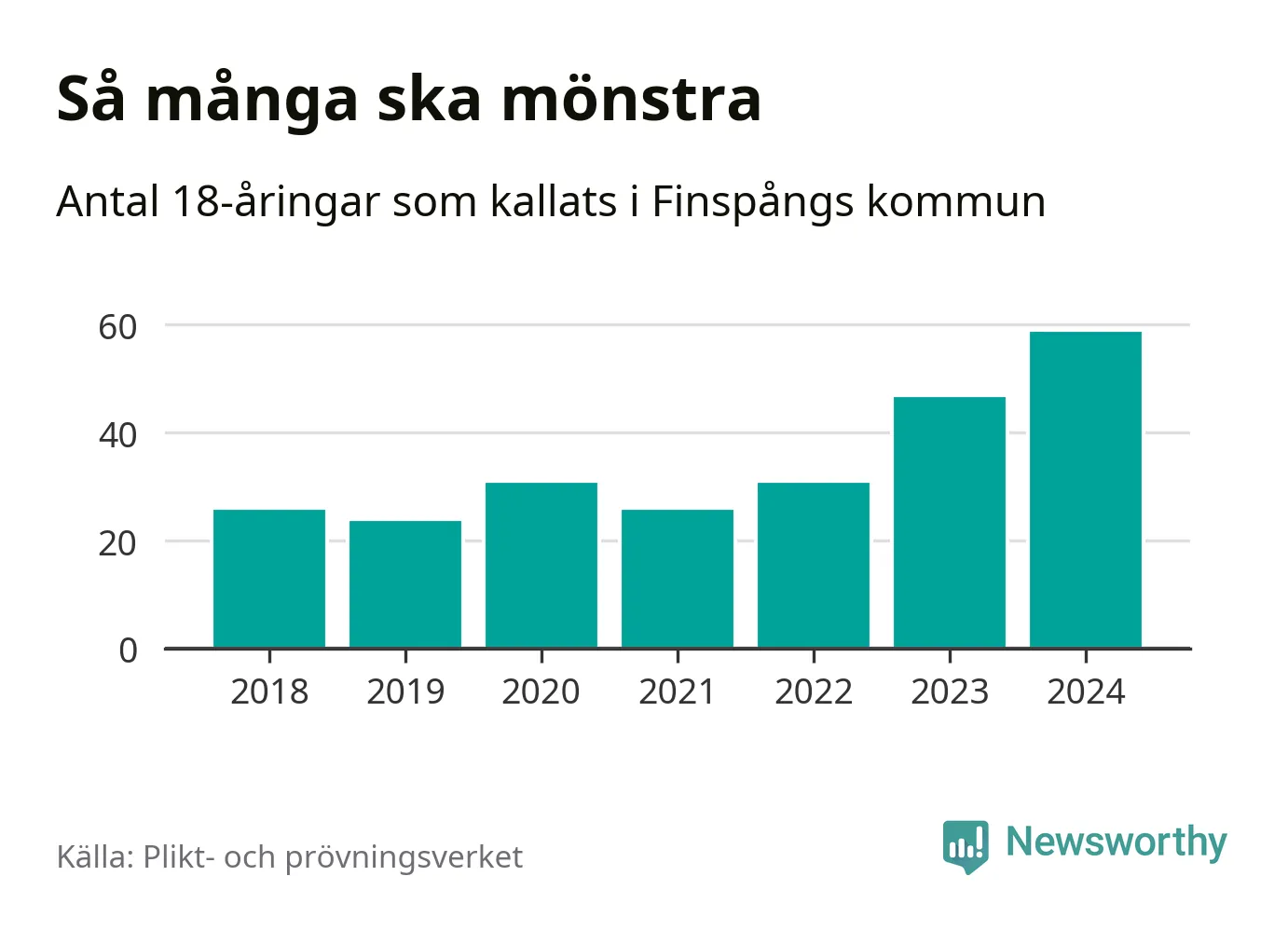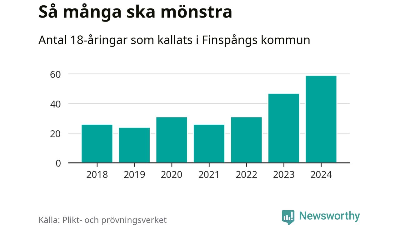 59 personer är det högsta antalet kallade i Finspång sedan 2018, som är första året med statistik på kommunnivå (värnplikten återinfördes 2017), och tolv mönstrande mer än 2023. 2018 kallades som jämförelse 26 artonåringar från Finspång till mönstring. Det motsvarade ungefär 10 procent av årskullen född år 2000. Totalt från Östergötlands län kallas 1 251 personer födda 2006 i år.
