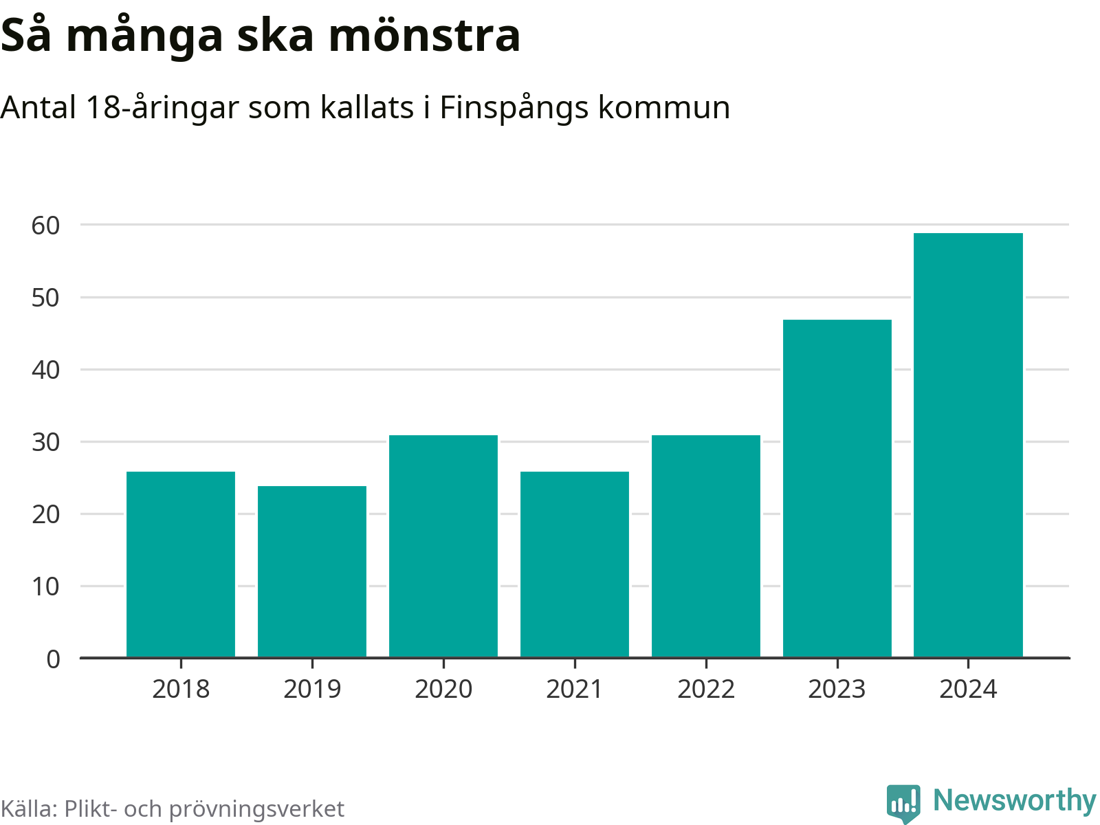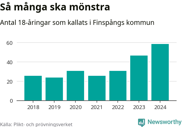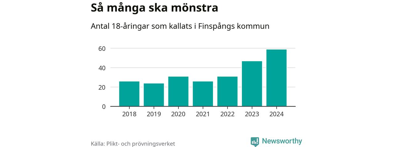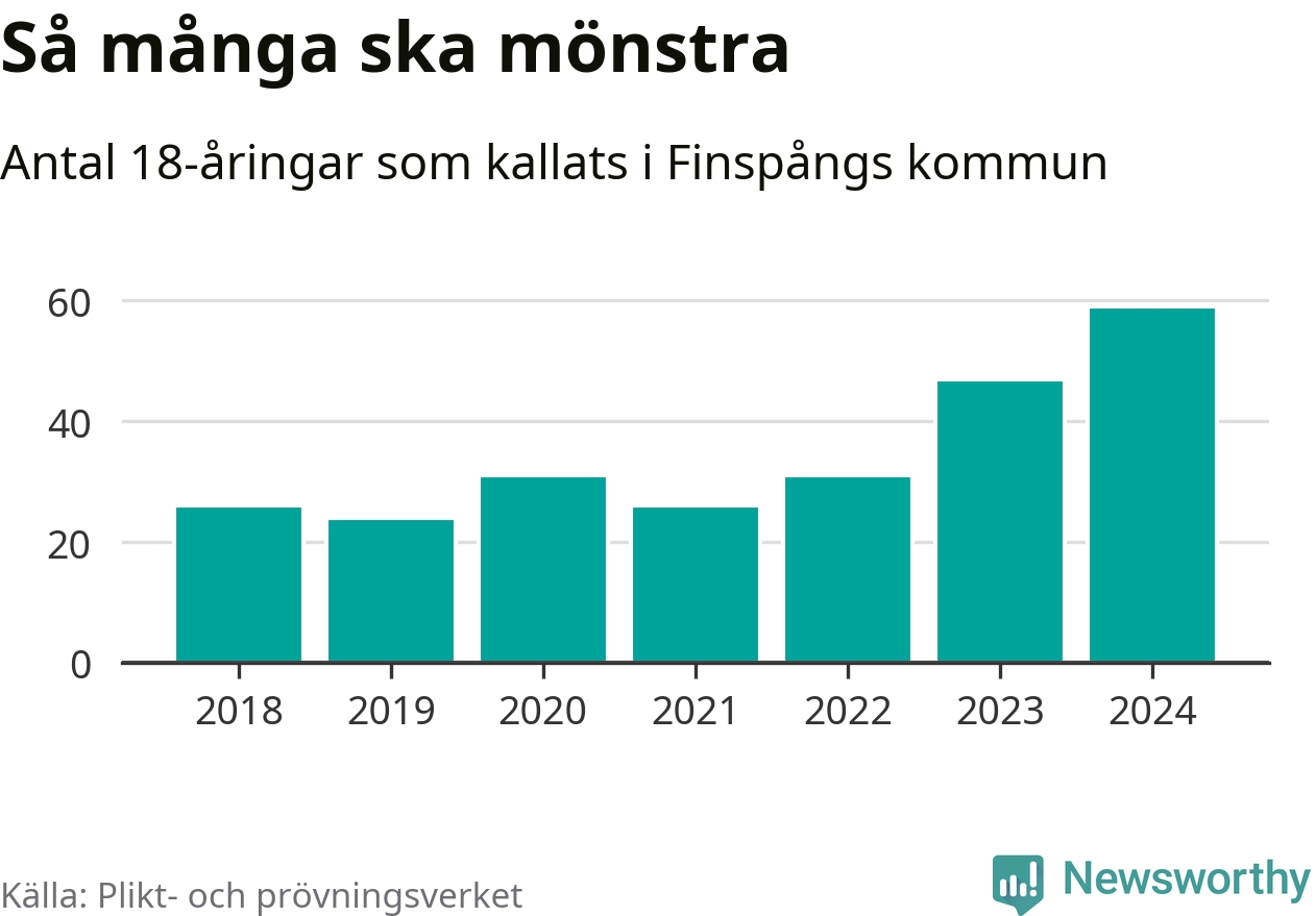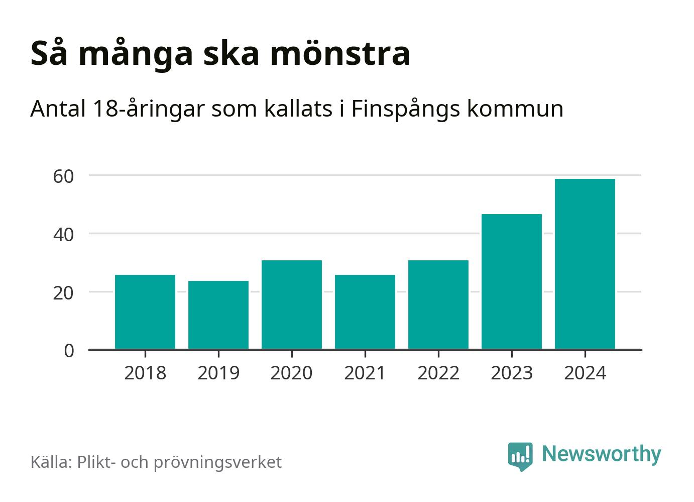 59 personer är det högsta antalet kallade i Finspång sedan 2018, som är första året med statistik på kommunnivå (värnplikten återinfördes 2017), och tolv mönstrande mer än 2023. 2018 kallades som jämförelse 26 artonåringar från Finspång till mönstring. Det motsvarade ungefär 10 procent av årskullen född år 2000. Totalt från Östergötlands län kallas 1 251 personer födda 2006 i år.