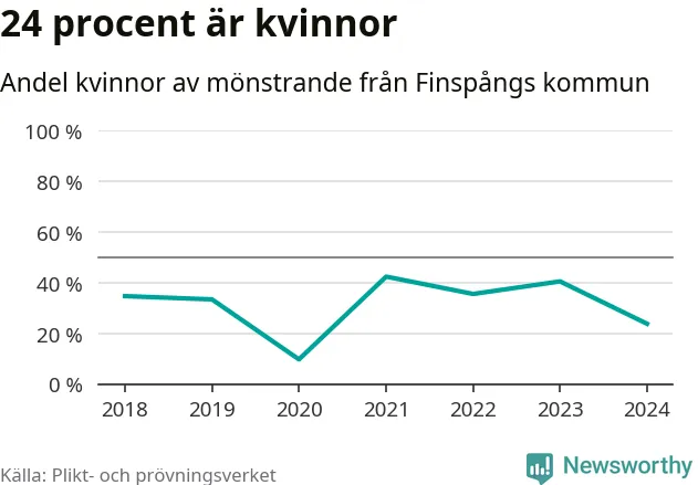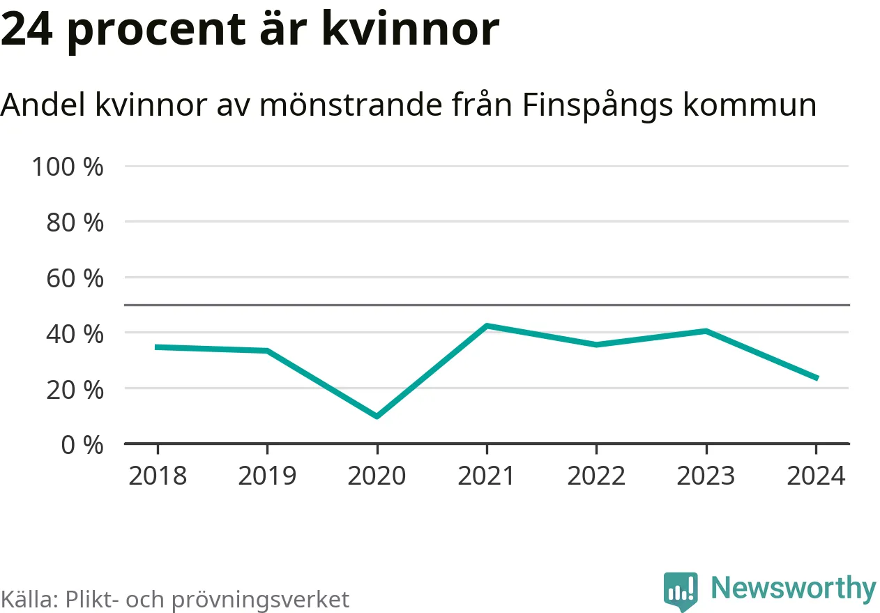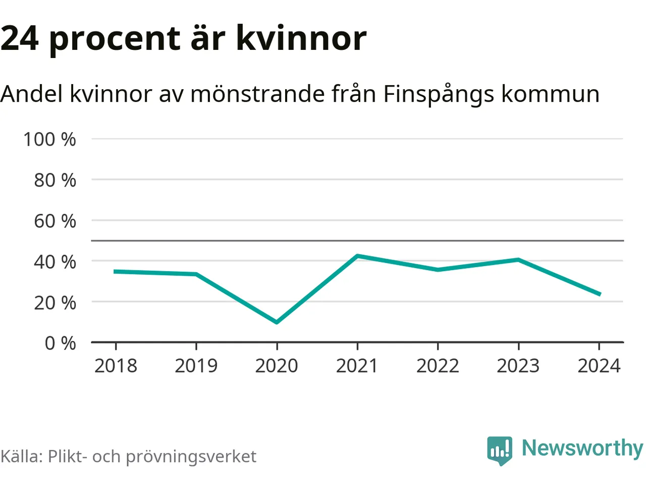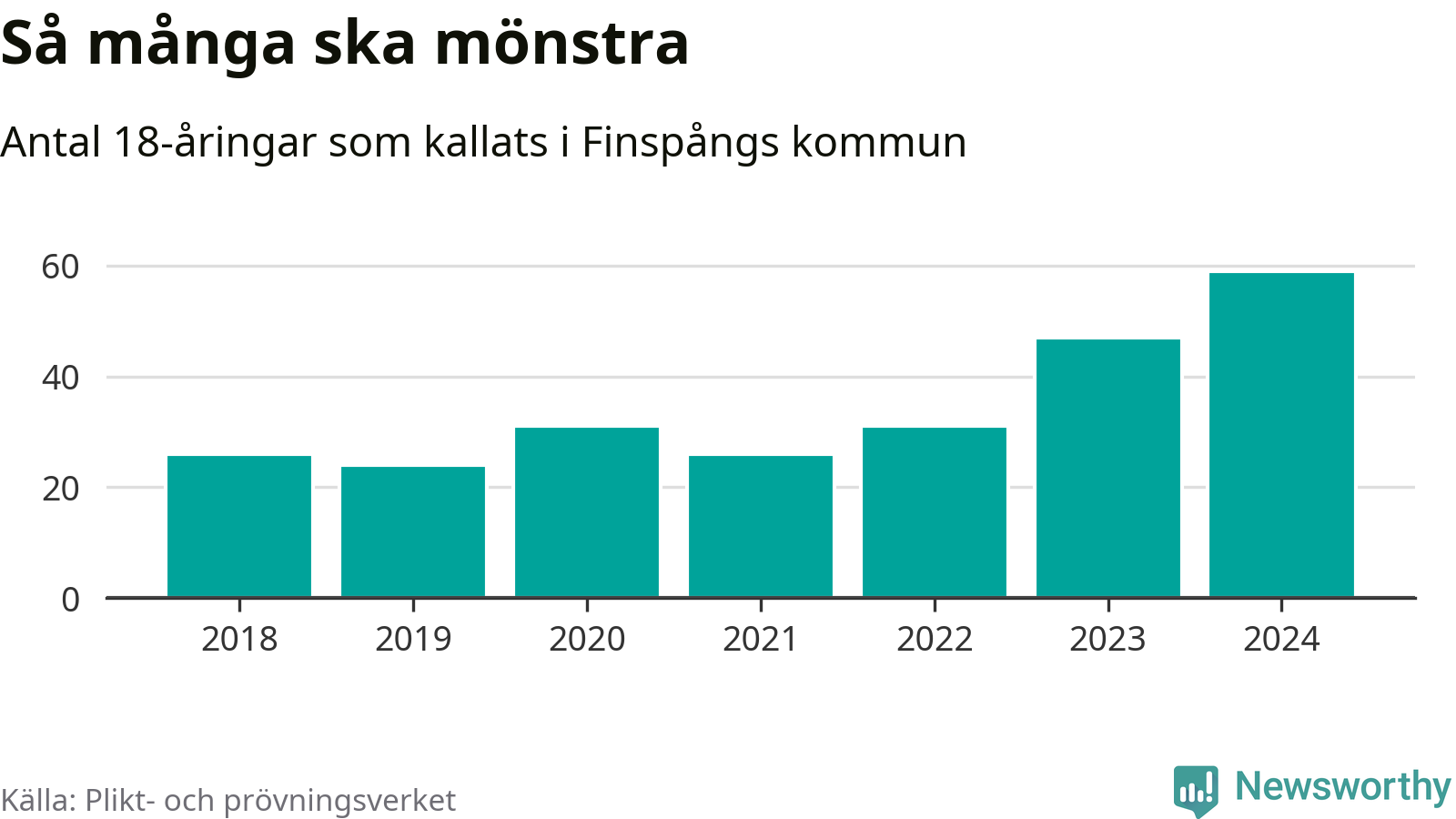 59 personer är det högsta antalet kallade i Finspång sedan 2018, som är första året med statistik på kommunnivå (värnplikten återinfördes 2017), och tolv mönstrande mer än 2023. 2018 kallades som jämförelse 26 artonåringar från Finspång till mönstring. Det motsvarade ungefär 10 procent av årskullen född år 2000. Totalt från Östergötlands län kallas 1 251 personer födda 2006 i år.