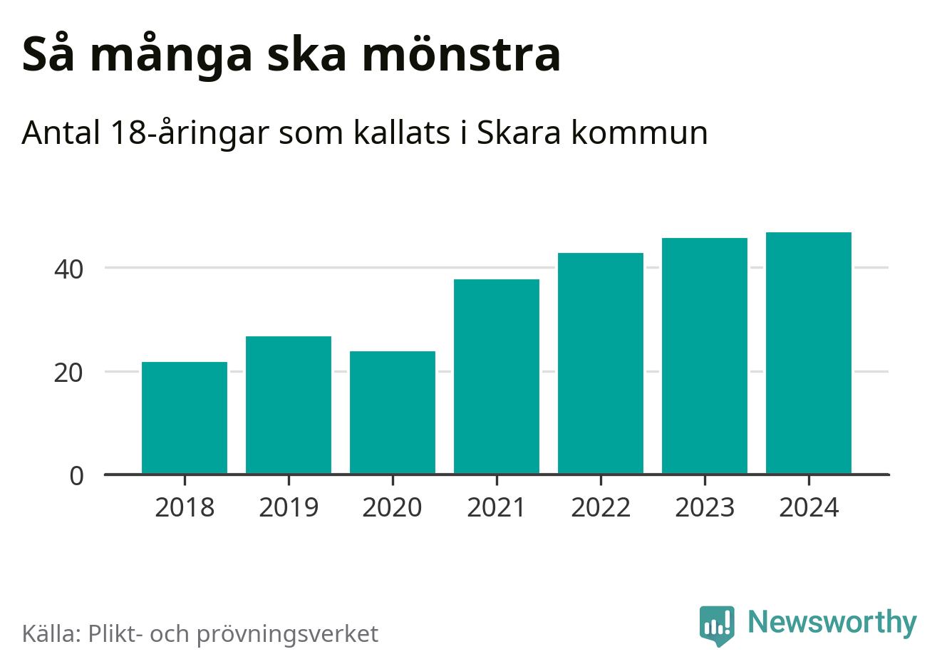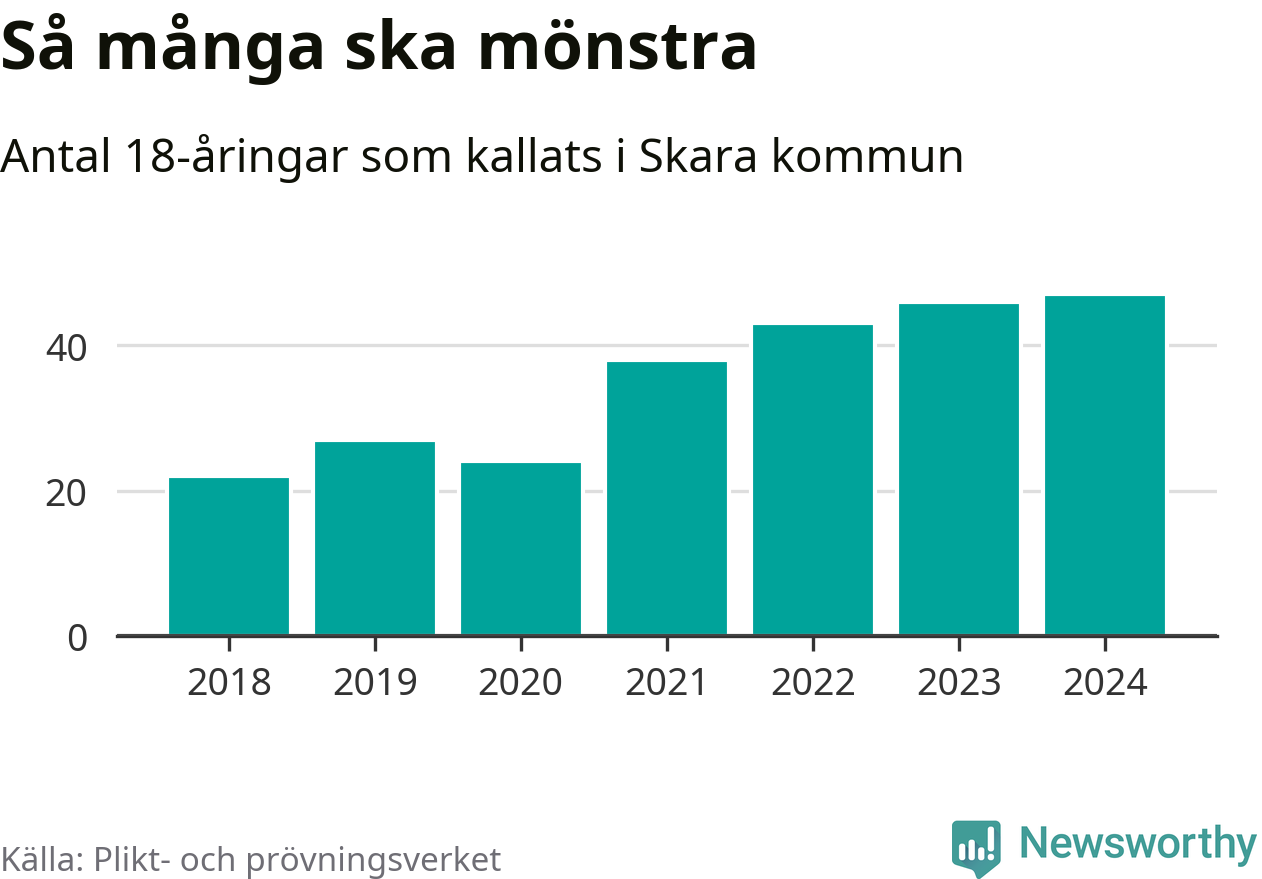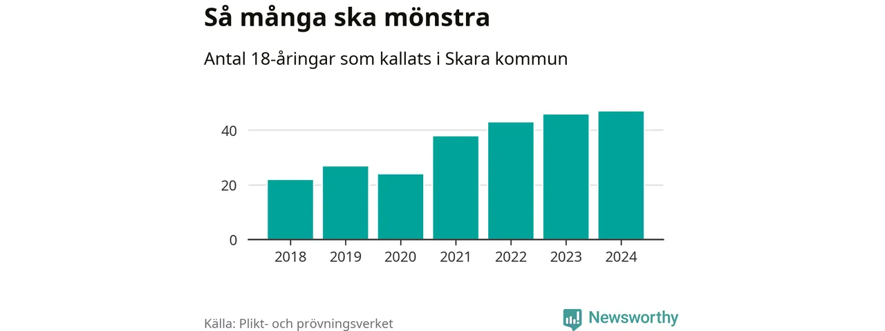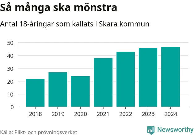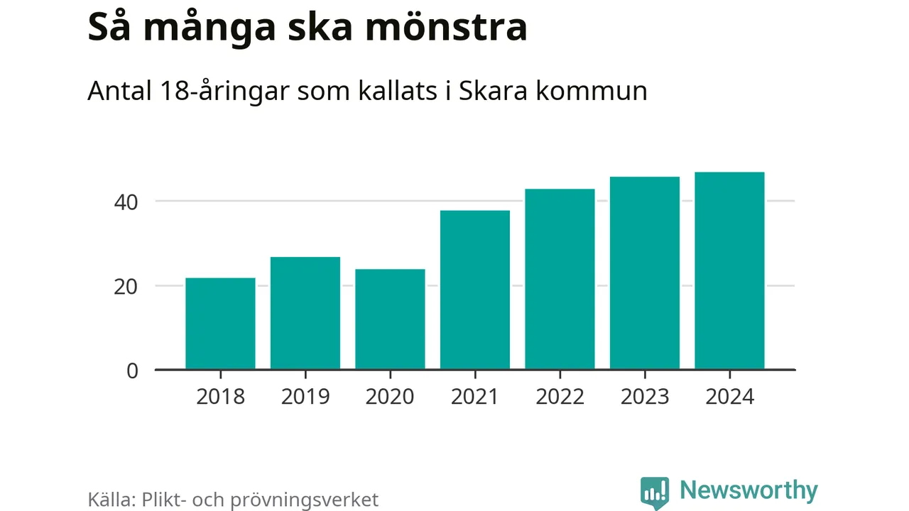 47 personer är det högsta antalet kallade i Skara sedan 2018, som är första året med statistik på kommunnivå (värnplikten återinfördes 2017), och en mönstrande mer än 2023. 2018 kallades som jämförelse 22 artonåringar från Skara till mönstring. Det motsvarade ungefär 10 procent av årskullen född år 2000. Totalt från Västra Götalands län kallas 4 562 personer födda 2006 i år.