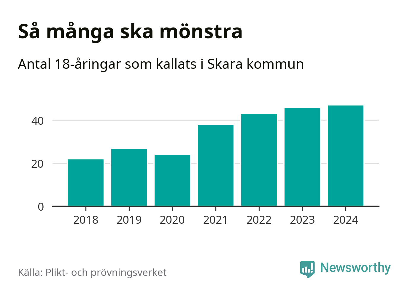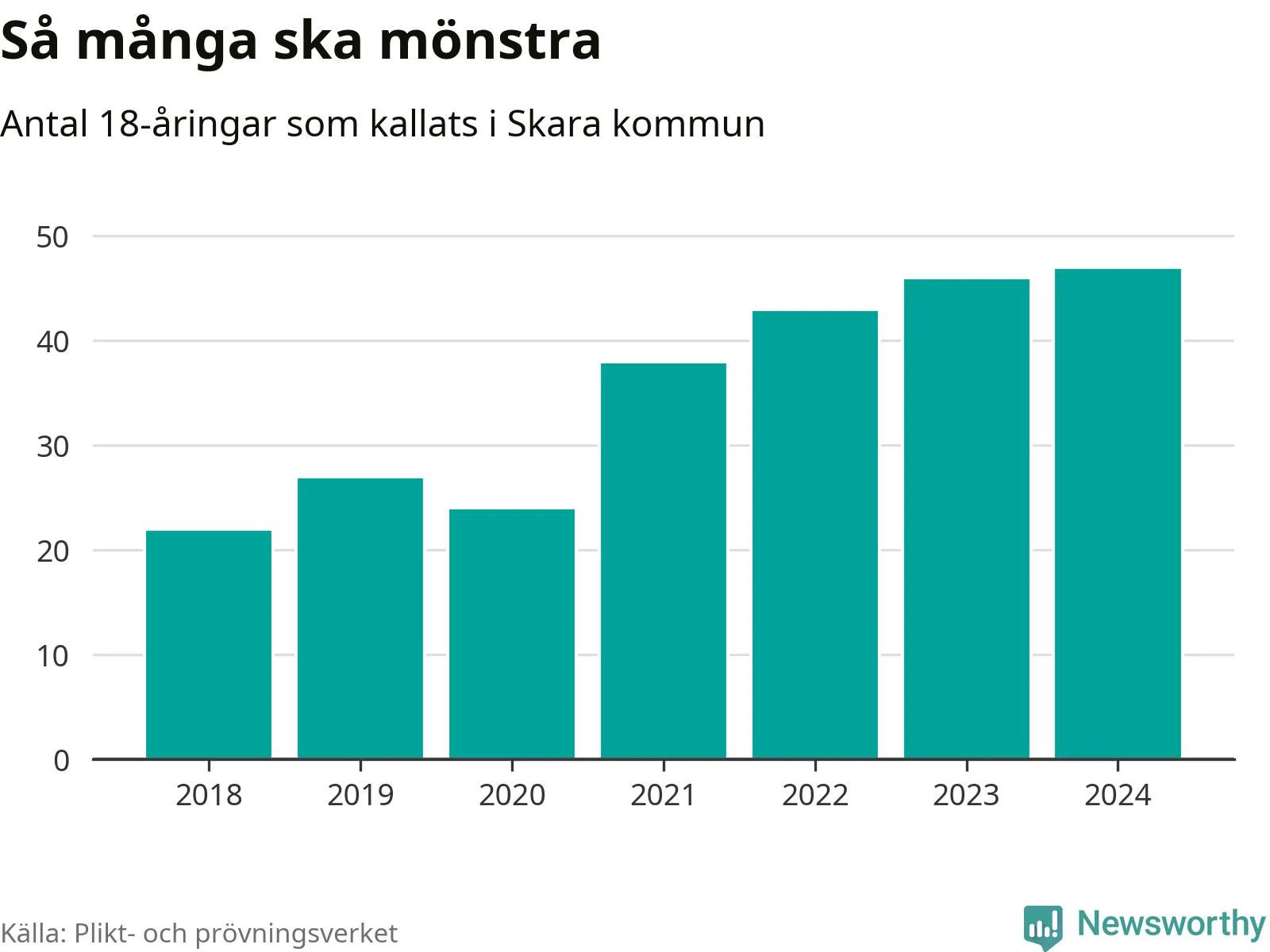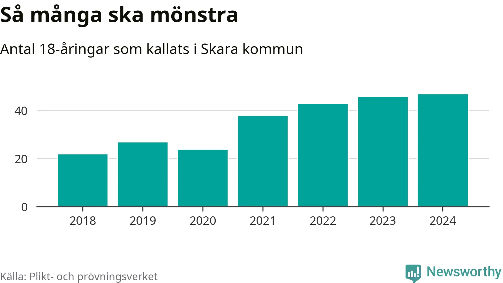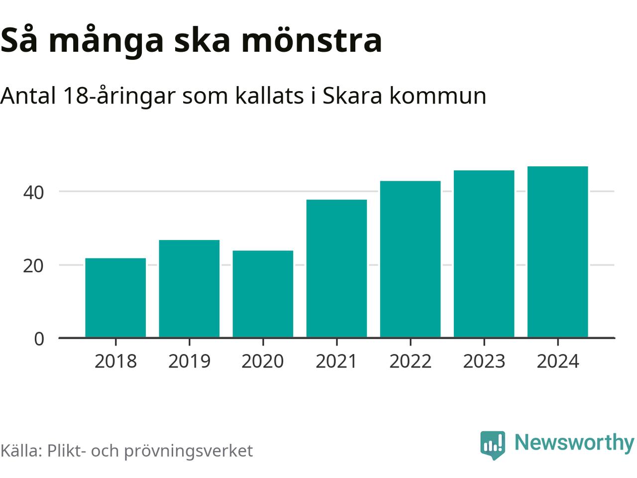 47 personer är det högsta antalet kallade i Skara sedan 2018, som är första året med statistik på kommunnivå (värnplikten återinfördes 2017), och en mönstrande mer än 2023. 2018 kallades som jämförelse 22 artonåringar från Skara till mönstring. Det motsvarade ungefär 10 procent av årskullen född år 2000. Totalt från Västra Götalands län kallas 4 562 personer födda 2006 i år.