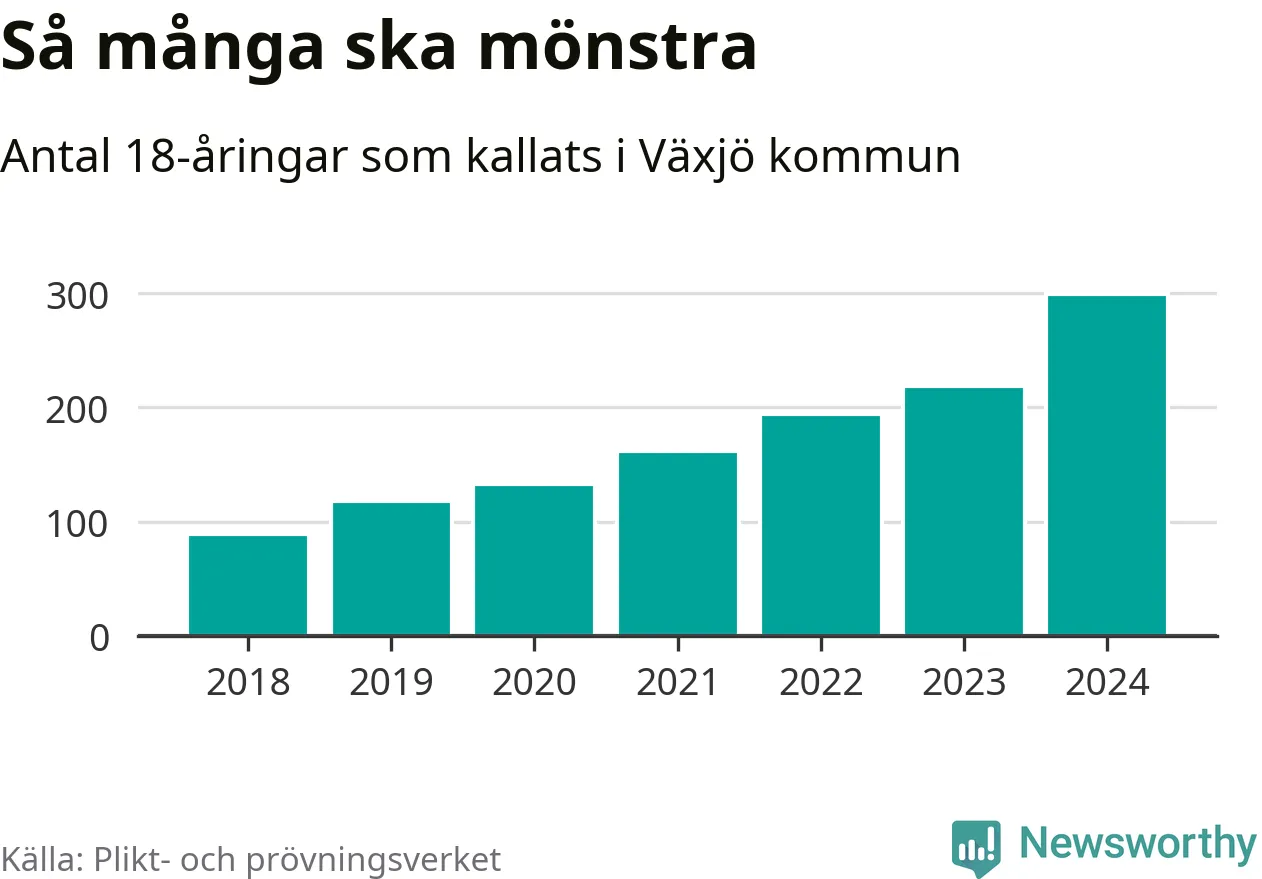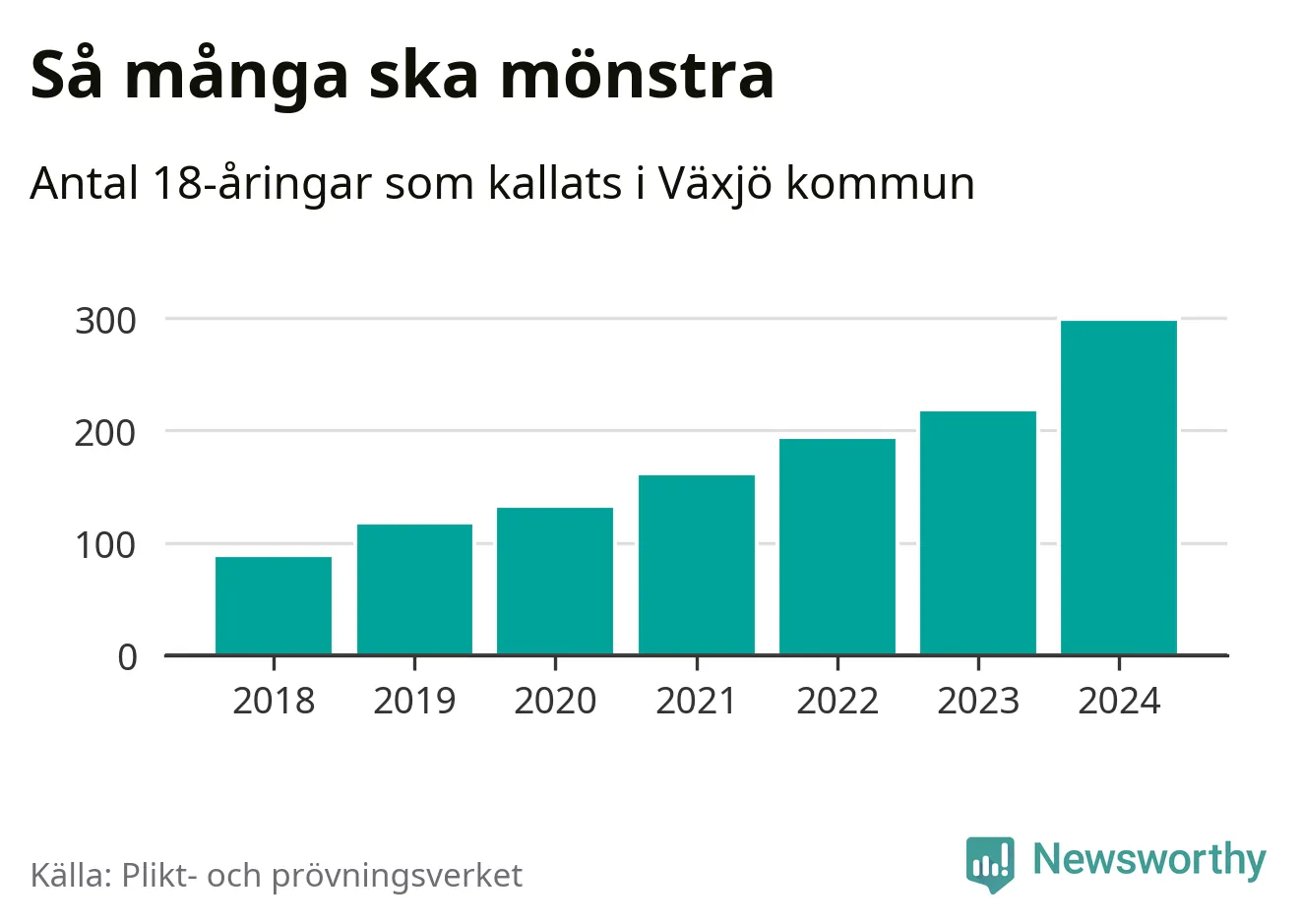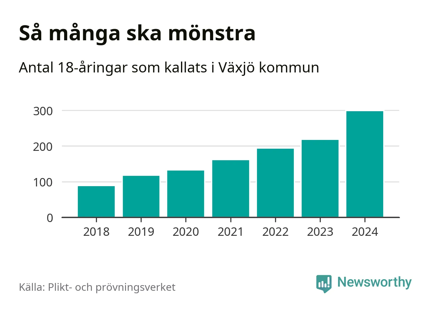 Antalet kallade i Växjö har ökat varje år sedan 2018, som är första året med statistik på kommunnivå (värnplikten återinfördes 2017), och jämfört med 2023 är det 80 fler i år. 2018 kallades som jämförelse 89 artonåringar från Växjö till mönstring. Det motsvarade ungefär 9 procent av årskullen född år 2000. Totalt från Kronobergs län kallas 583 personer födda 2006 i år.