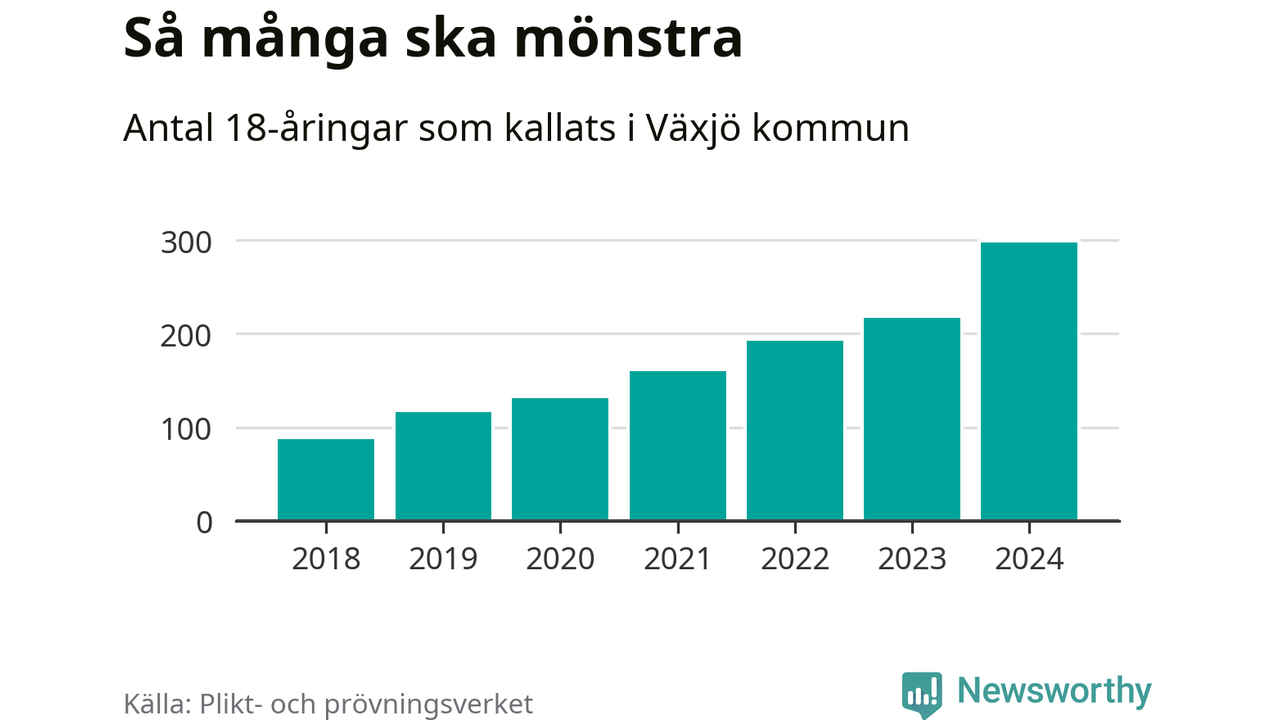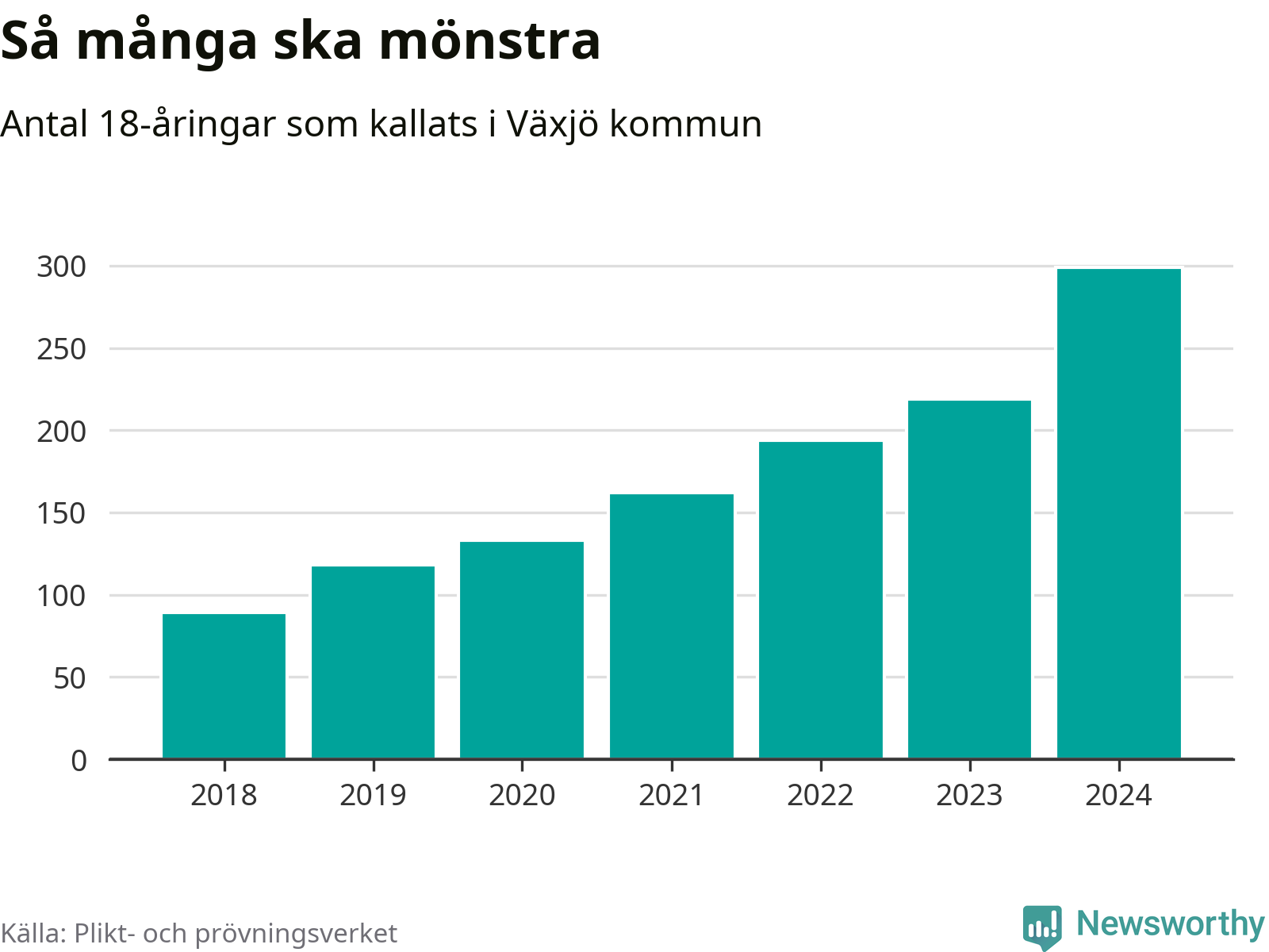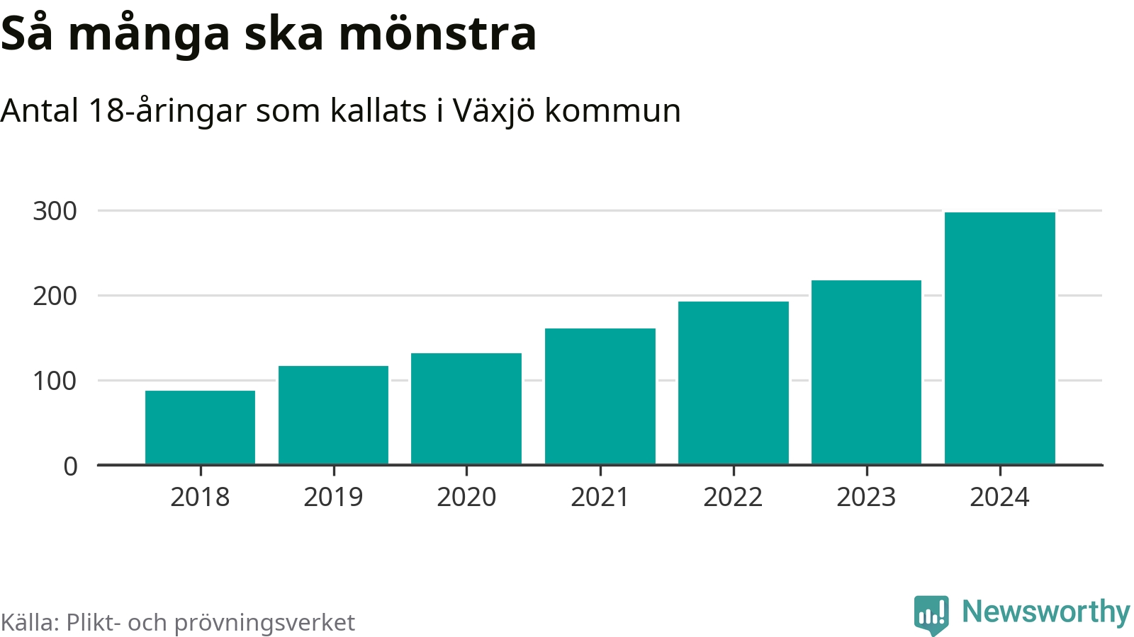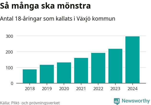 Antalet kallade i Växjö har ökat varje år sedan 2018, som är första året med statistik på kommunnivå (värnplikten återinfördes 2017), och jämfört med 2023 är det 80 fler i år. 2018 kallades som jämförelse 89 artonåringar från Växjö till mönstring. Det motsvarade ungefär 9 procent av årskullen född år 2000. Totalt från Kronobergs län kallas 583 personer födda 2006 i år.