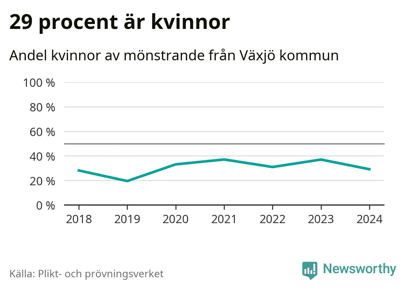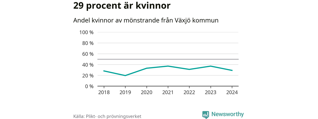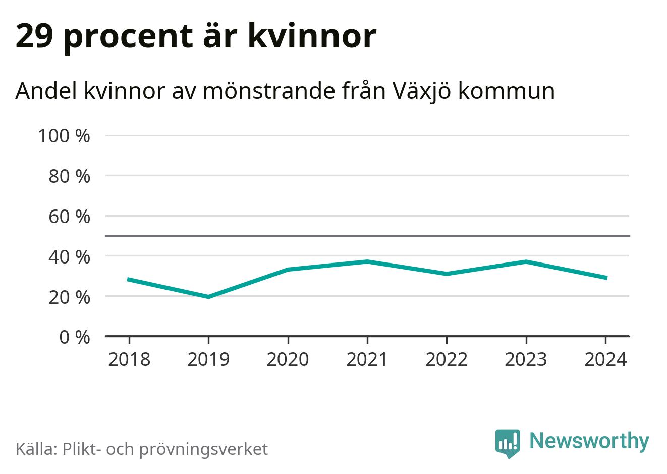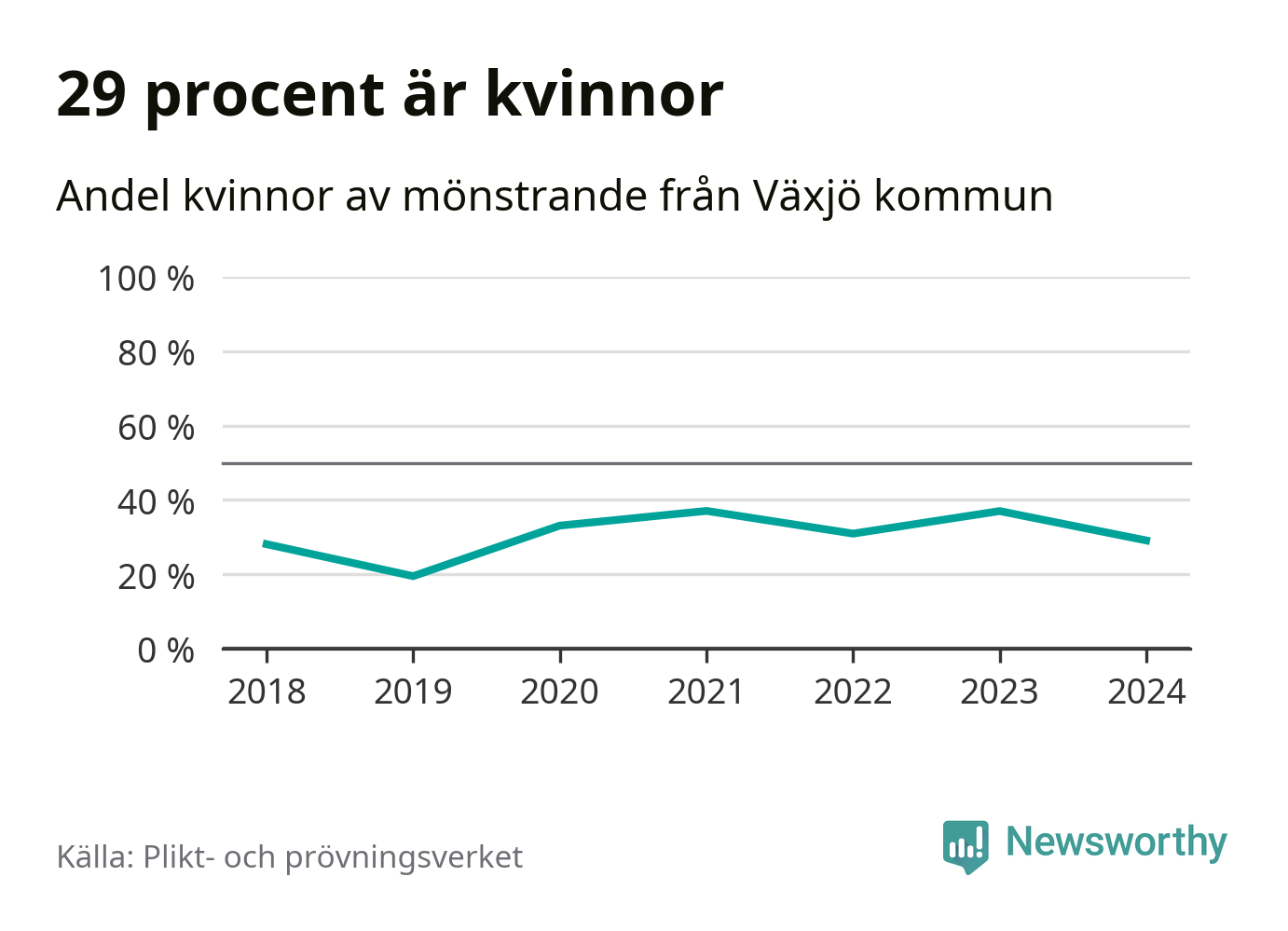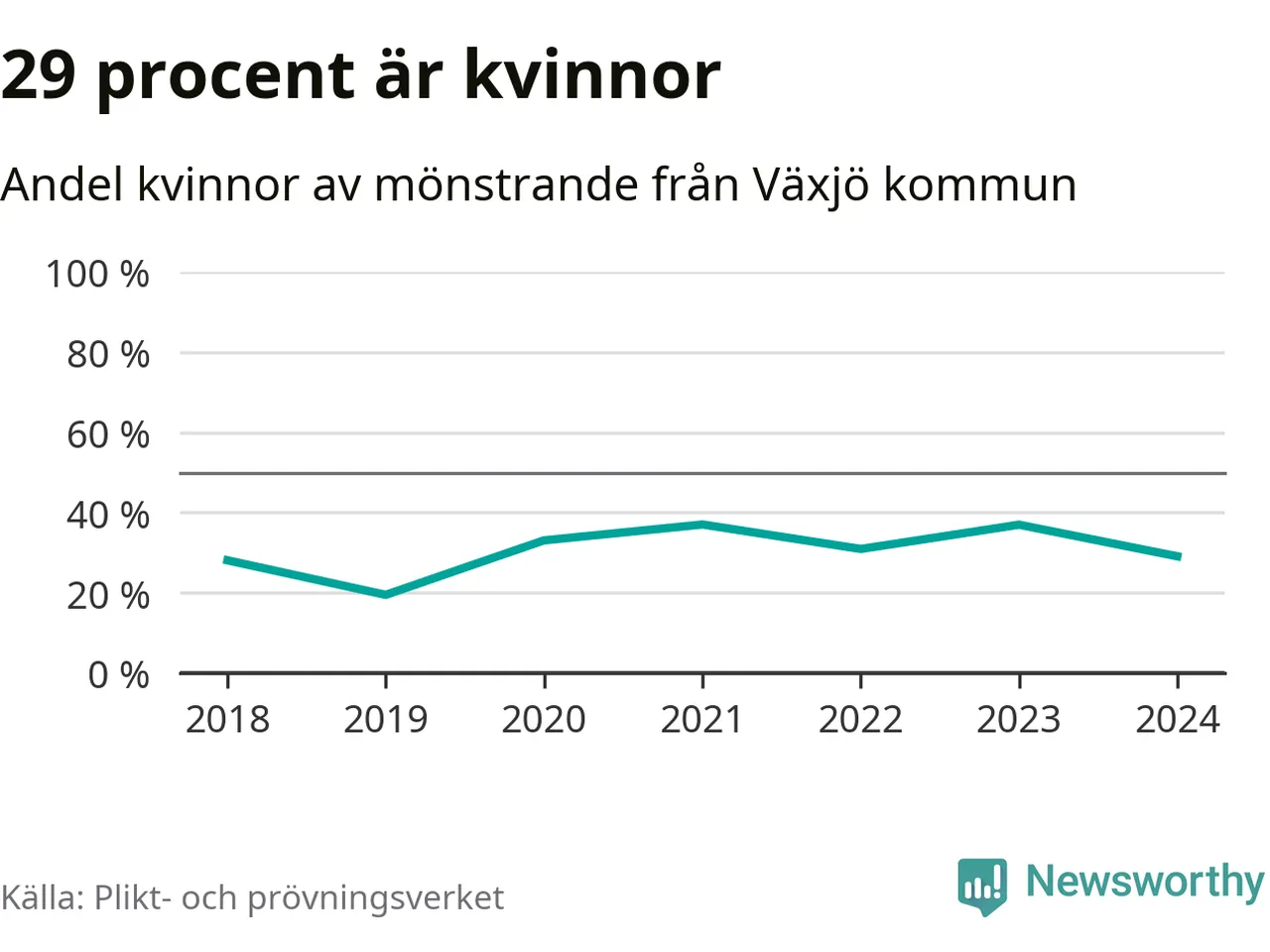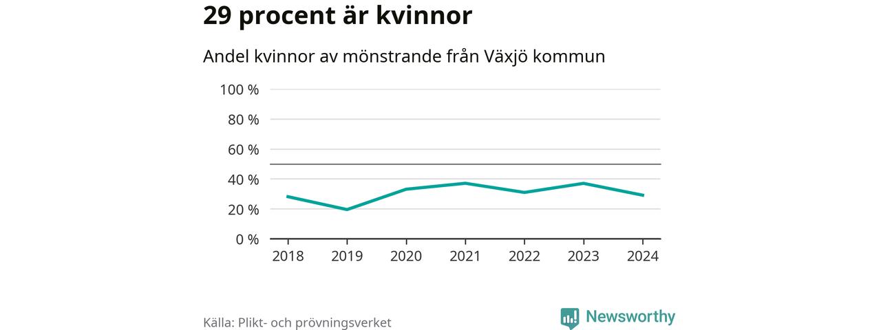 87 av de som kallats till mönstring från Växjö är kvinnor, vilket motsvarar 29 procent av de mönstrande. I absoluta tal är det fler kvinnor än något år sedan värnplikten återinfördes, men 2021 var en större andel av de mönstrande från kommunen kvinnor (37 procent). I riket som helhet är 30 procent av de mönstrande tjejer.
