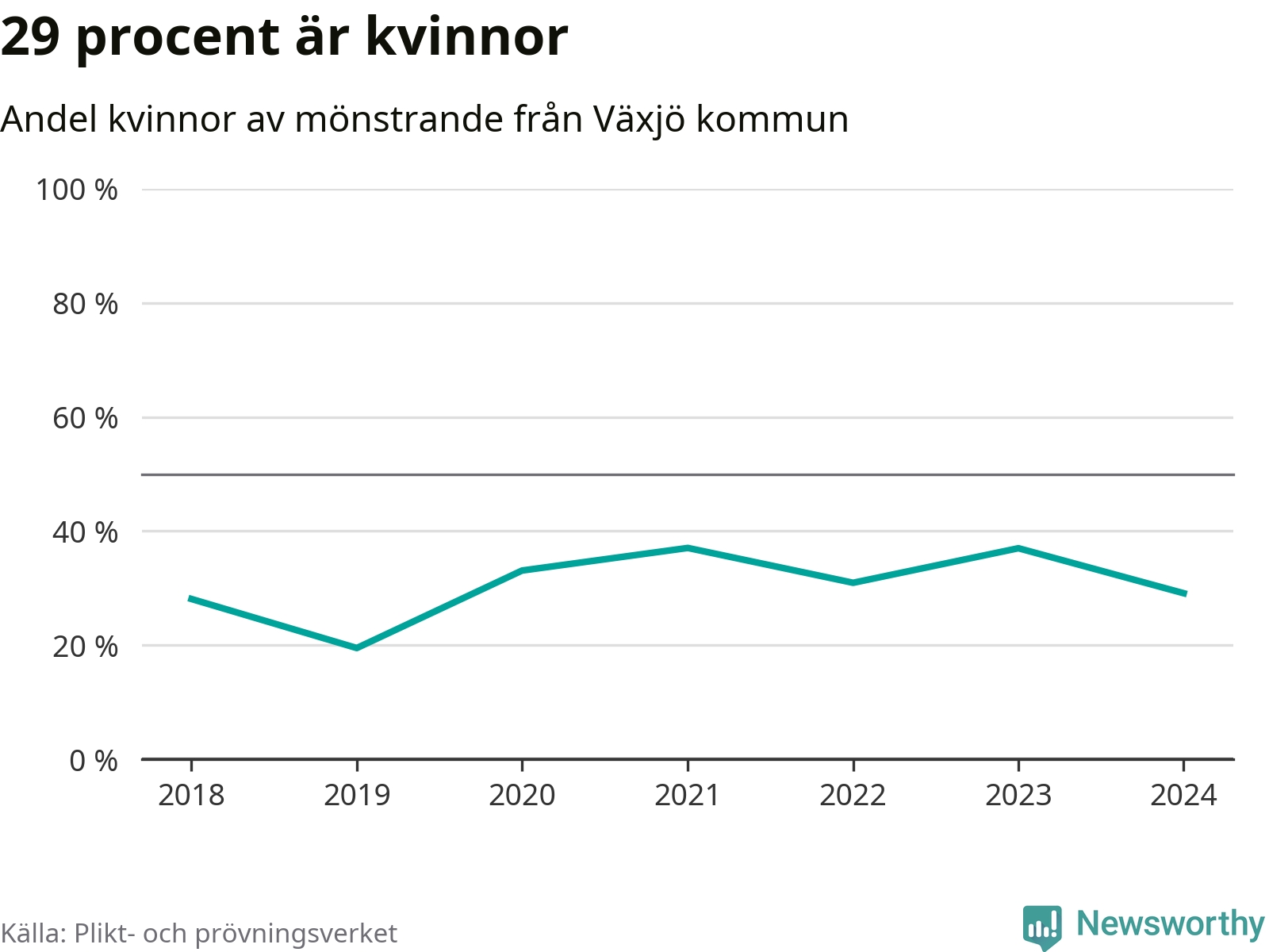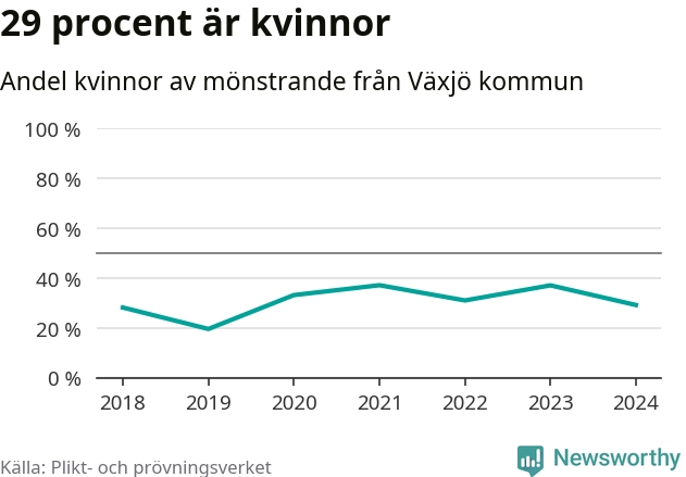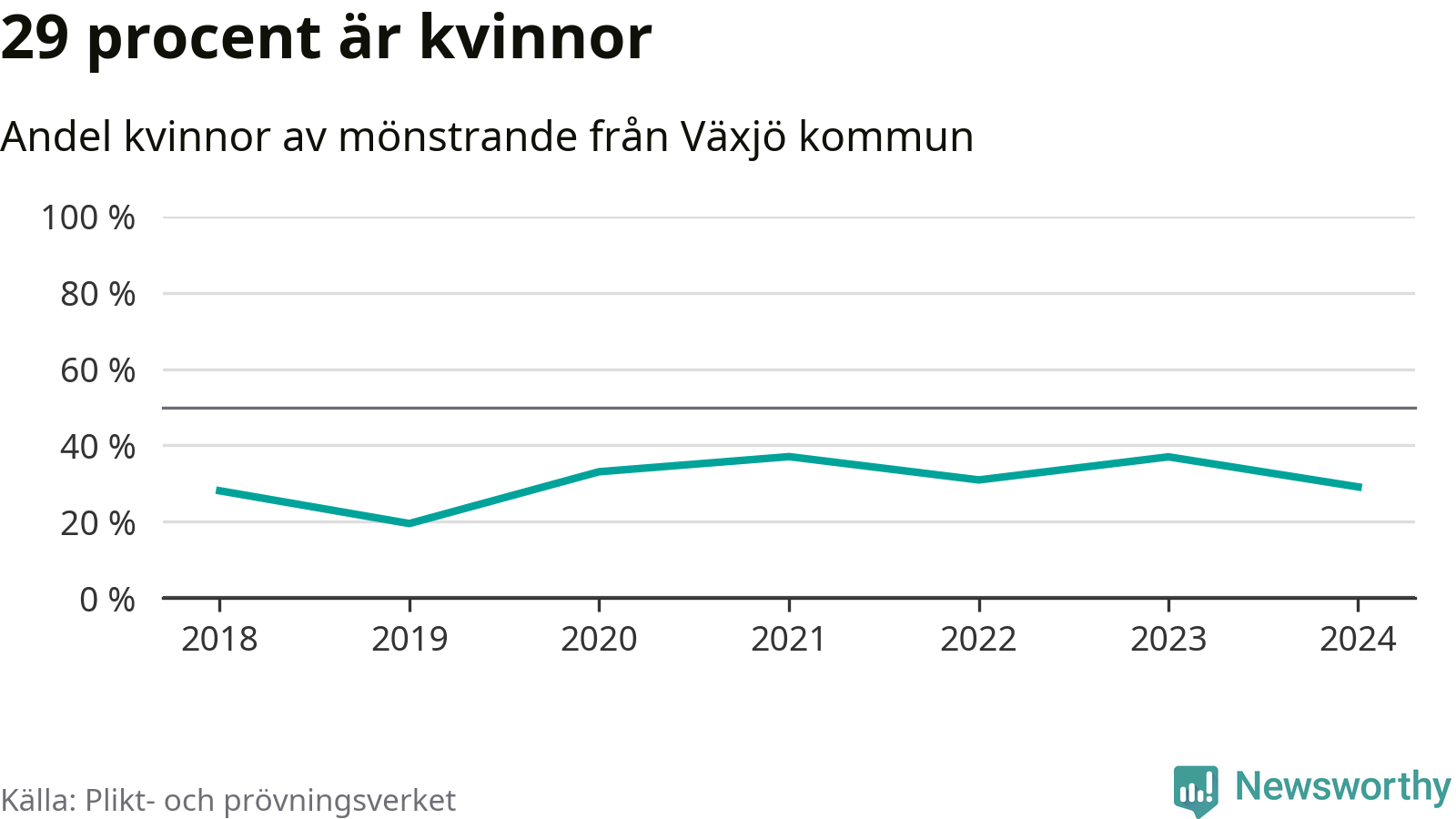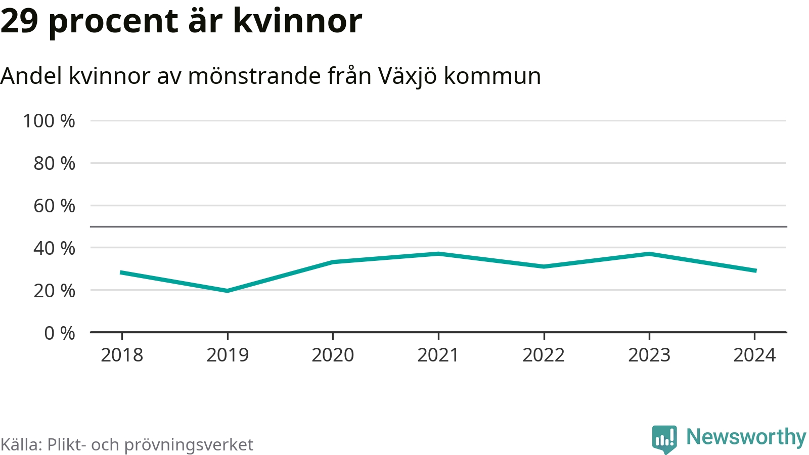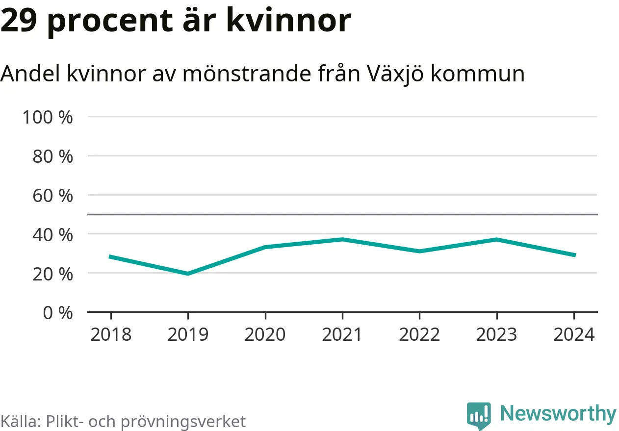 87 av de som kallats till mönstring från Växjö är kvinnor, vilket motsvarar 29 procent av de mönstrande. I absoluta tal är det fler kvinnor än något år sedan värnplikten återinfördes, men 2021 var en större andel av de mönstrande från kommunen kvinnor (37 procent). I riket som helhet är 30 procent av de mönstrande tjejer.