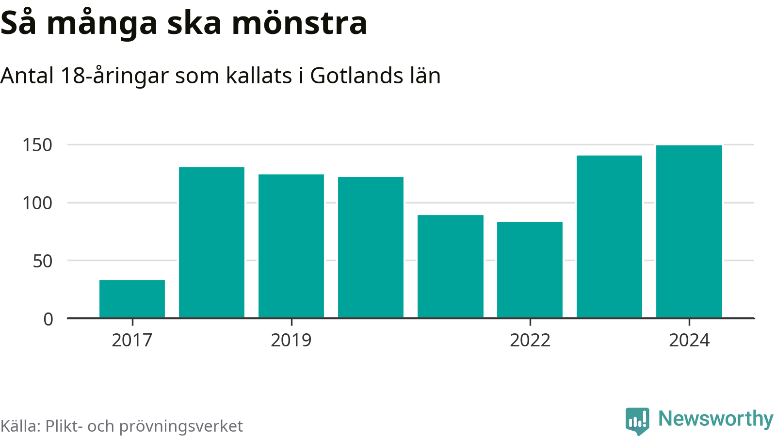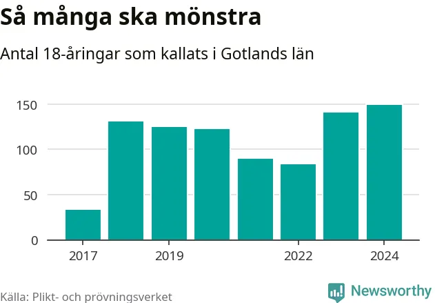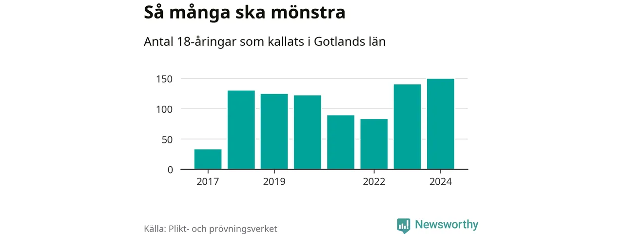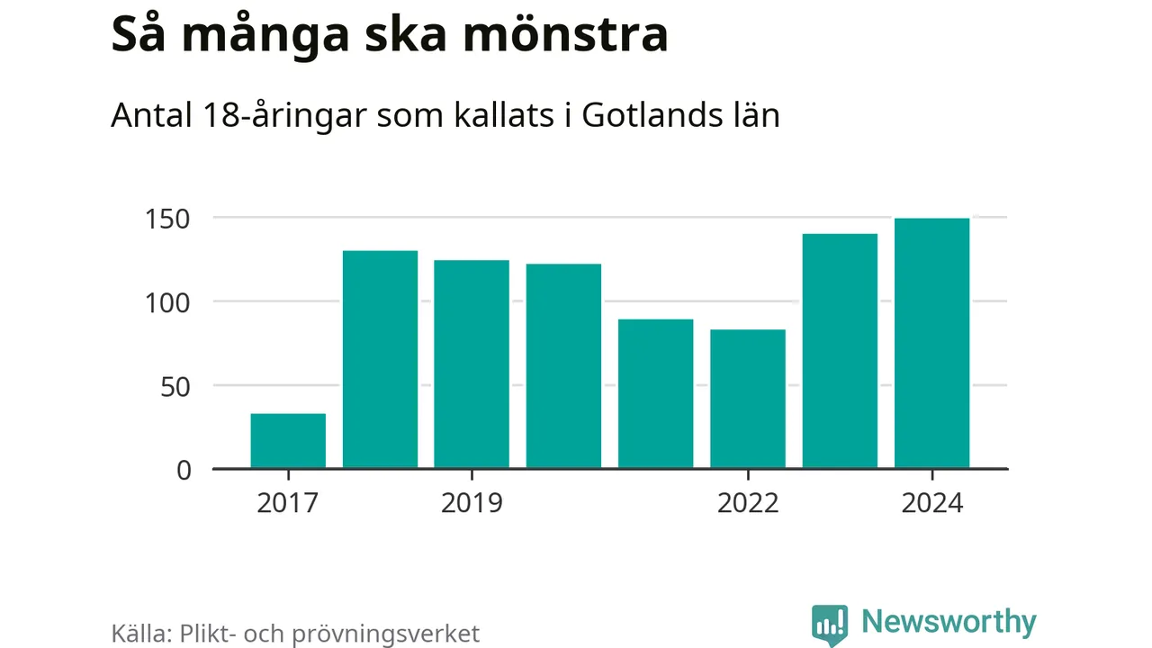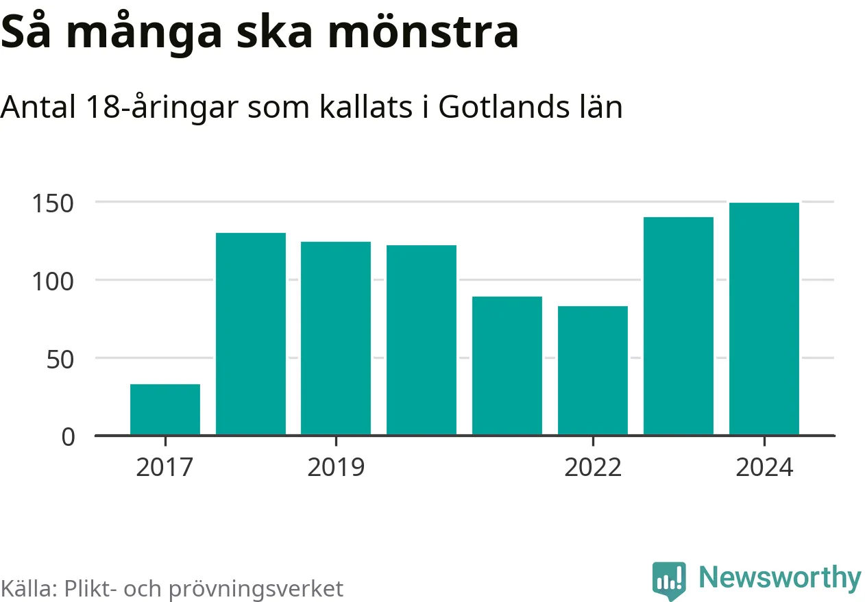 150 personer är det högsta antalet kallade på Gotland sedan värnplikten infördes 2017 och nio mönstrande mer än 2023. 2017 kallades som jämförelse 34 artonåringar från Gotland till mönstring. Det motsvarade ungefär 6 procent av årskullen född år 1999.