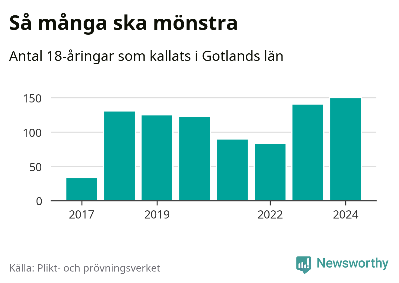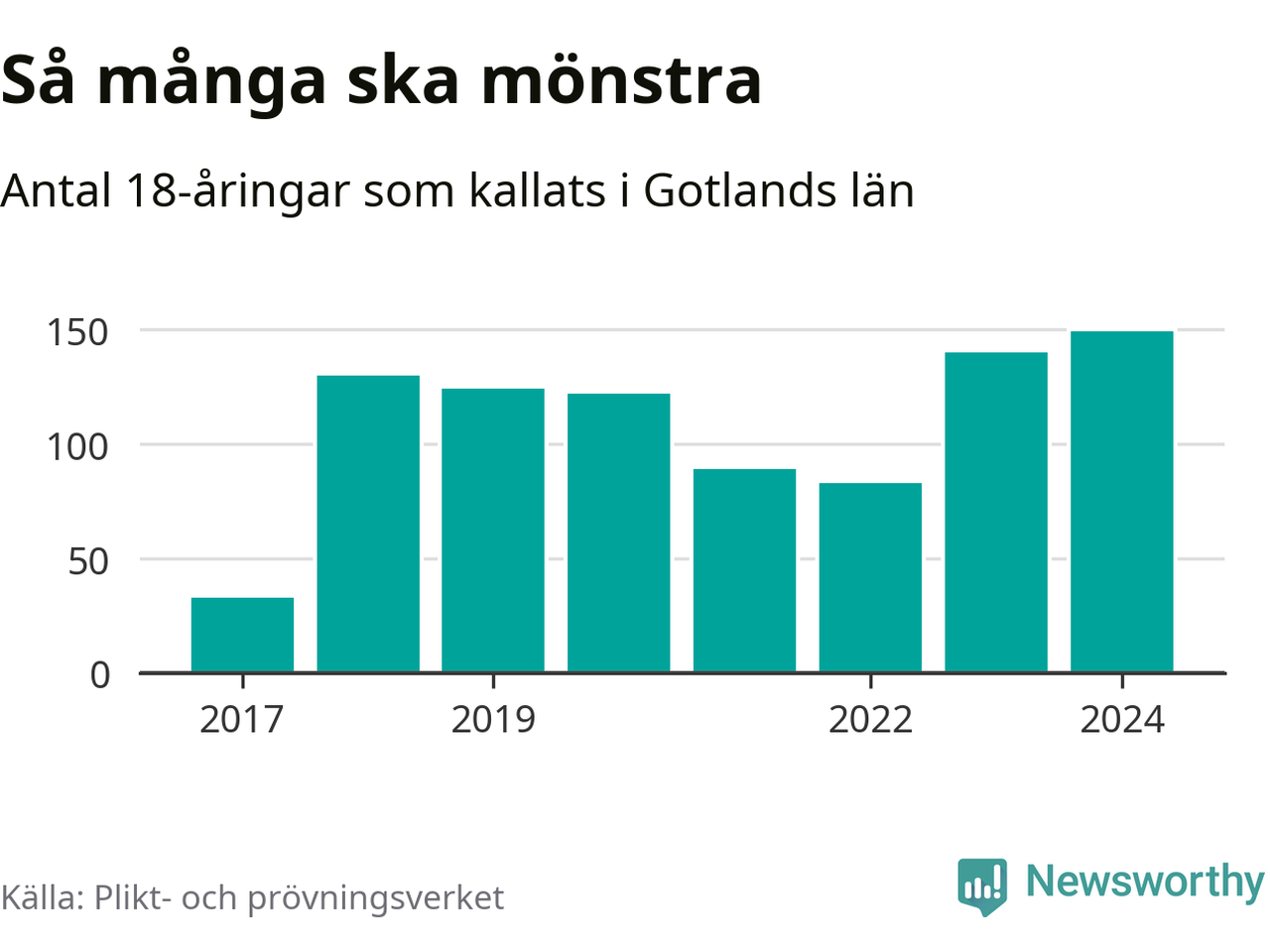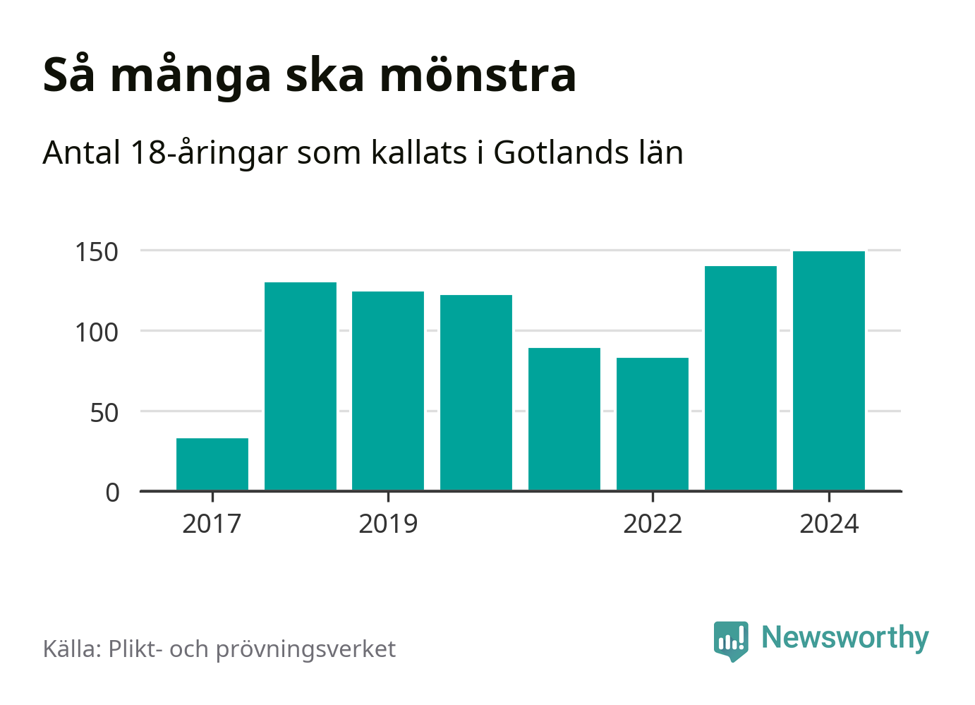 150 personer är det högsta antalet kallade på Gotland sedan värnplikten infördes 2017 och nio mönstrande mer än 2023. 2017 kallades som jämförelse 34 artonåringar från Gotland till mönstring. Det motsvarade ungefär 6 procent av årskullen född år 1999.