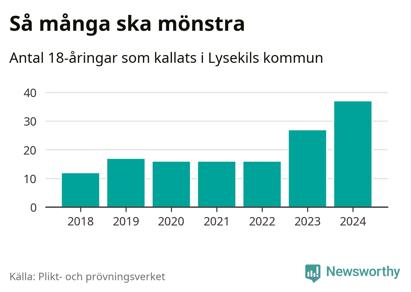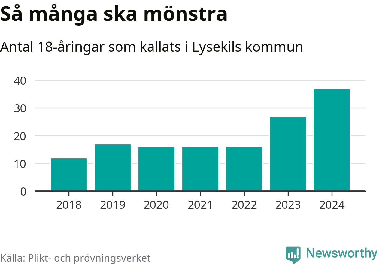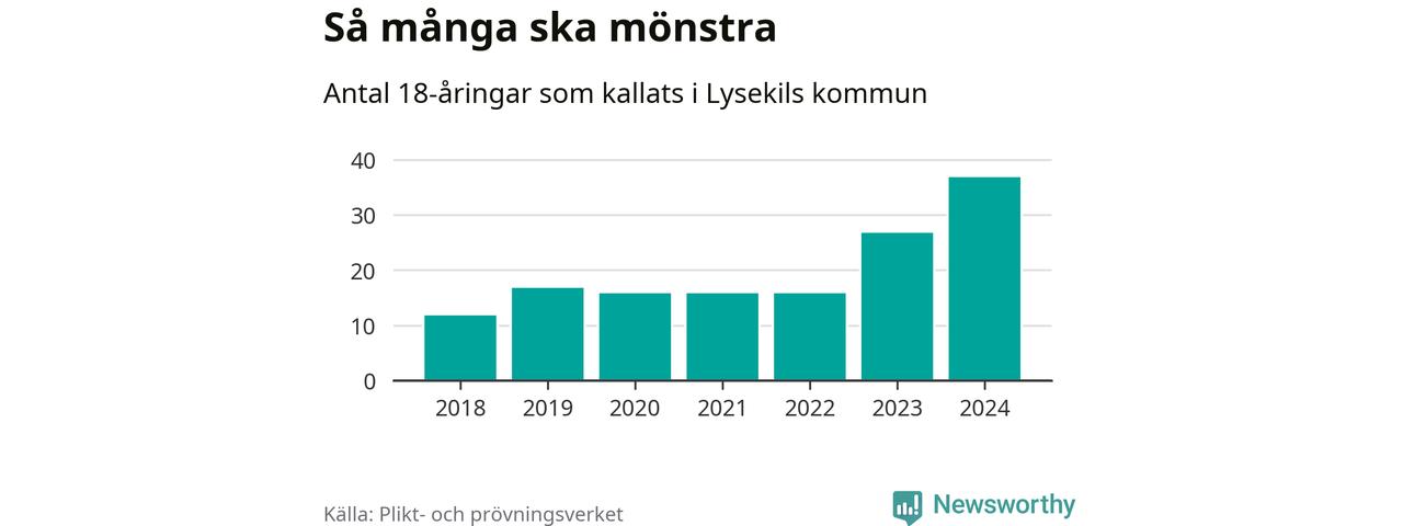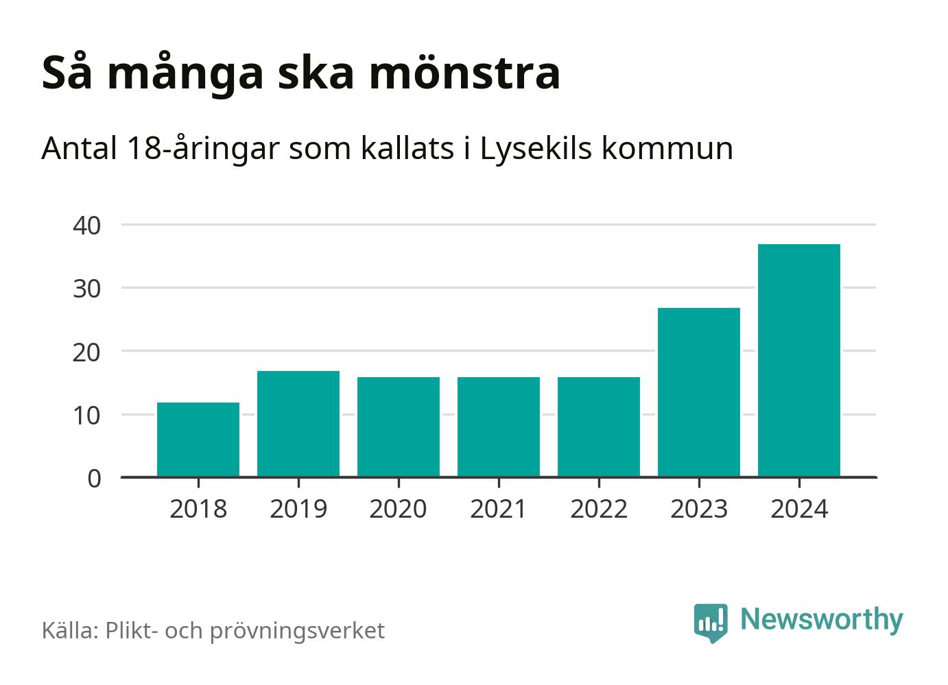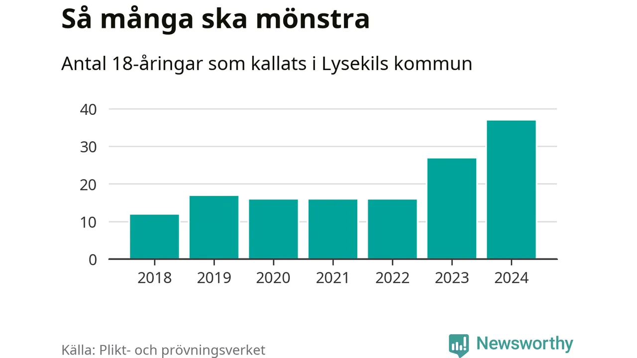 37 personer är det högsta antalet kallade i Lysekil sedan 2018, som är första året med statistik på kommunnivå (värnplikten återinfördes 2017), och tio mönstrande mer än 2023. 2018 kallades som jämförelse tolv 18-åringar från Lysekil till mönstring. Det motsvarade ungefär 8 procent av årskullen född år 2000. Totalt från Västra Götalands län kallas 4 562 personer födda 2006 i år.