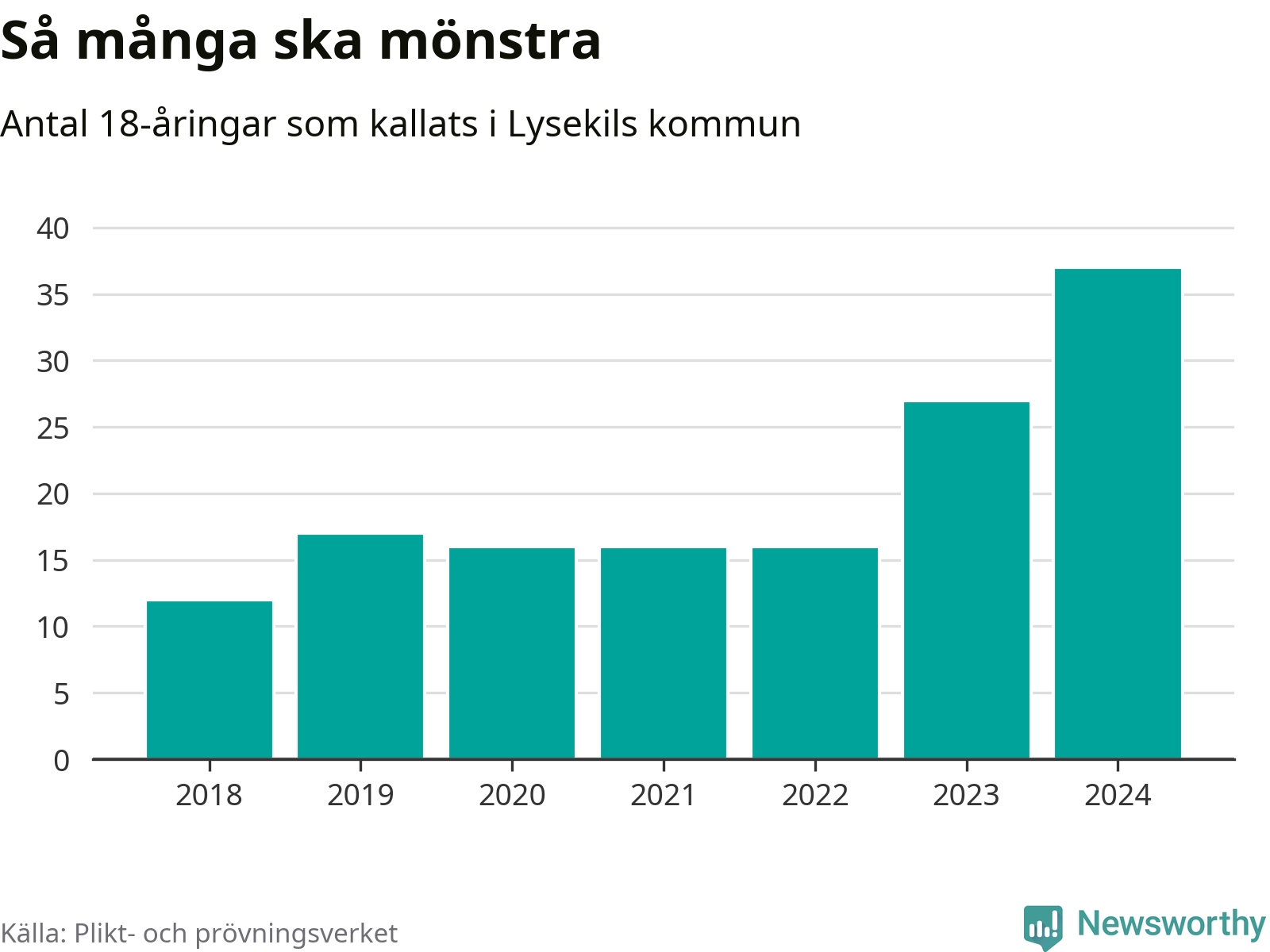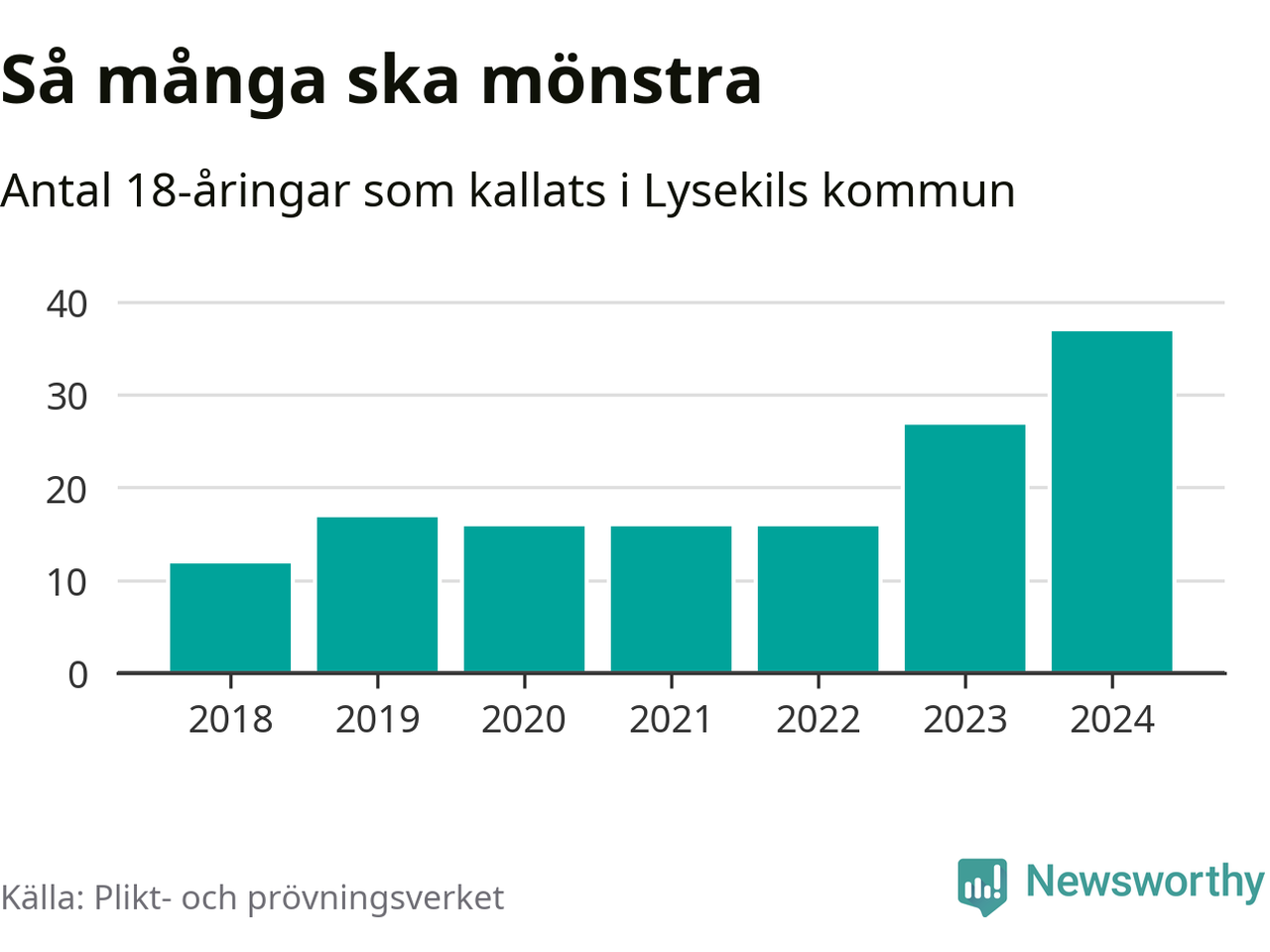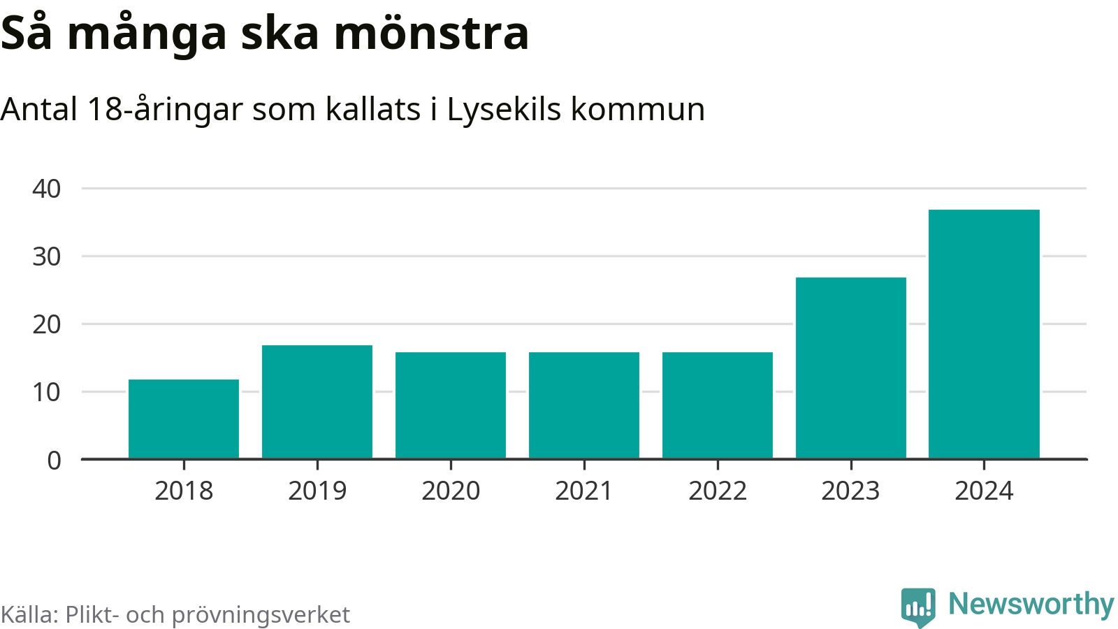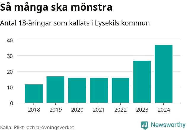 37 personer är det högsta antalet kallade i Lysekil sedan 2018, som är första året med statistik på kommunnivå (värnplikten återinfördes 2017), och tio mönstrande mer än 2023. 2018 kallades som jämförelse tolv 18-åringar från Lysekil till mönstring. Det motsvarade ungefär 8 procent av årskullen född år 2000. Totalt från Västra Götalands län kallas 4 562 personer födda 2006 i år.