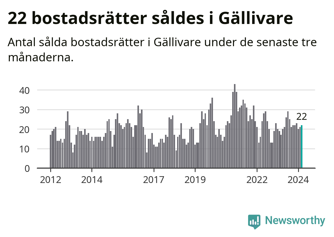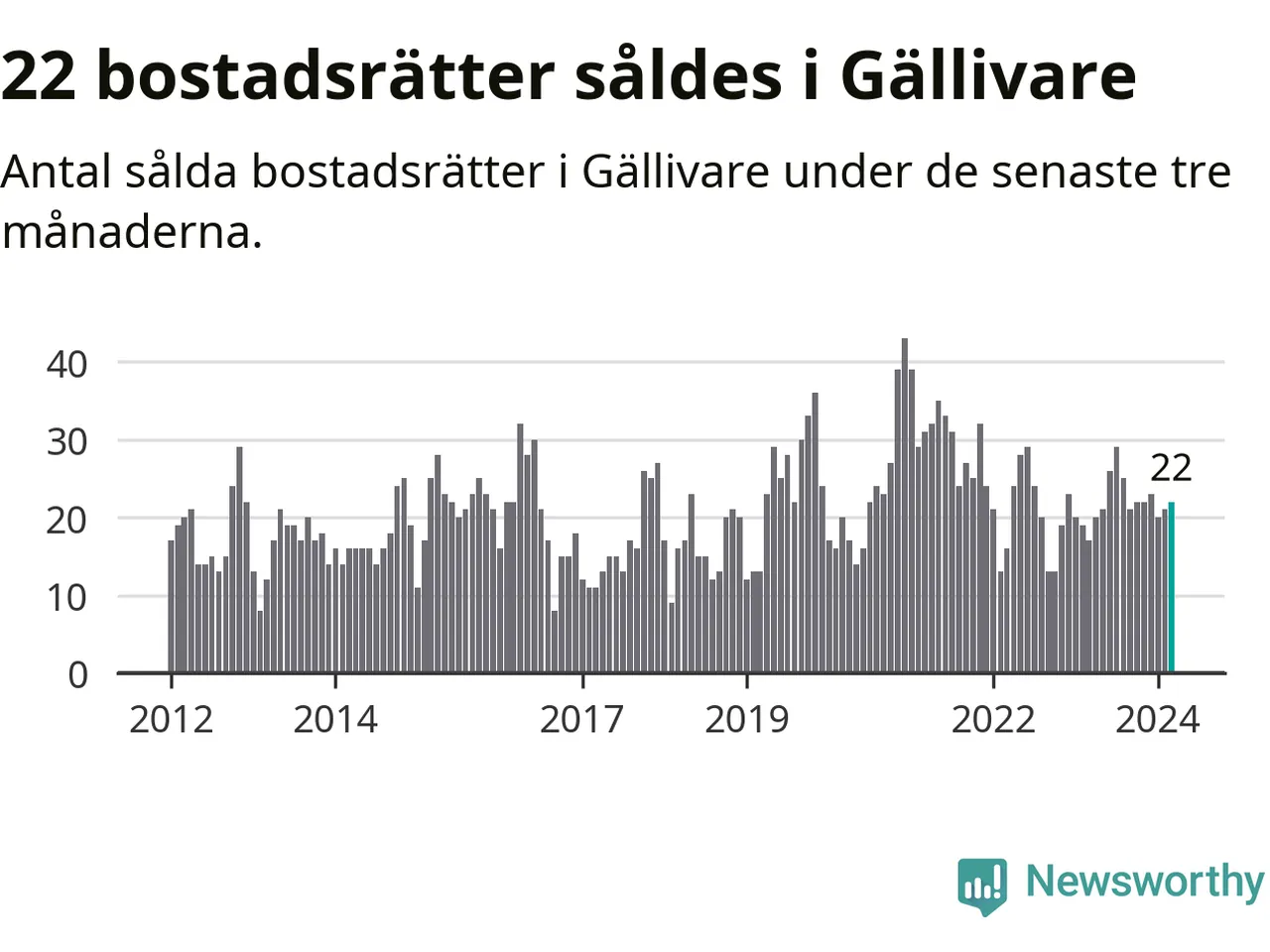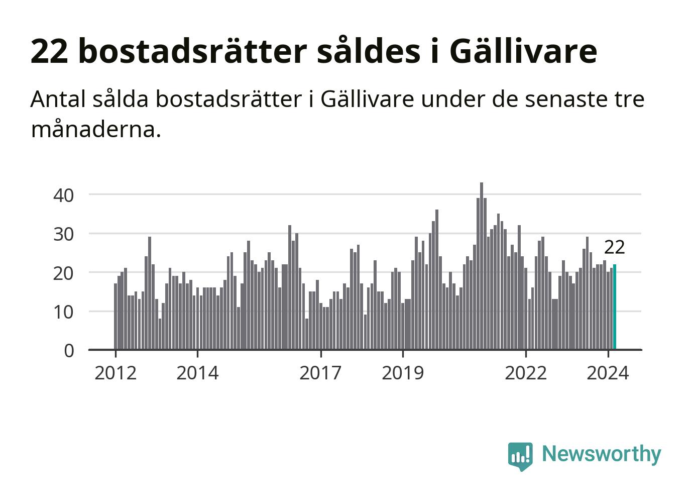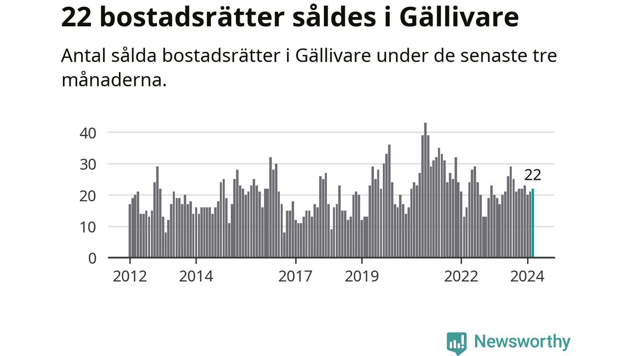 Mellan januari och mars gjordes sammanlagt 22 affärer med bostadsrätter i Gällivare kommun. Det kan jämföras med 17 vid motsvarande tid i fjol.