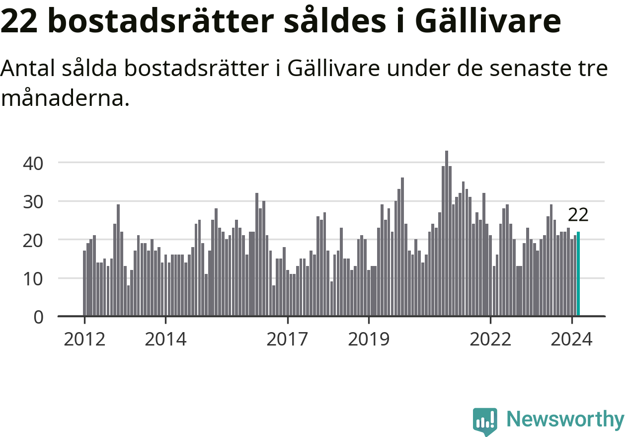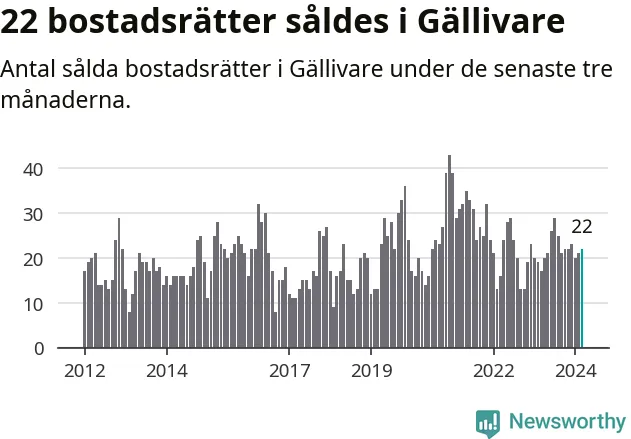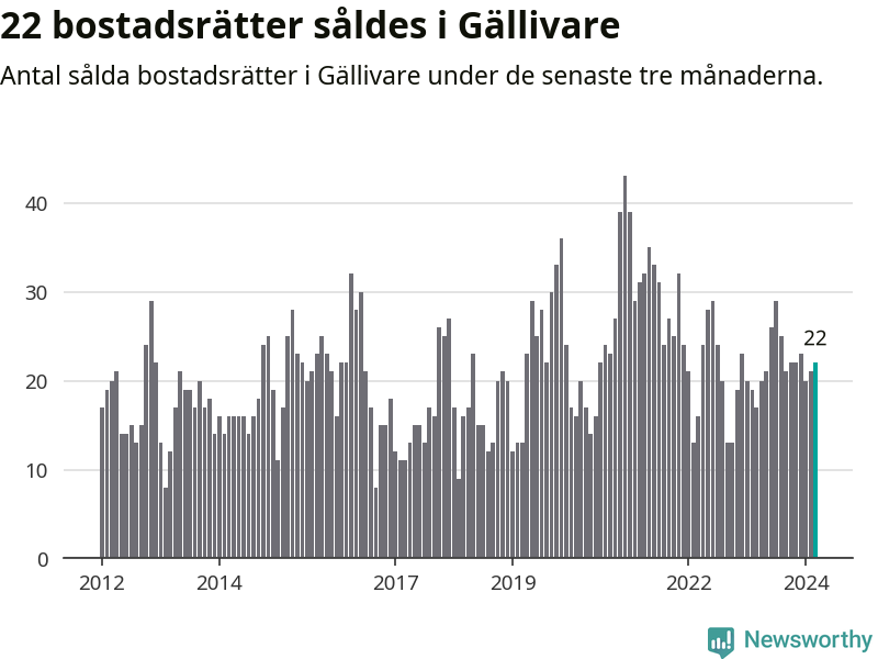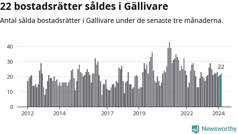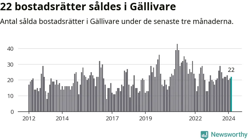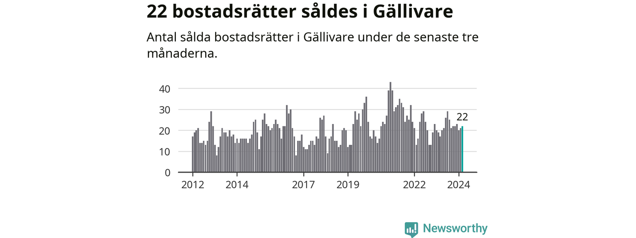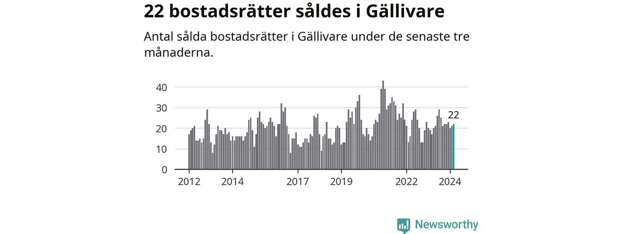 Mellan januari och mars gjordes sammanlagt 22 affärer med bostadsrätter i Gällivare kommun. Det kan jämföras med 17 vid motsvarande tid i fjol.