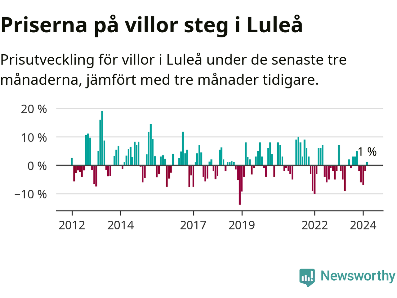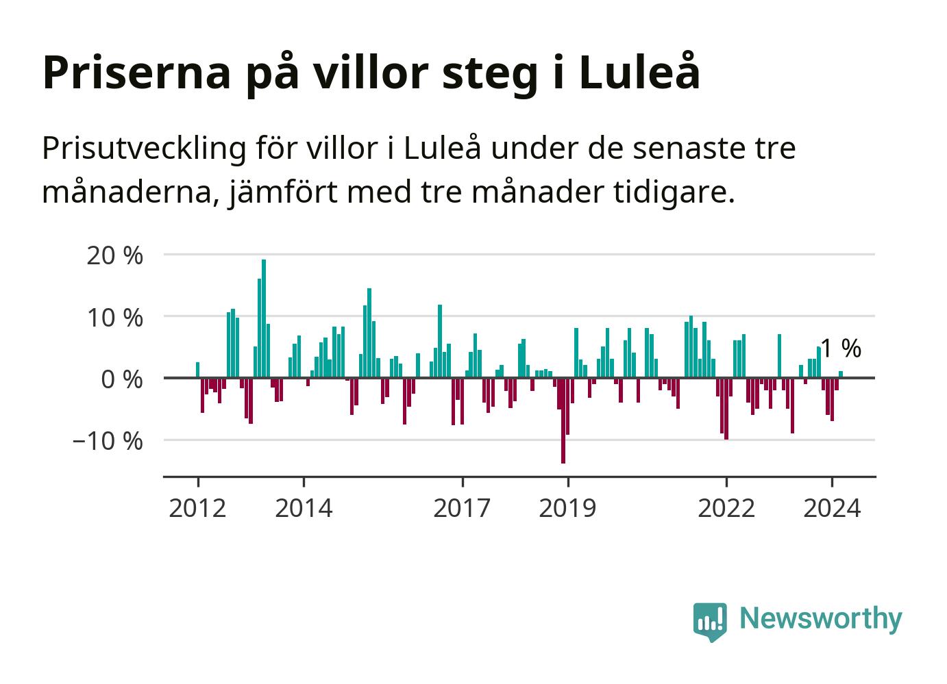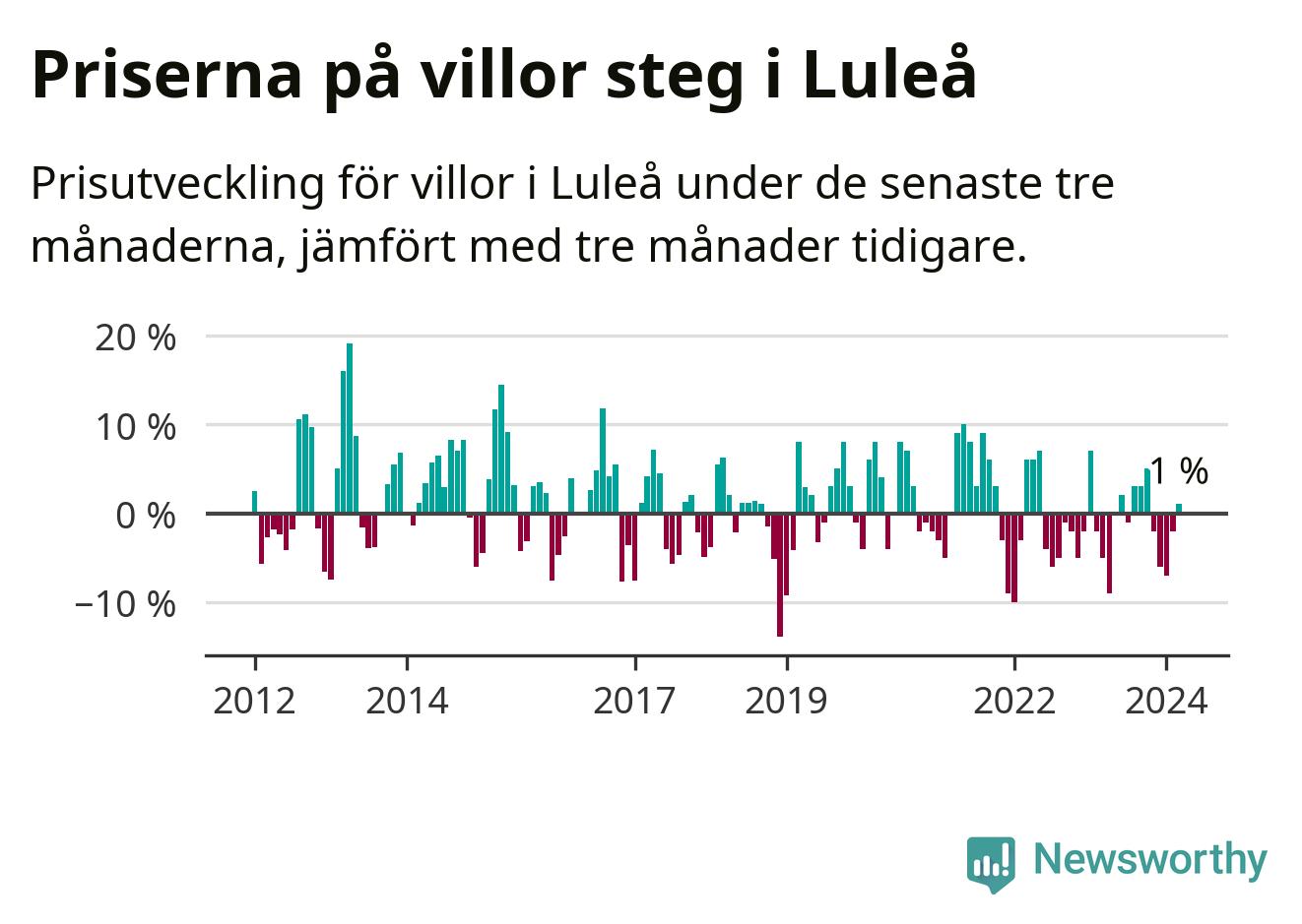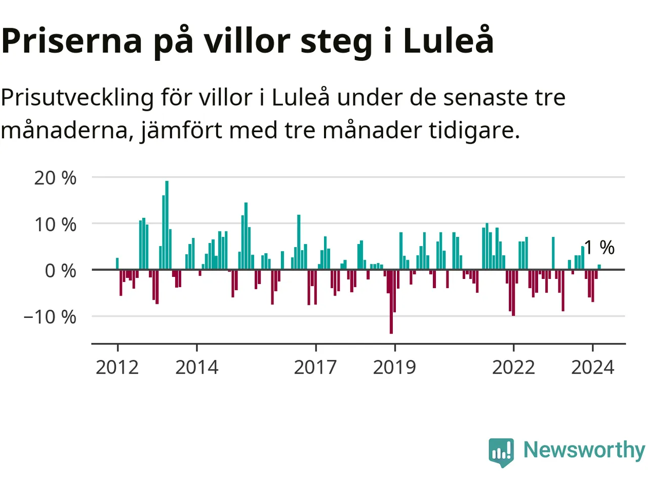 Villapriserna har gått upp i Luleå kommun. Medelpriset på försäljningarna under de senaste tre månaderna visar på en uppgång med 1 procent.