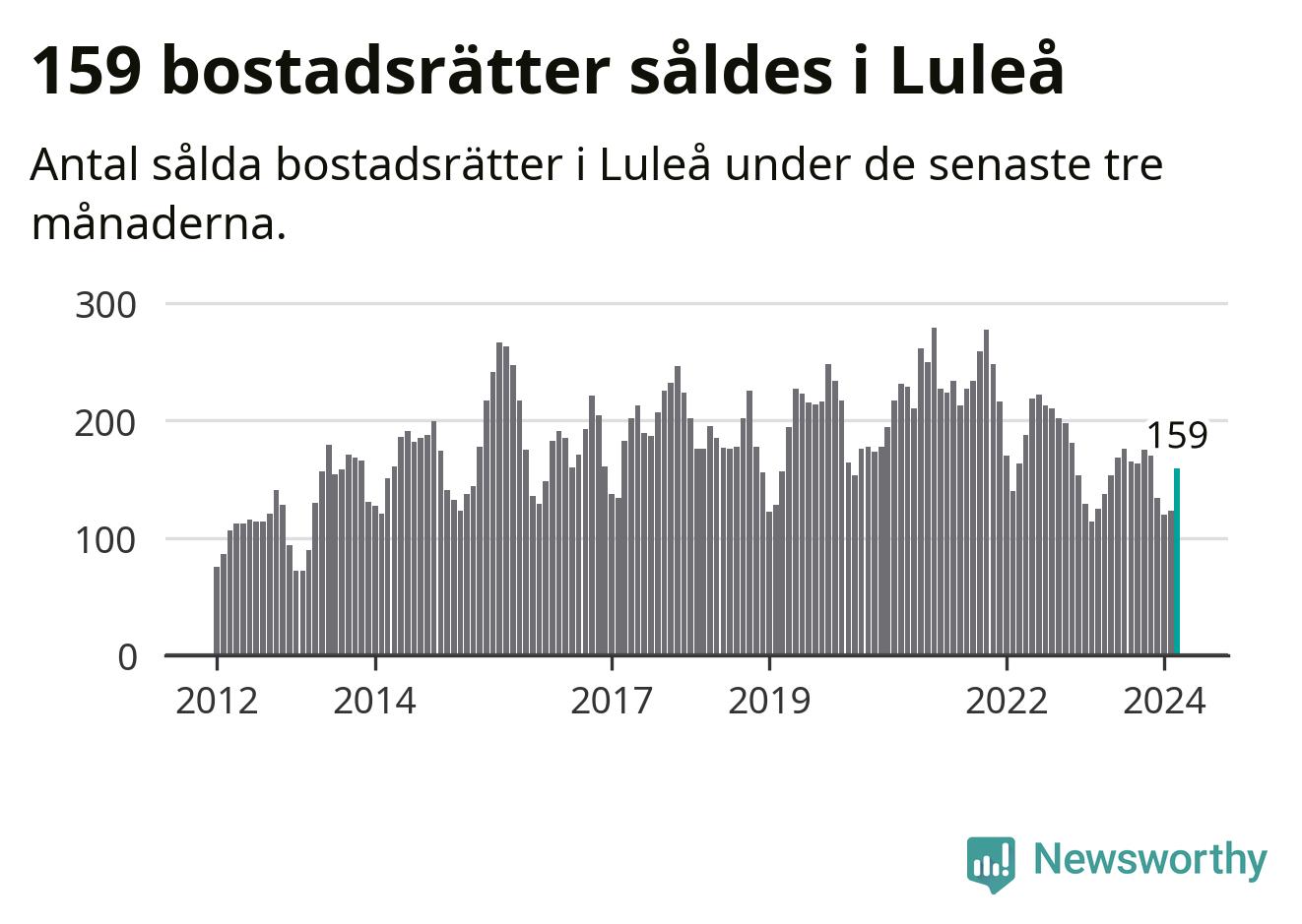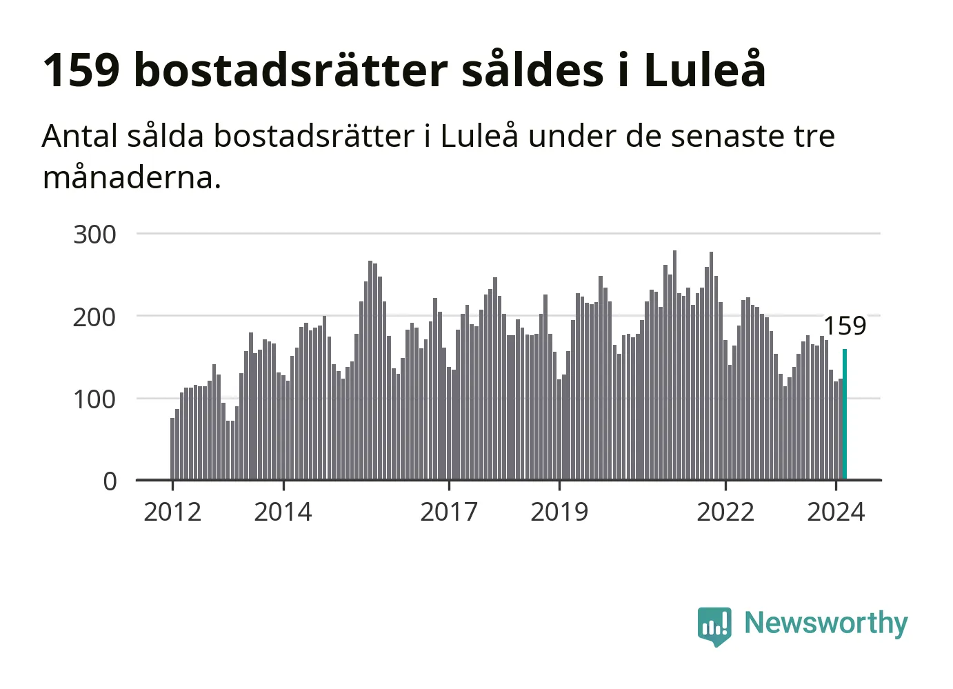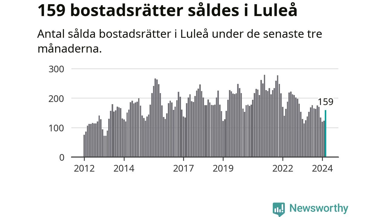 Sammanlagt såldes 159 bostadsrätter i Luleå kommun mellan januari och mars till ett genomsnittligt pris på 1,8 miljoner kronor. I fjol gjordes 125 affärer vid den här tiden på året.