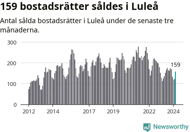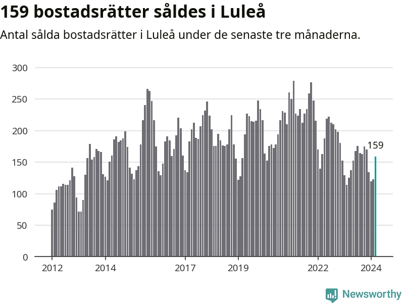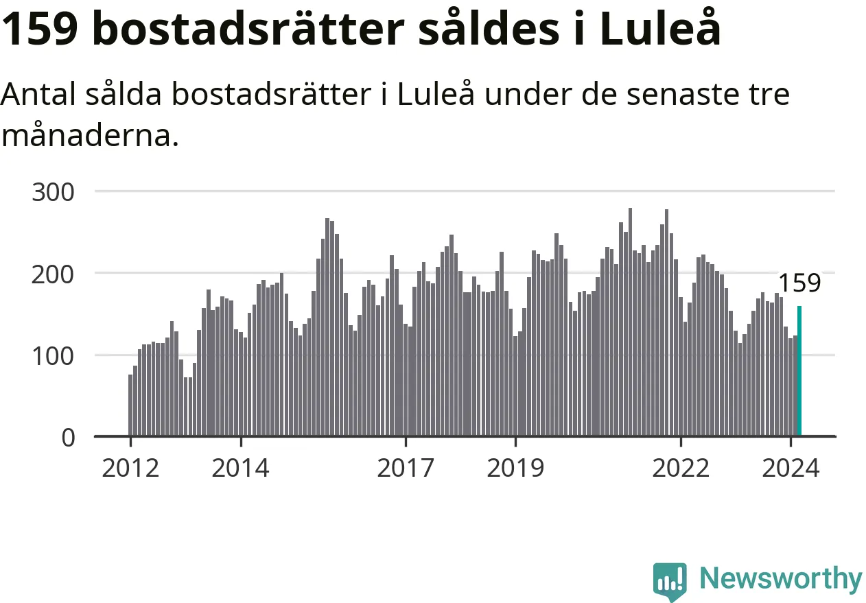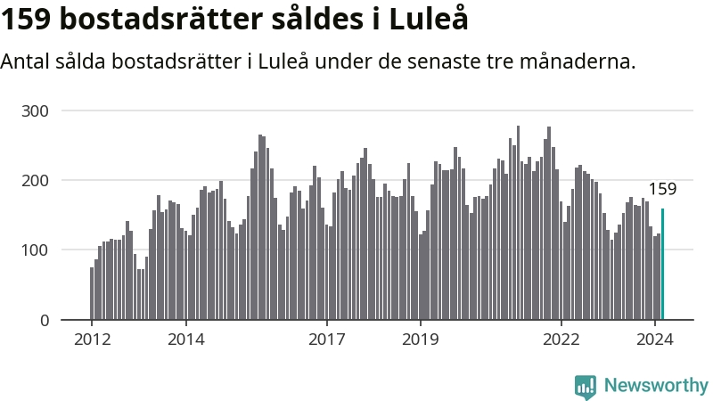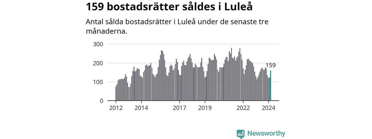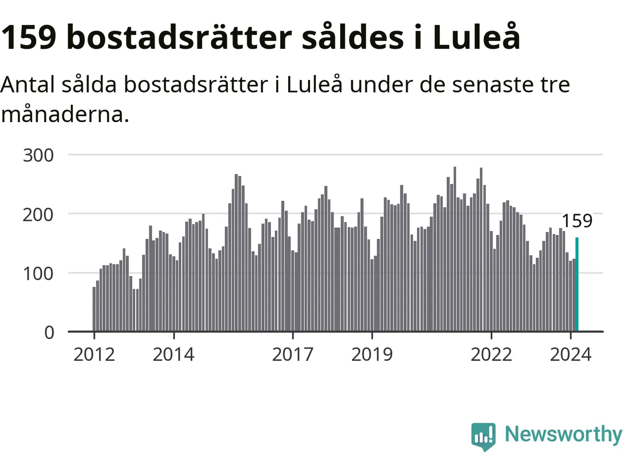 Sammanlagt såldes 159 bostadsrätter i Luleå kommun mellan januari och mars till ett genomsnittligt pris på 1,8 miljoner kronor. I fjol gjordes 125 affärer vid den här tiden på året.