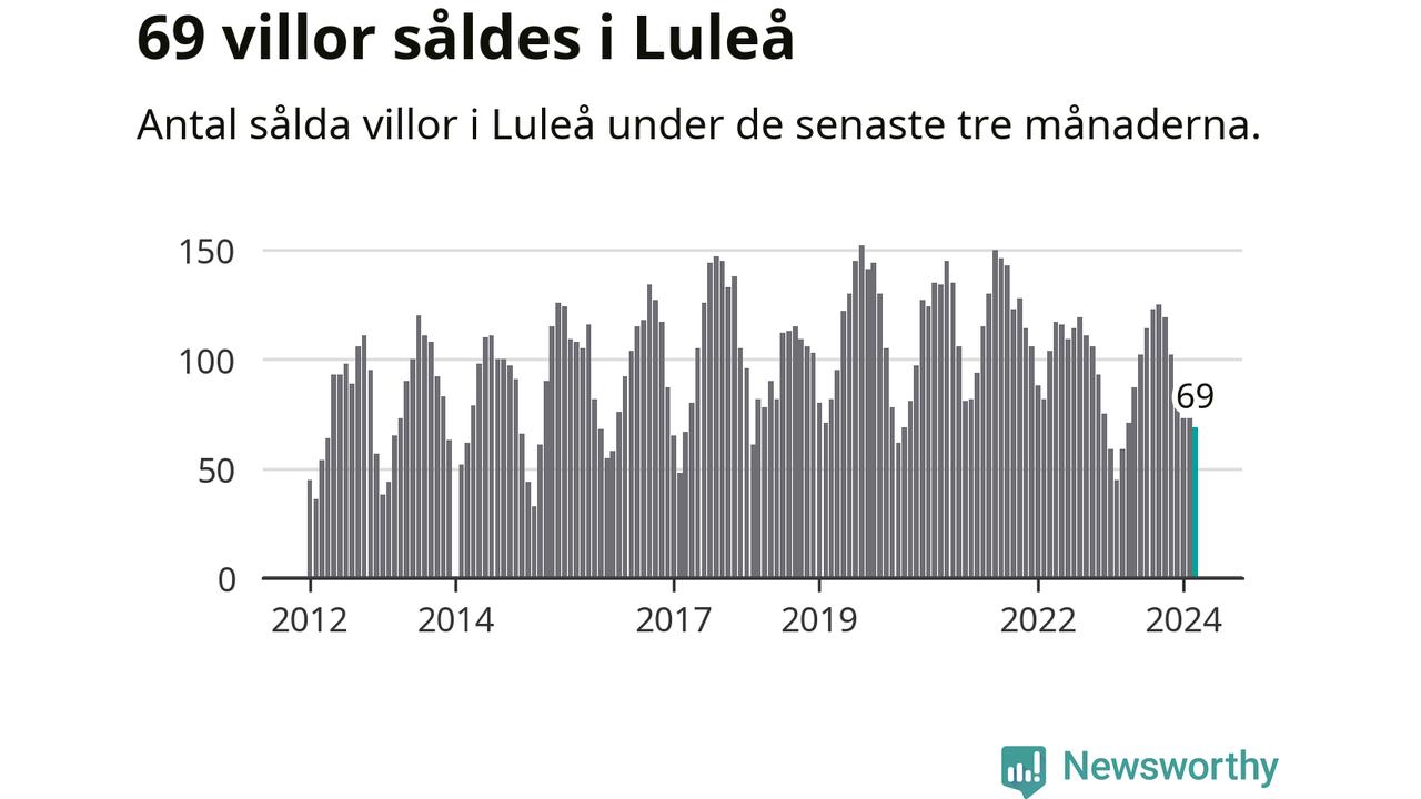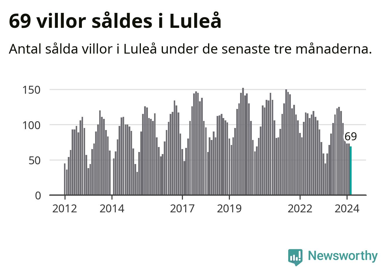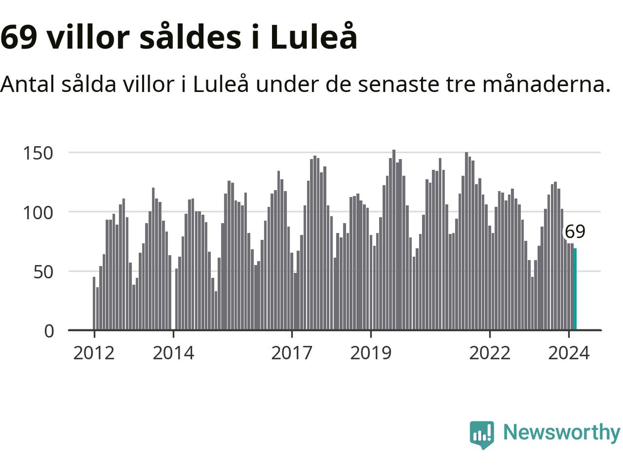 Sammanlagt såldes 69 villor i Luleå kommun mellan januari och mars till ett genomsnittligt pris på 3,2 miljoner kronor. I fjol gjordes 59 affärer vid den här tiden på året.