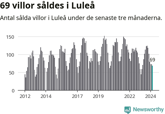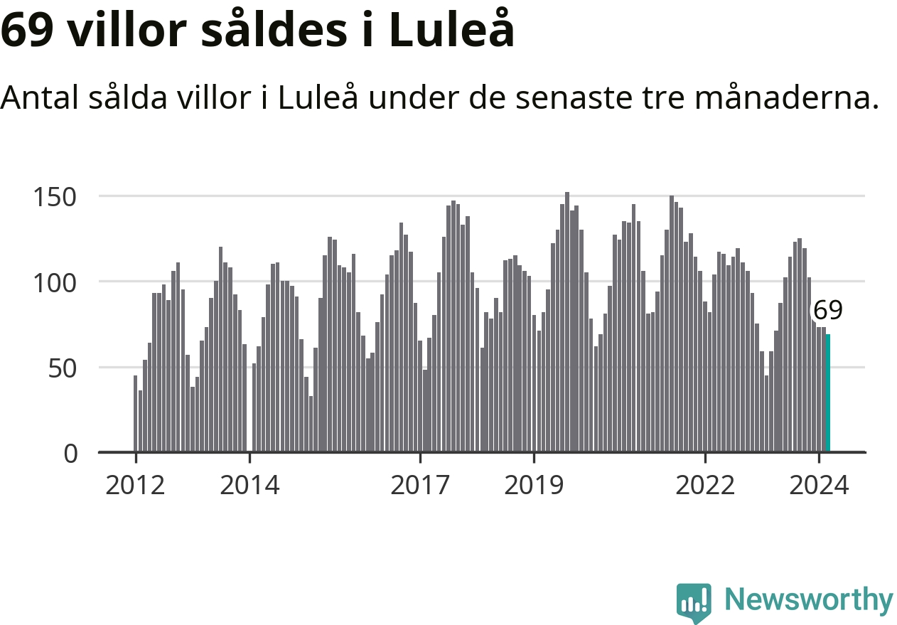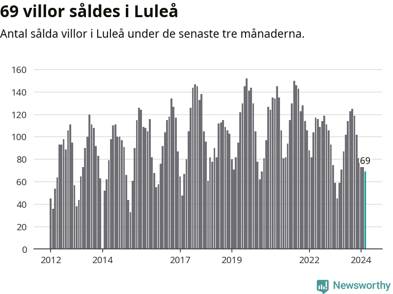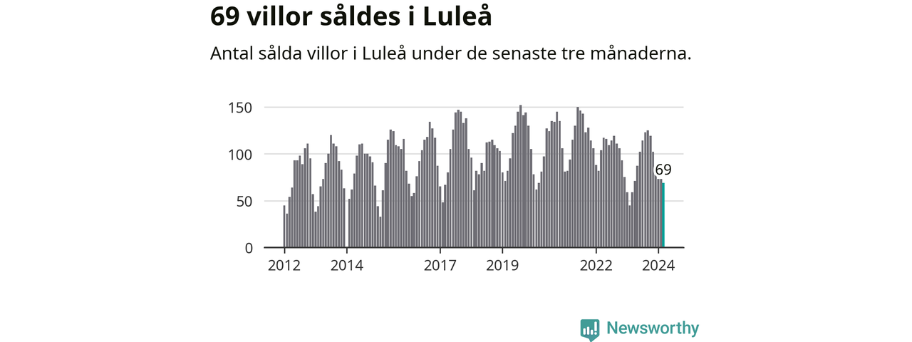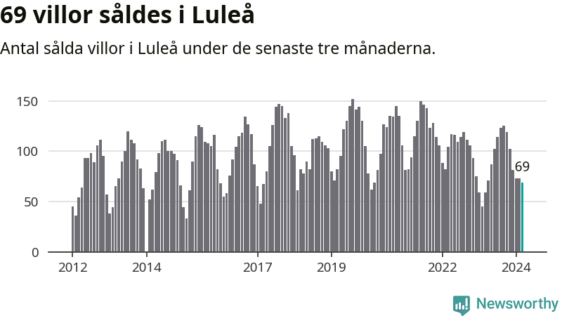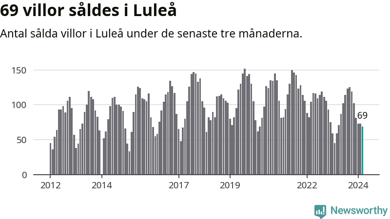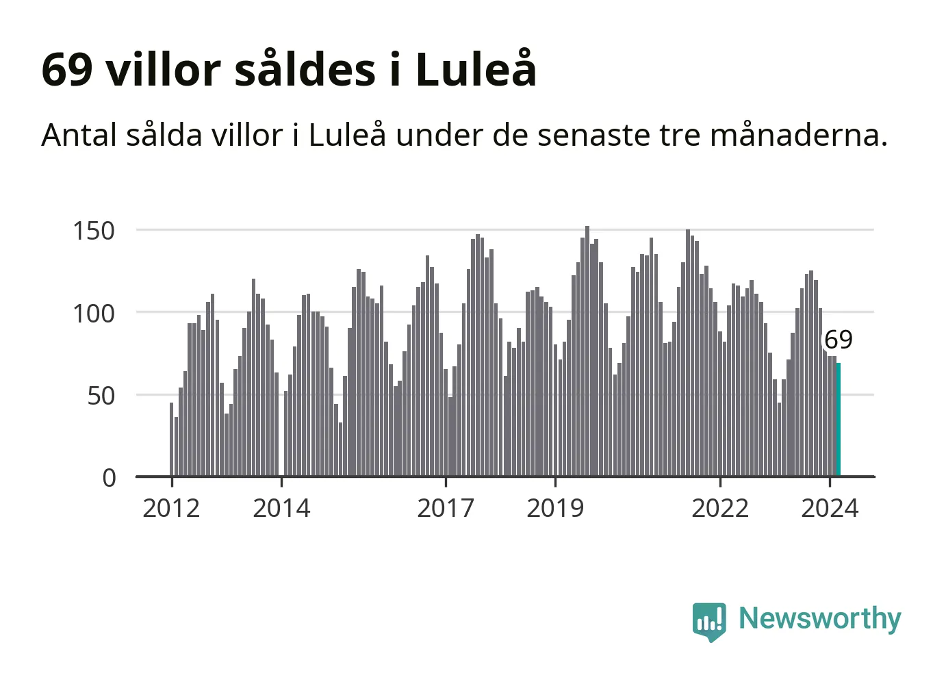 Sammanlagt såldes 69 villor i Luleå kommun mellan januari och mars till ett genomsnittligt pris på 3,2 miljoner kronor. I fjol gjordes 59 affärer vid den här tiden på året.