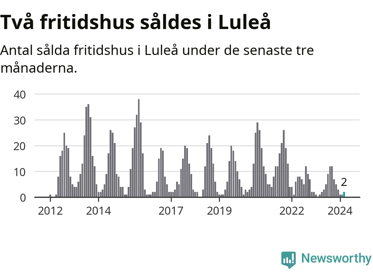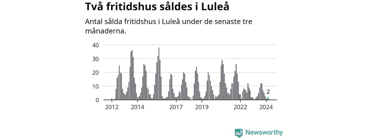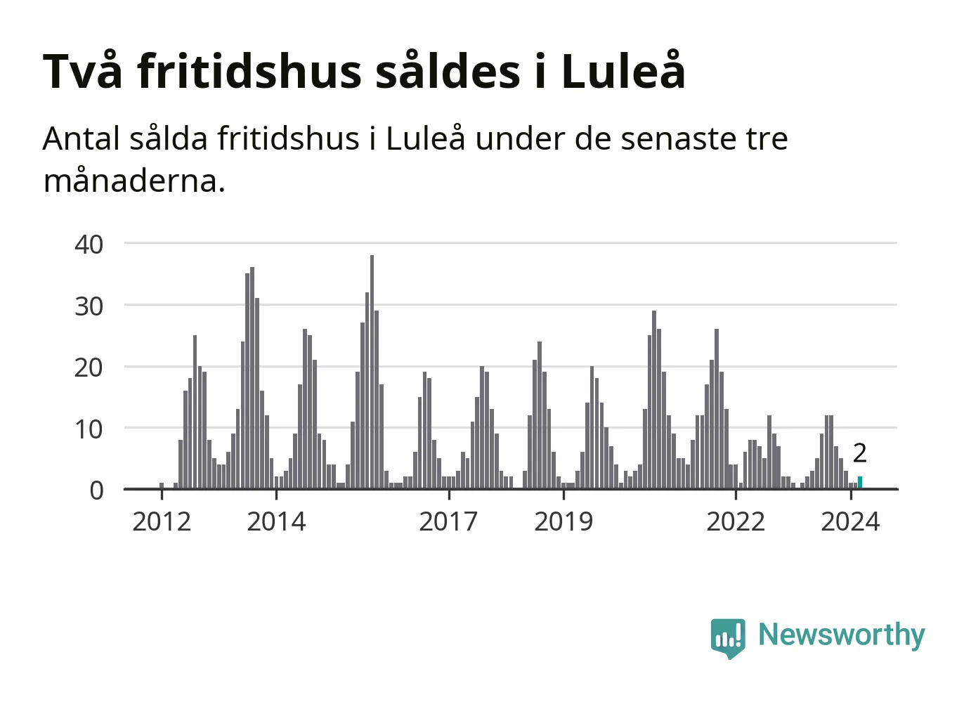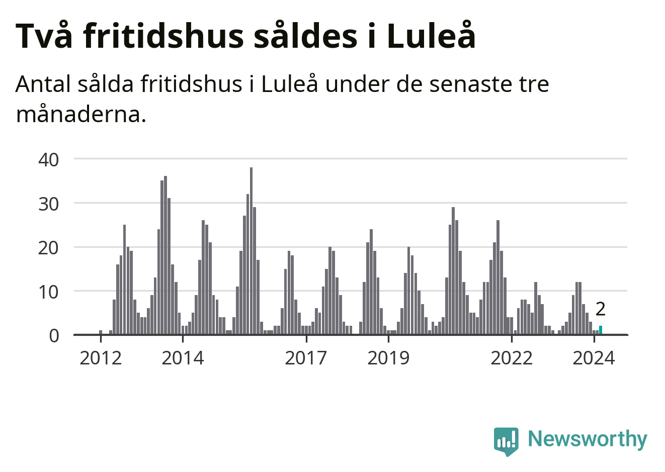 Mellan januari och mars gjordes sammanlagt två affärer med fritidshus i Luleå kommun. Det kan jämföras med ett vid motsvarande tid i fjol.