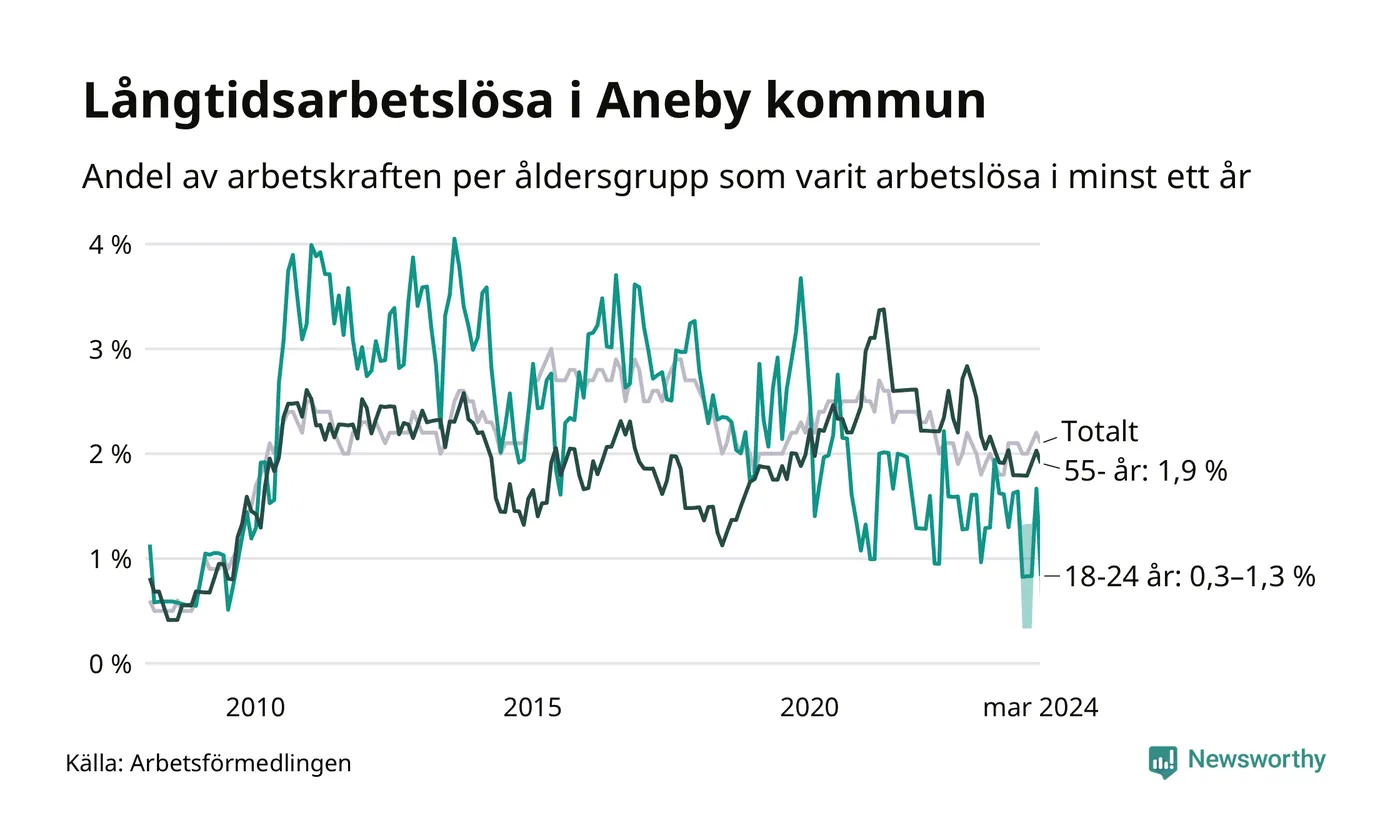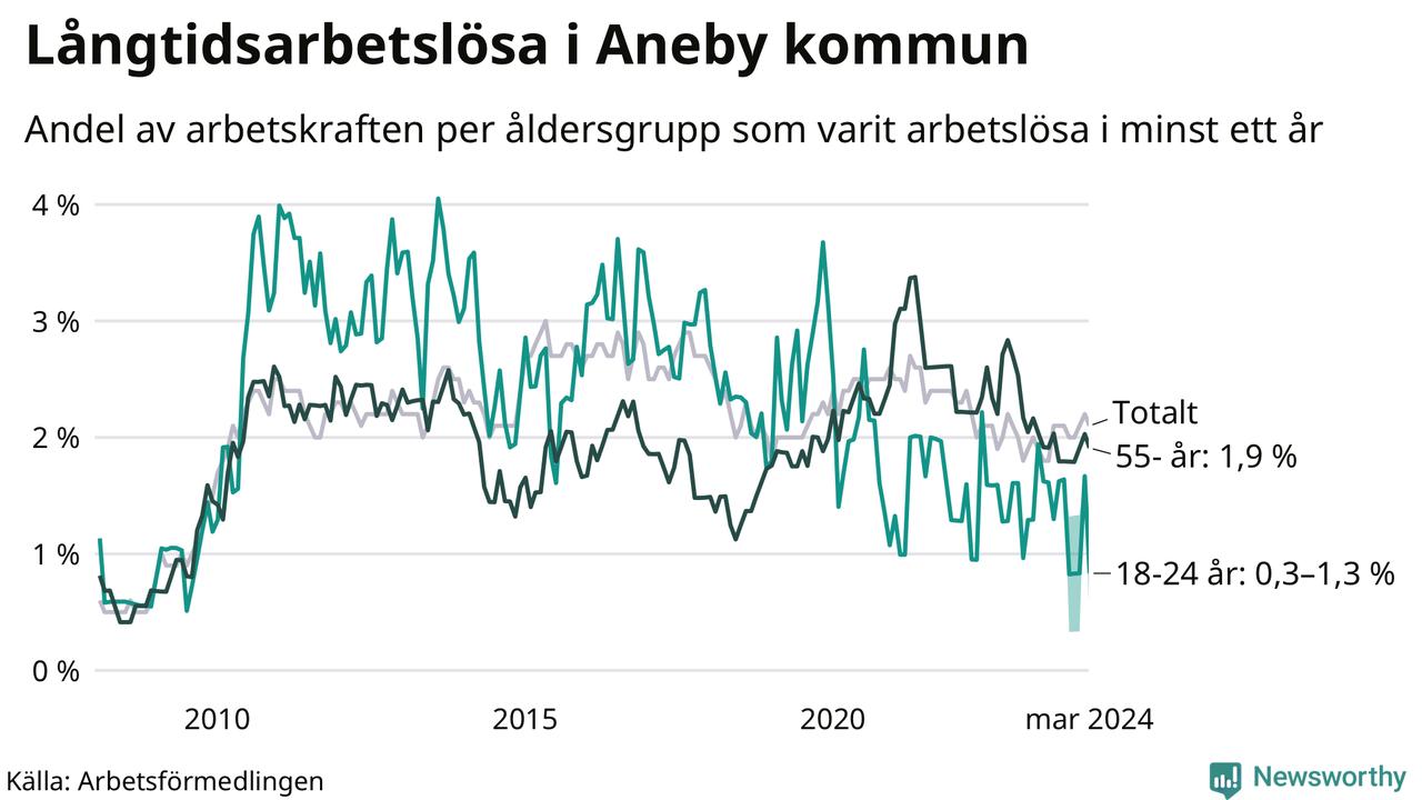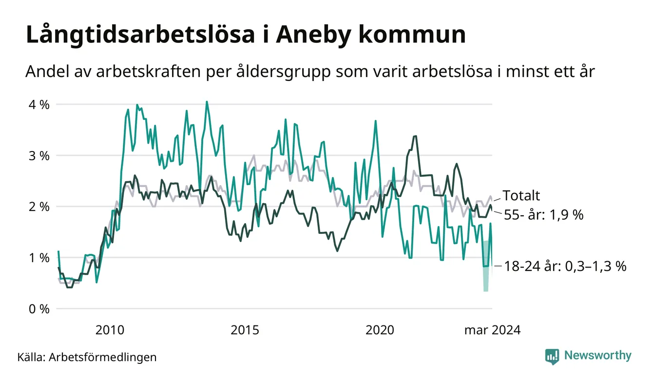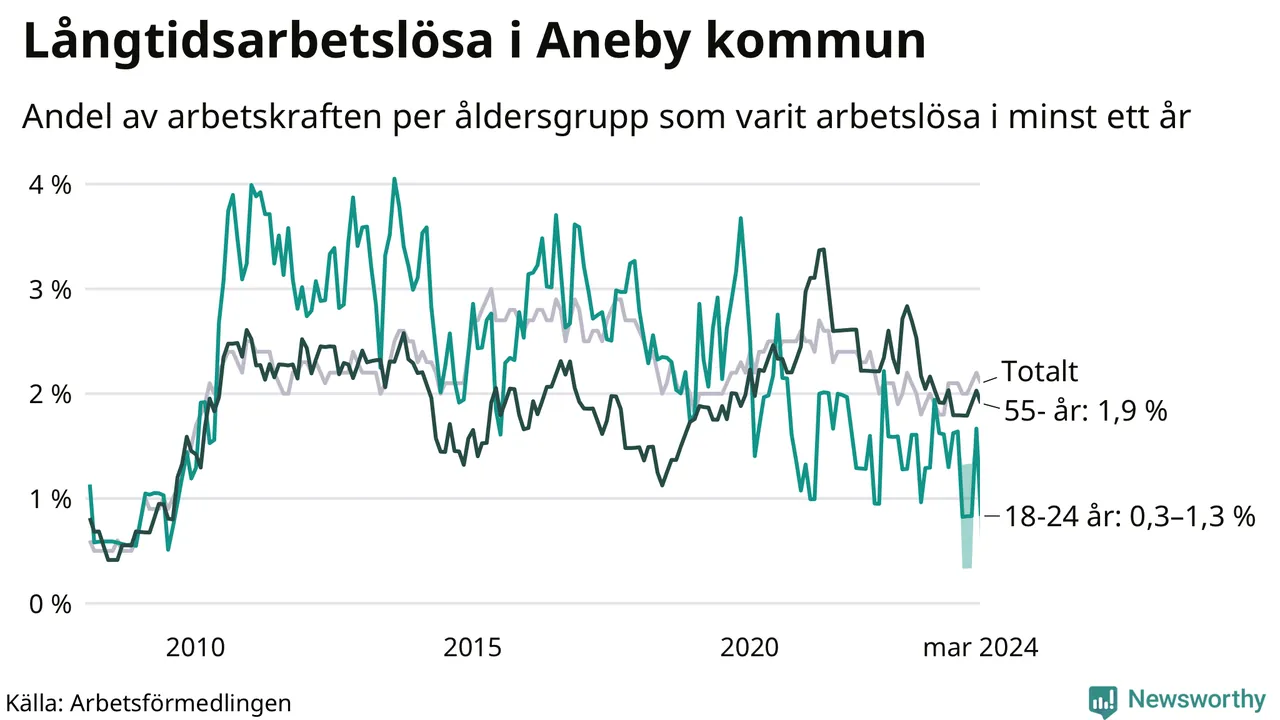 Av de 68 personerna som varit arbetslösa i mer än ett år i Aneby kommun är 16 personer mellan 55 och 651 år och mellan en och fyra är mellan 18 och 24 år. Som andel av arbetskraften innebär det att långtidsarbetslöheten är lägre i de båda grupperna än i arbetskraften totalt. I riket som helhet är andelen långtidsarbetslösa högre i den äldre gruppen.