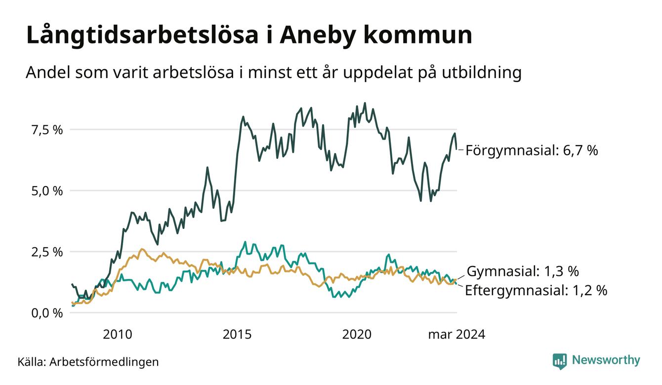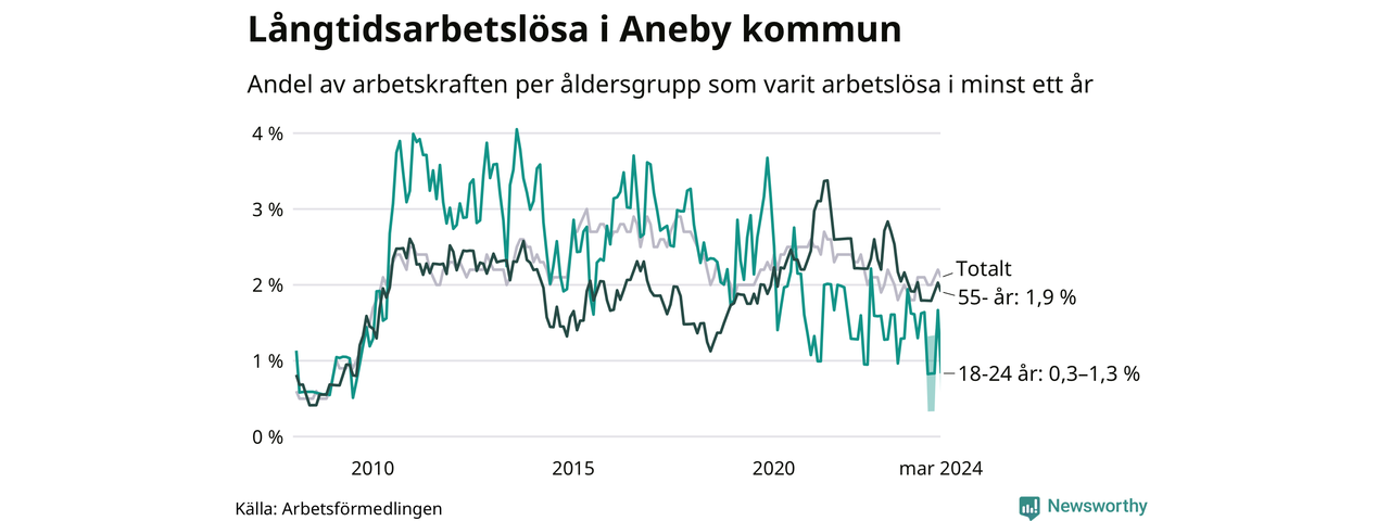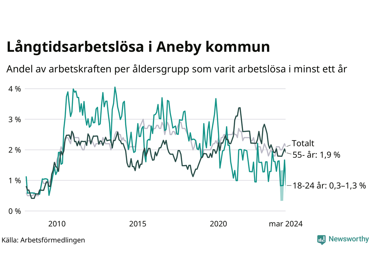 Av de 68 personerna som varit arbetslösa i mer än ett år i Aneby kommun är 16 personer mellan 55 och 651 år och mellan en och fyra är mellan 18 och 24 år. Som andel av arbetskraften innebär det att långtidsarbetslöheten är lägre i de båda grupperna än i arbetskraften totalt. I riket som helhet är andelen långtidsarbetslösa högre i den äldre gruppen.