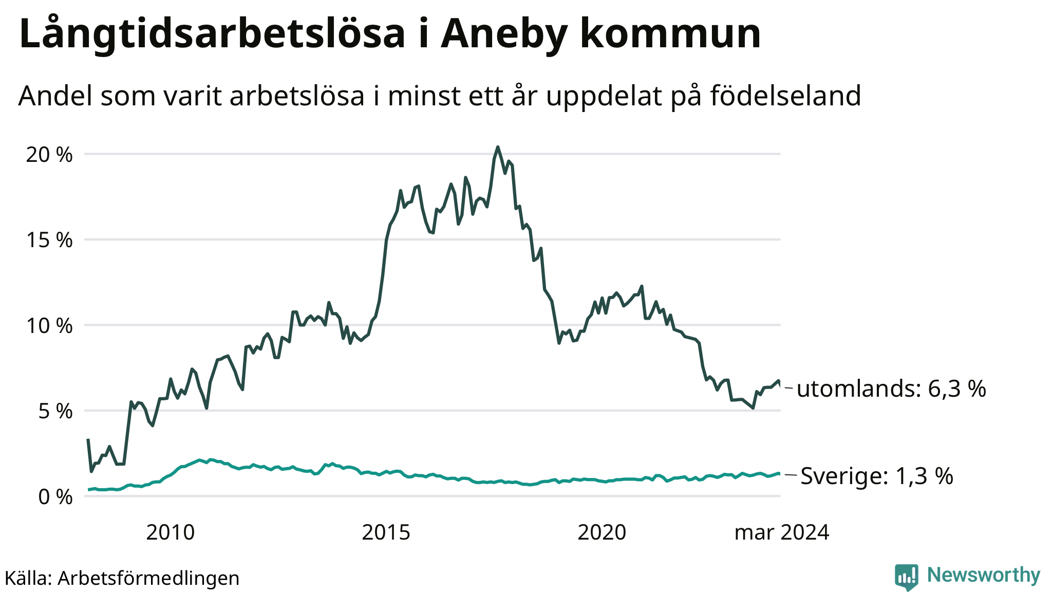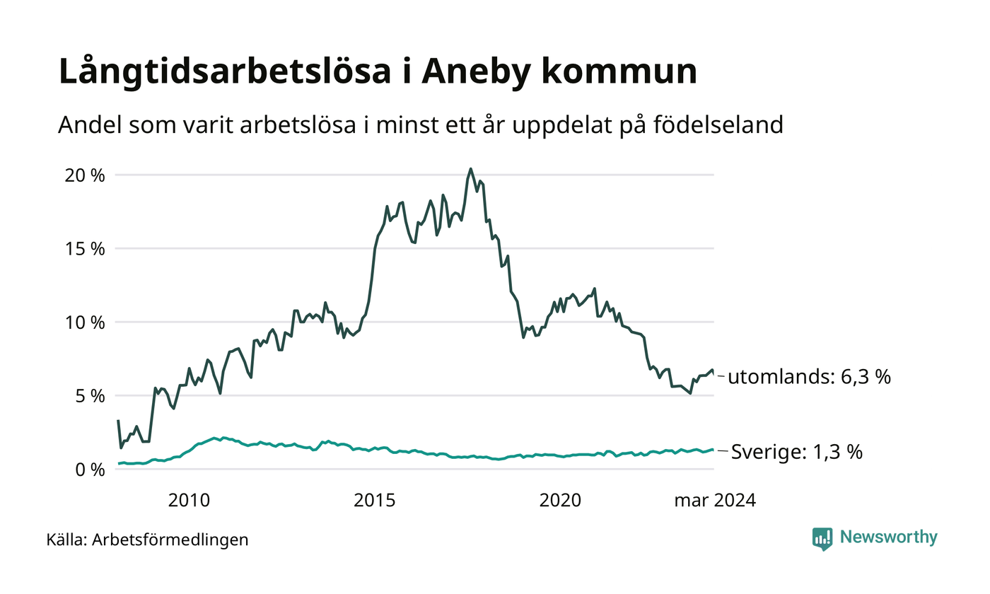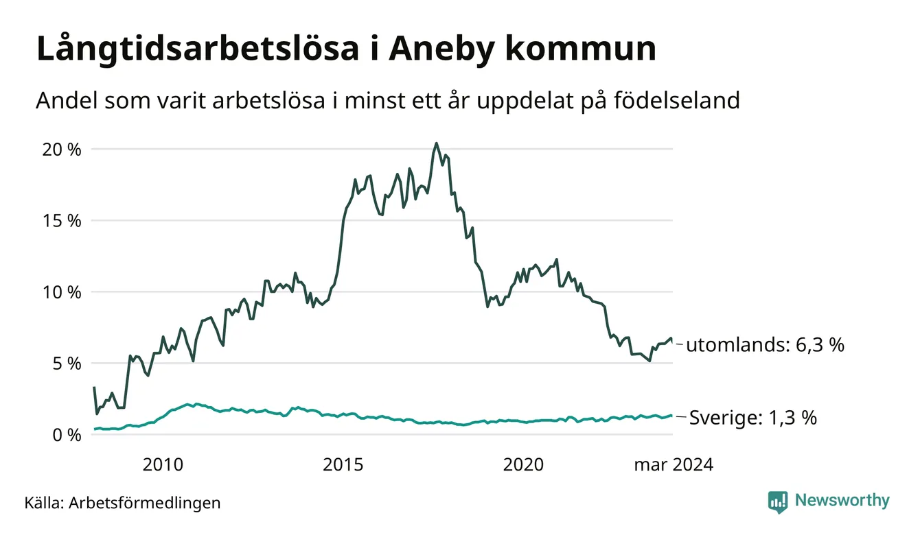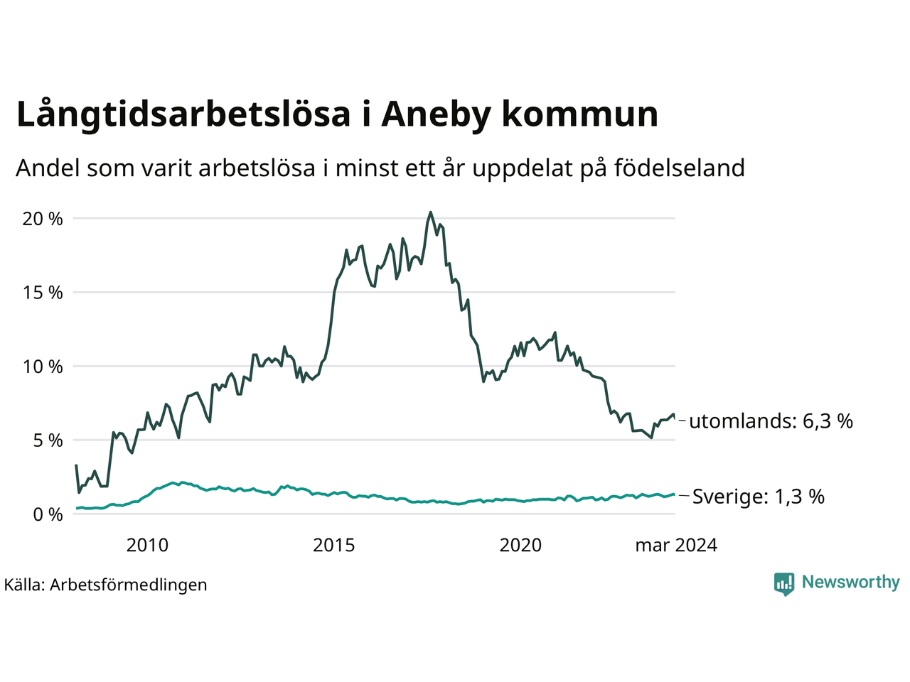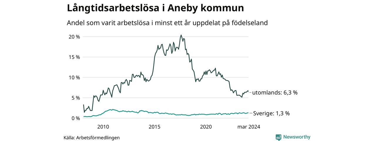 35 av de långtidsarbetslösa i Aneby är födda i Sverige, medan 33 är födda utomlands. Det innebär att långtidsarbetslösheten bland Sverigefödda är 1,3 procent, medan den är fem gånger så hög – 6,3 procent – bland födda utomlands. Även i riket som helhet är arbetslösheten högre bland utrikesfödda.