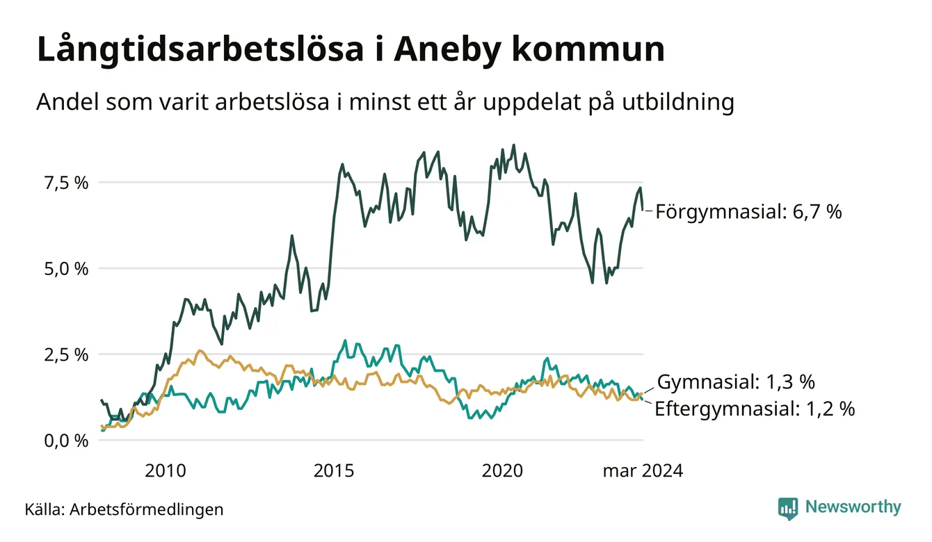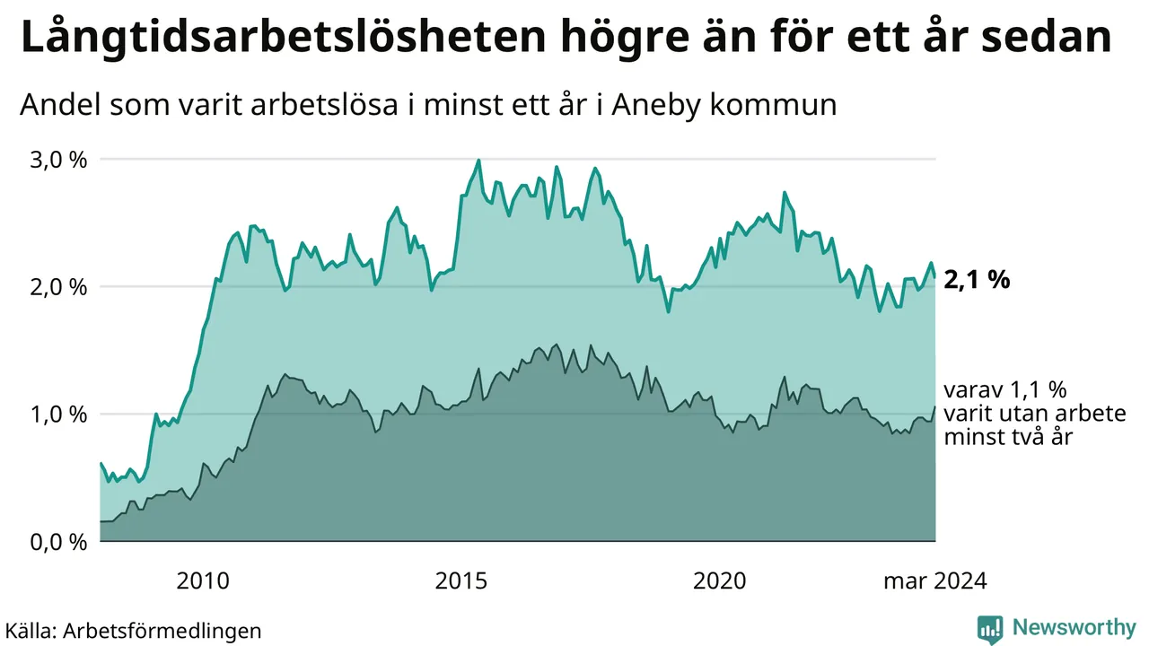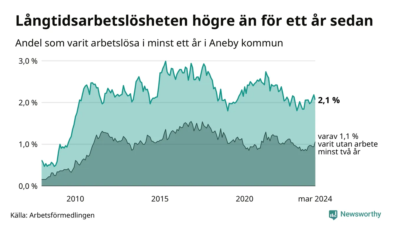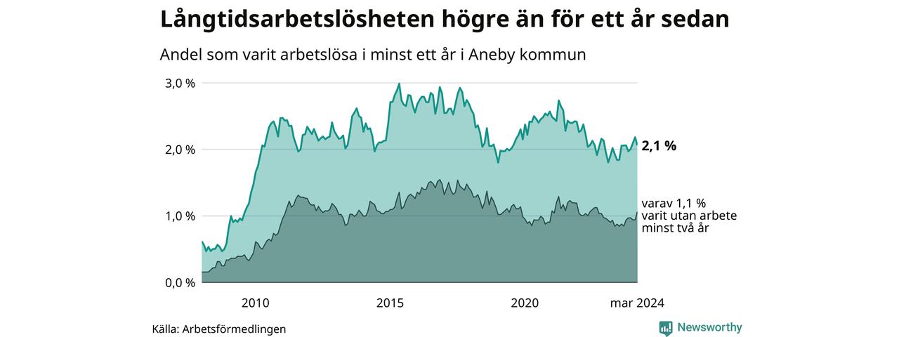 Andelen som varit utan arbete i minst ett år i Aneby i mars var högre än för ett år sedan. Men jämfört med i februari har antalet långtidsarbetslösa minskat.