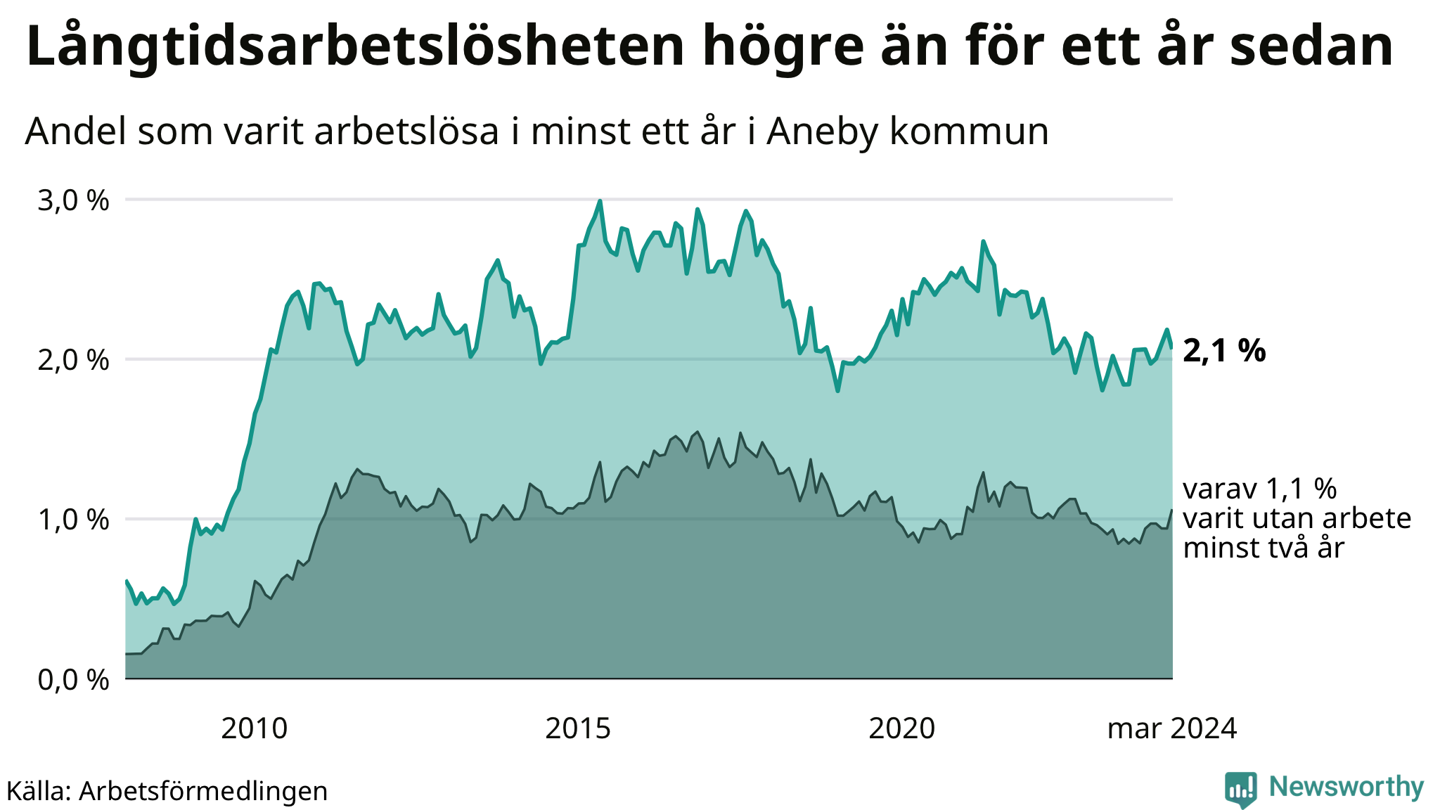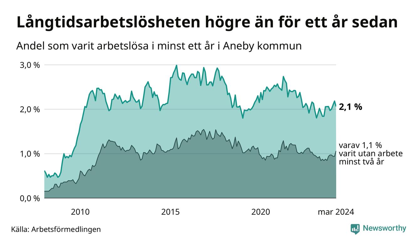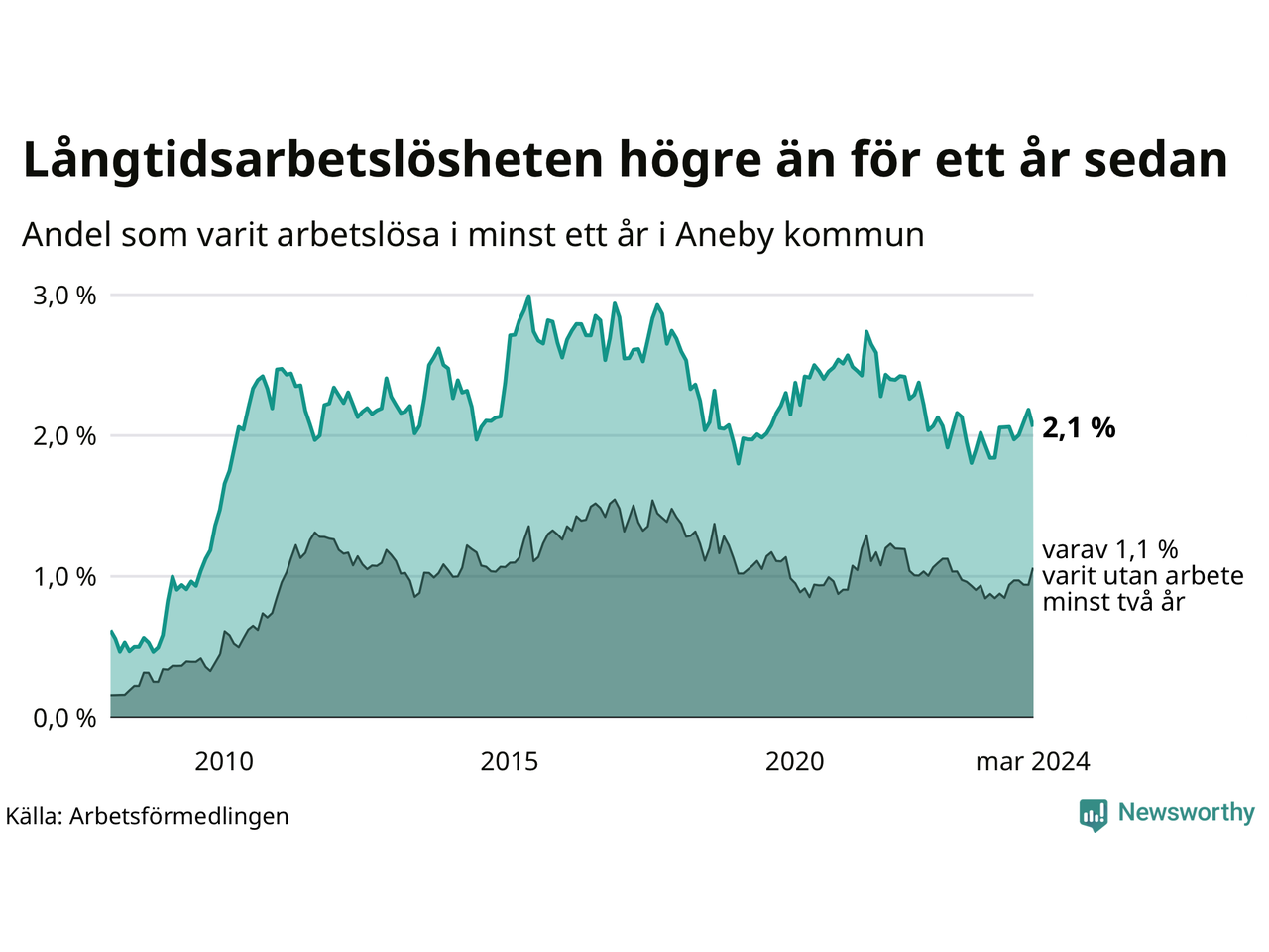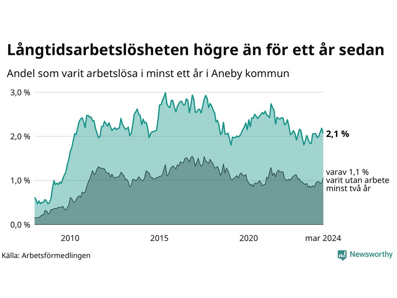 I mars hade 68 Anebybor varit arbetslösa i minst ett år, vilket är fyra färre än månaden innan. 68 personer motsvarar 2,1 procent av arbetskraften i kommunen – andelen långtidsarbetslösa är 0,2 procentenheter högre än samma månad för ett år sedan.