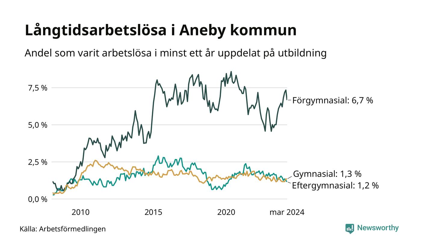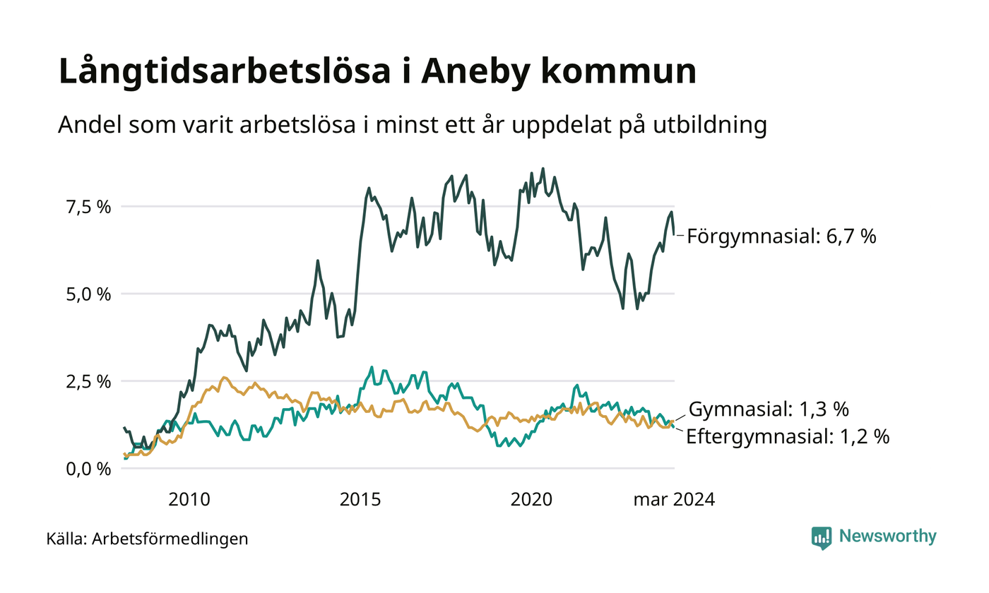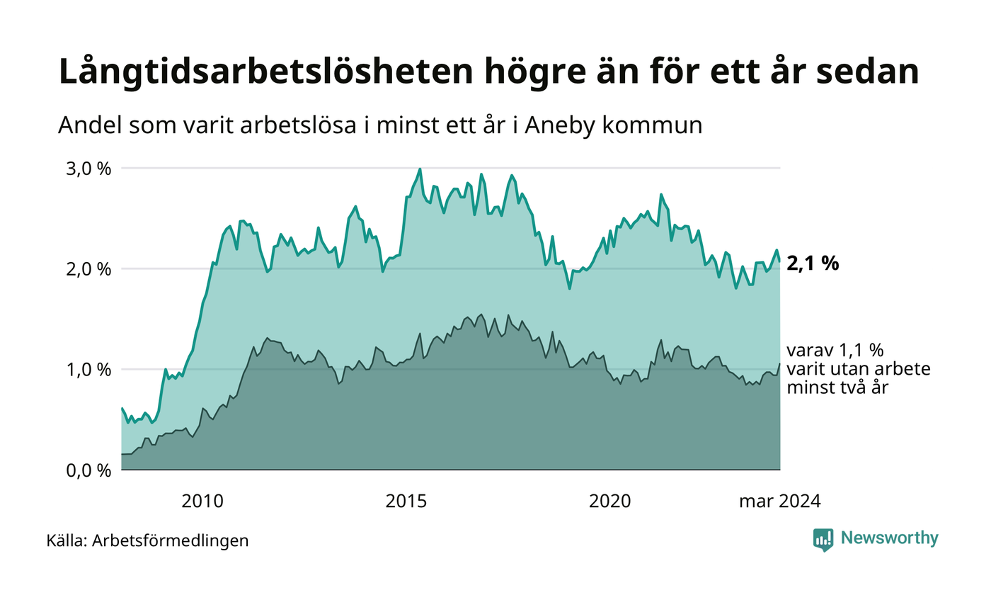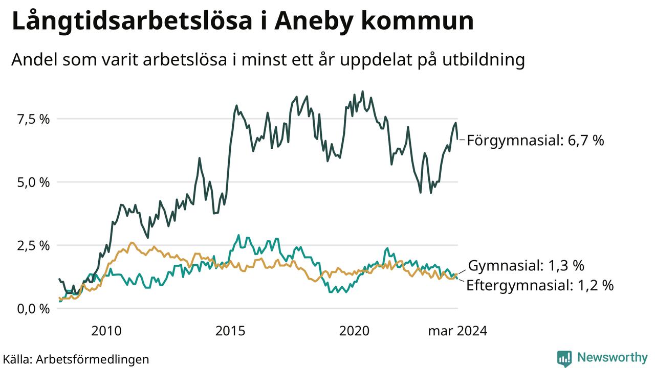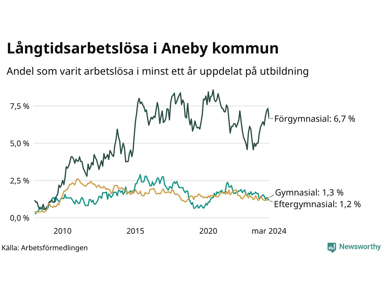 I mars hade 68 Anebybor varit arbetslösa i minst ett år, vilket är fyra färre än månaden innan. 68 personer motsvarar 2,1 procent av arbetskraften i kommunen – andelen långtidsarbetslösa är 0,2 procentenheter högre än samma månad för ett år sedan.