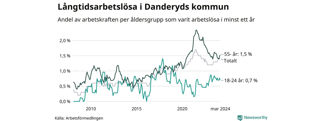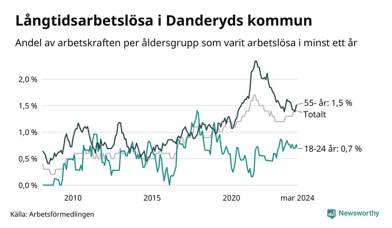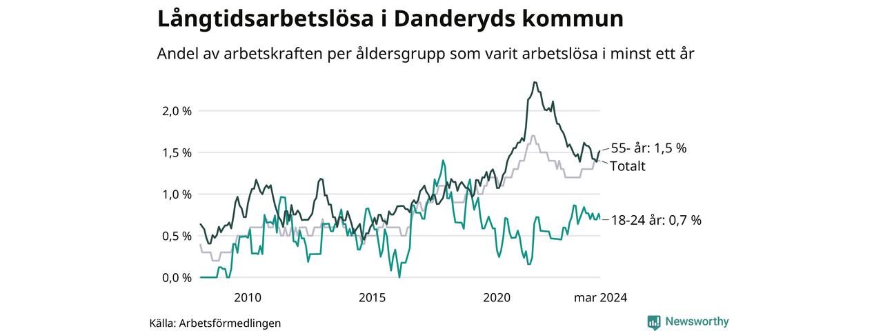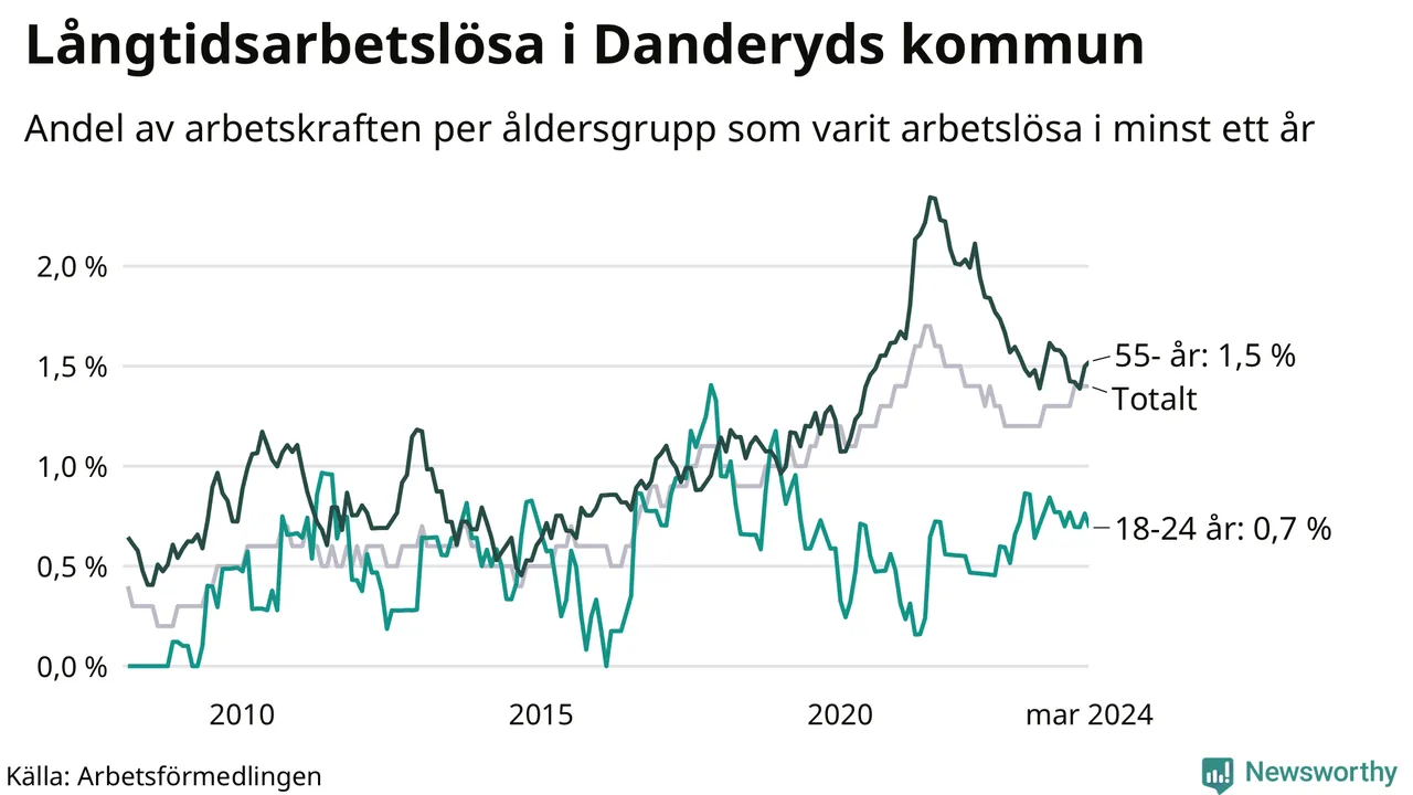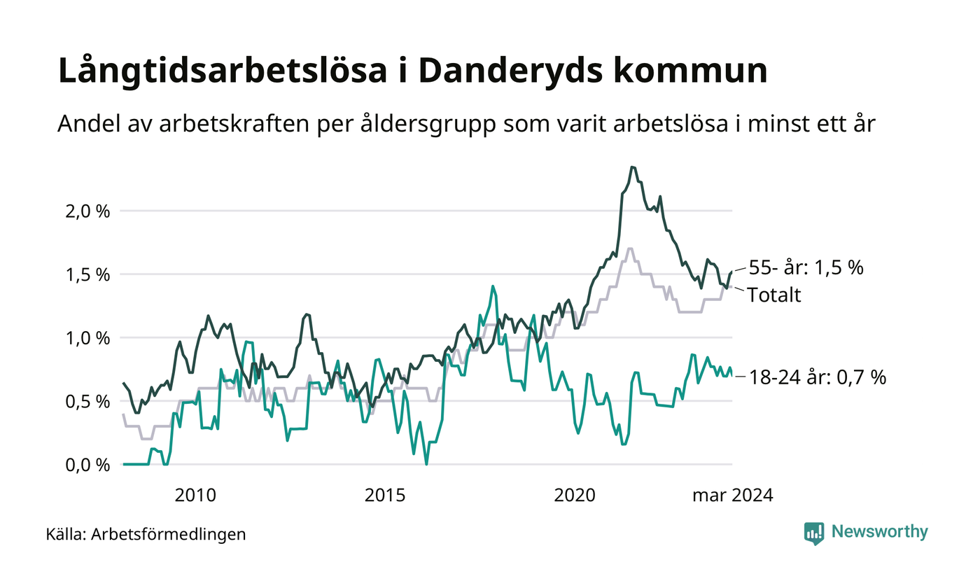 Av de 205 personerna som varit arbetslösa i mer än ett år i Danderyds kommun är 53 personer mellan 55 och 651 år och tio är mellan 18 och 24 år. För den äldre gruppen är andelen arbetslösa 1,5 procent medan den i den yngre gruppen är 0,7 procent. Även i riket som helhet är långtidsarbetslösheten högre i gruppen äldre.
