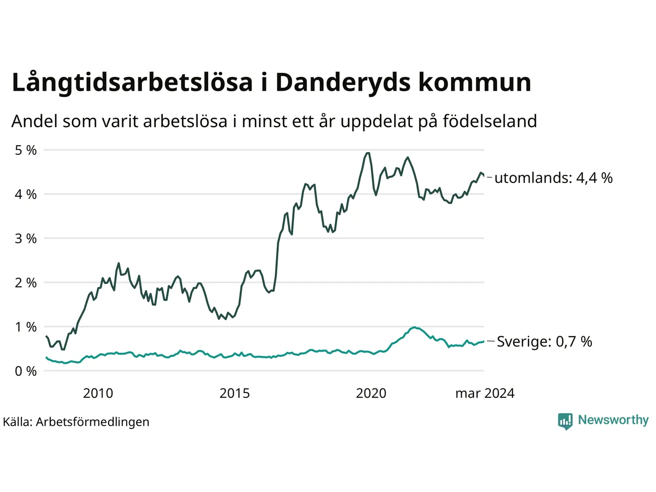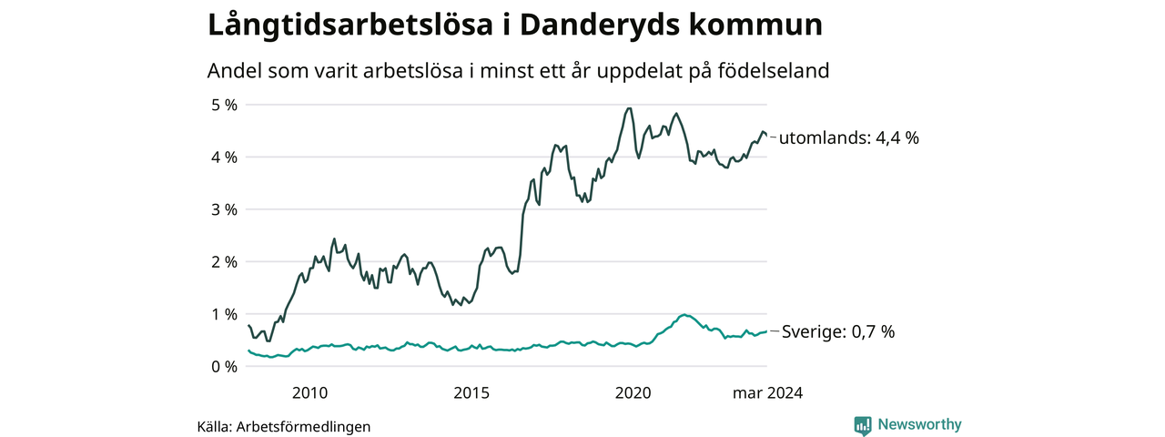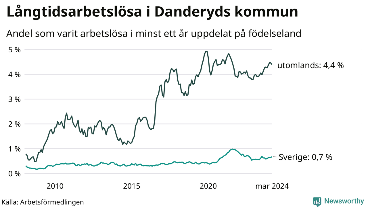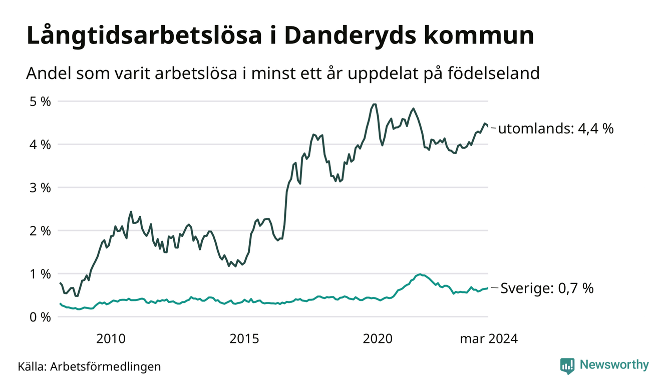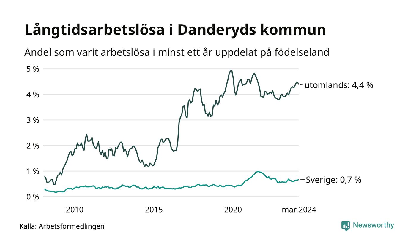 80 av de långtidsarbetslösa i Danderyd är födda i Sverige, medan 125 är födda utomlands. Det innebär att långtidsarbetslösheten bland Sverigefödda är 0,7 procent, medan den är sex gånger så hög – 4,4 procent – bland födda utomlands. Även i riket som helhet är arbetslösheten högre bland utrikesfödda.