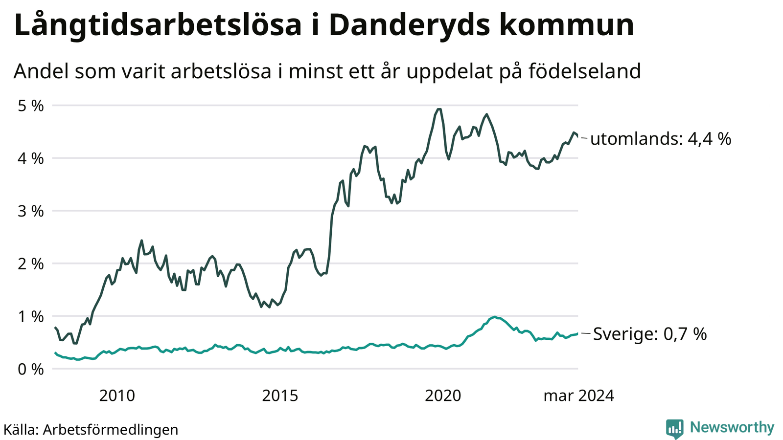 Graf: Andel arbetslösa uppdelat på födelseland i Danderyd