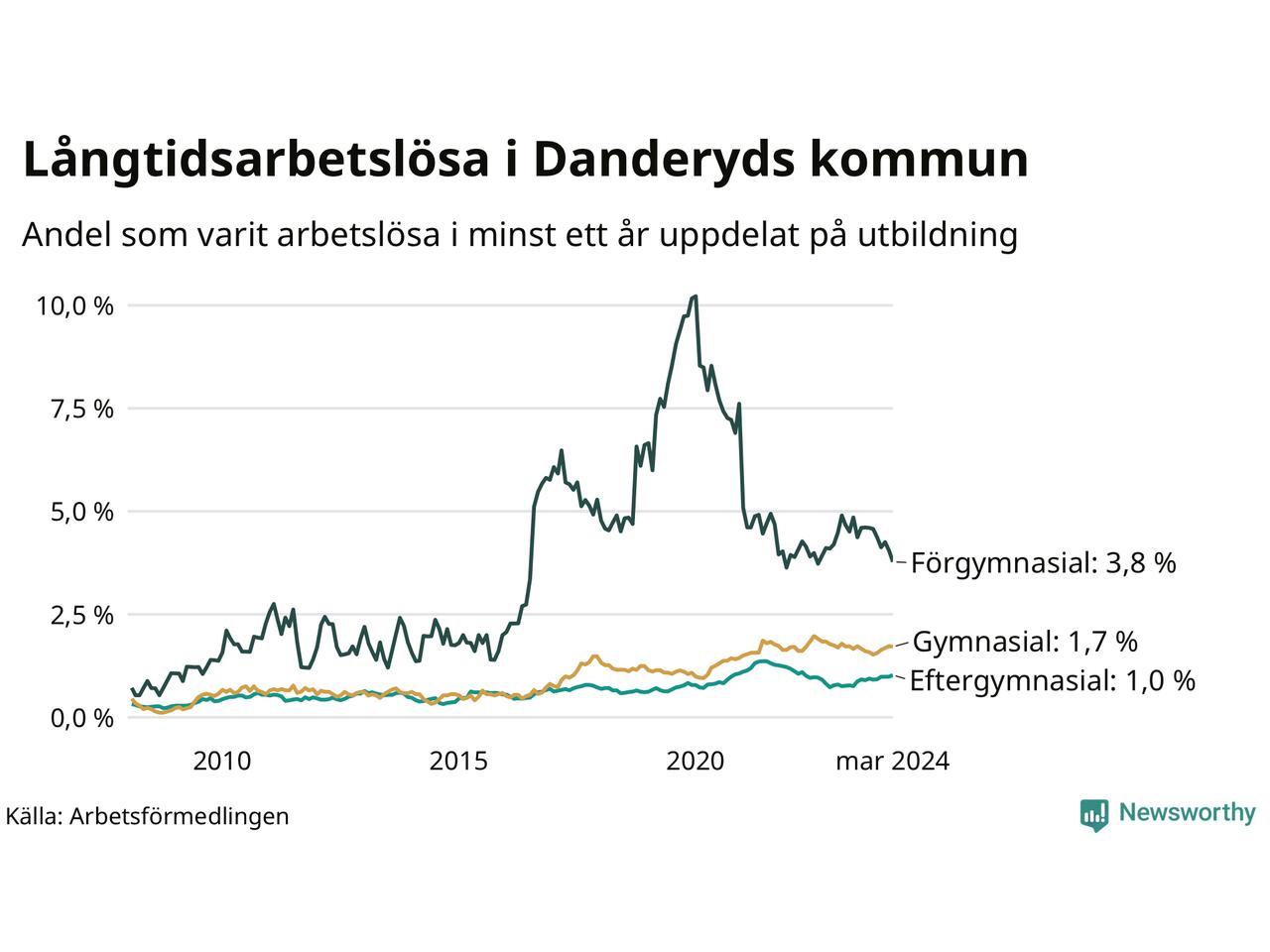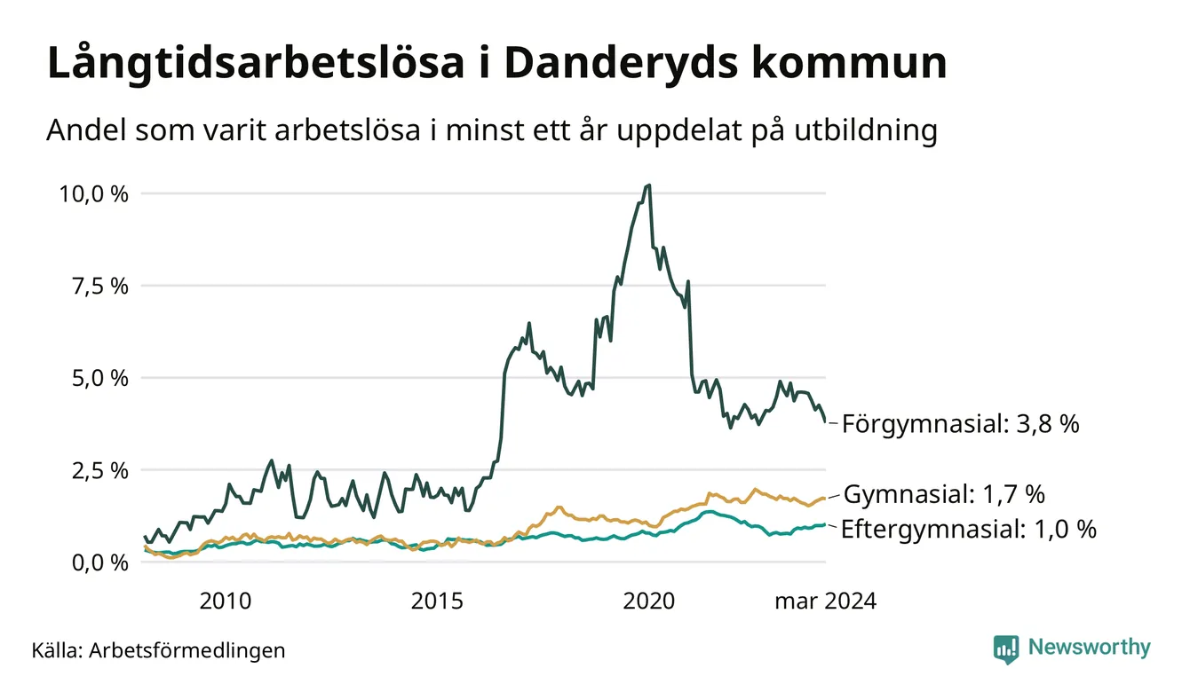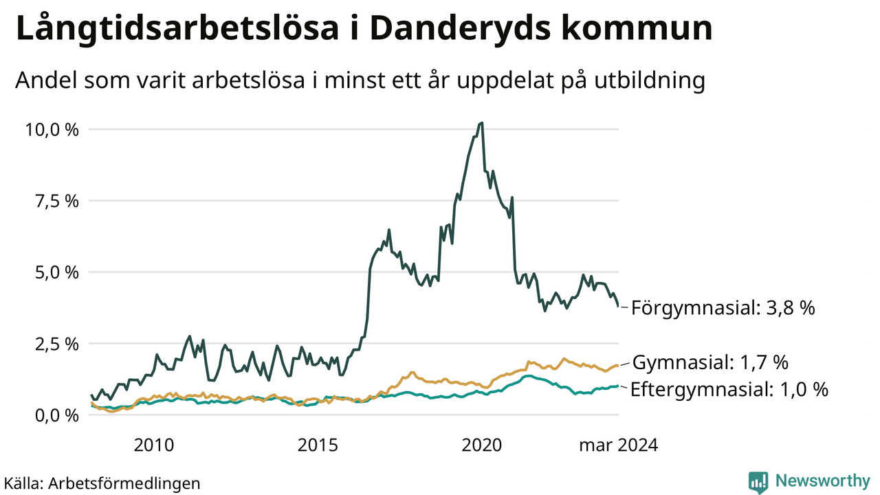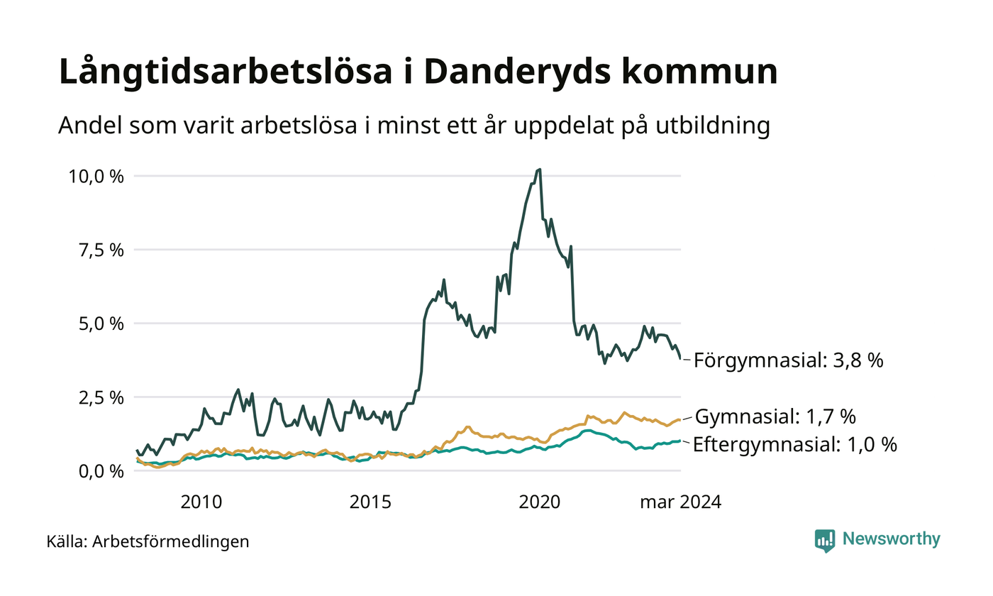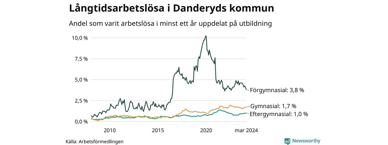 Graf över andel långtidsarbetslösa i Danderyd uppdelat på utbildningsnivå