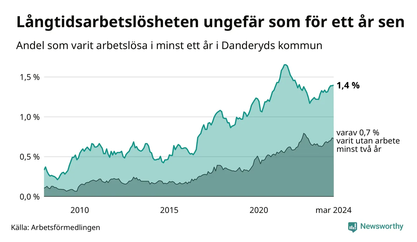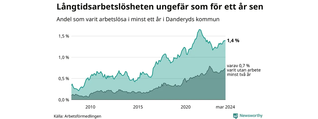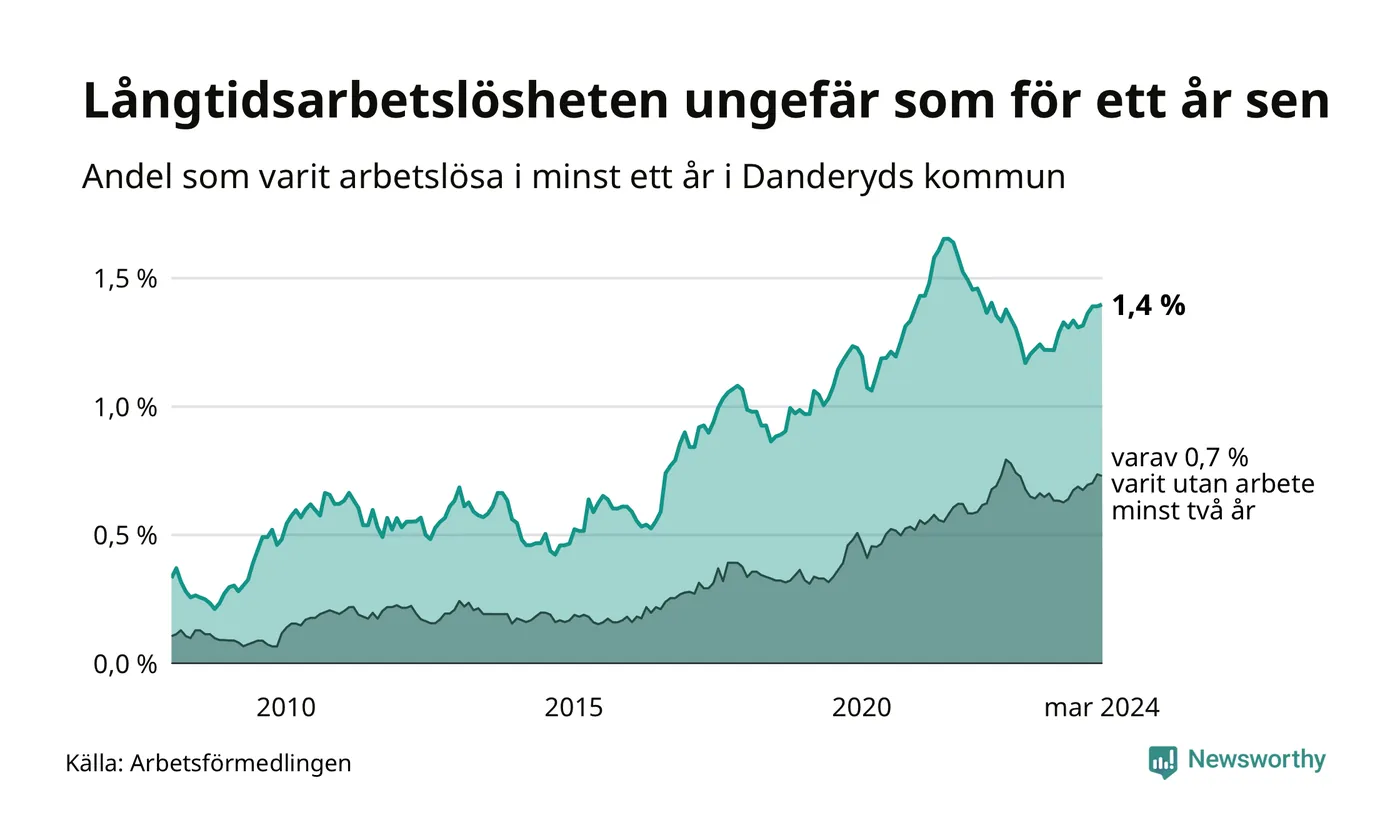 I mars hade 205 Danderydsbor varit arbetslösa i minst ett år, vilket är en fler än månaden innan. Det är den femte månaden i rad med ökande antal långtidsarbetslösa. 205 personer motsvarar 1,4 procent av arbetskraften i kommunen – andelen långtidsarbetslösa är ungefär på samma nivå som för ett år sedan.