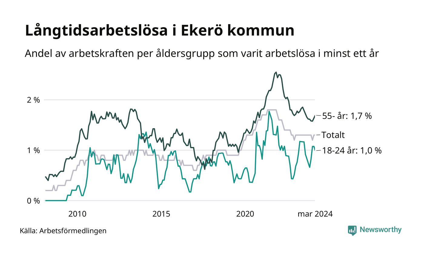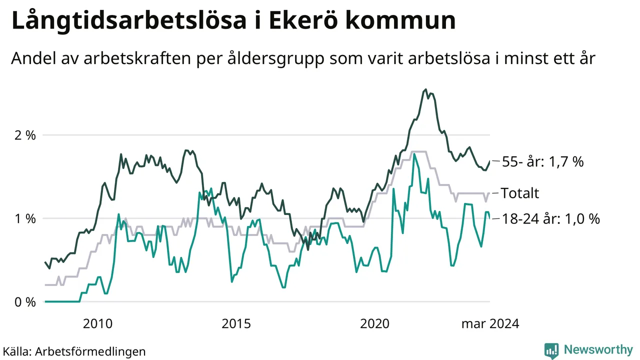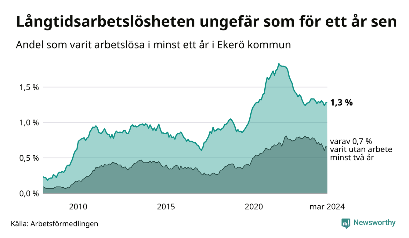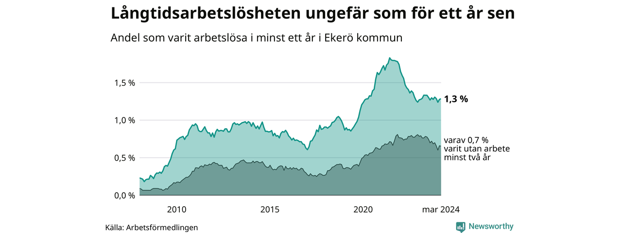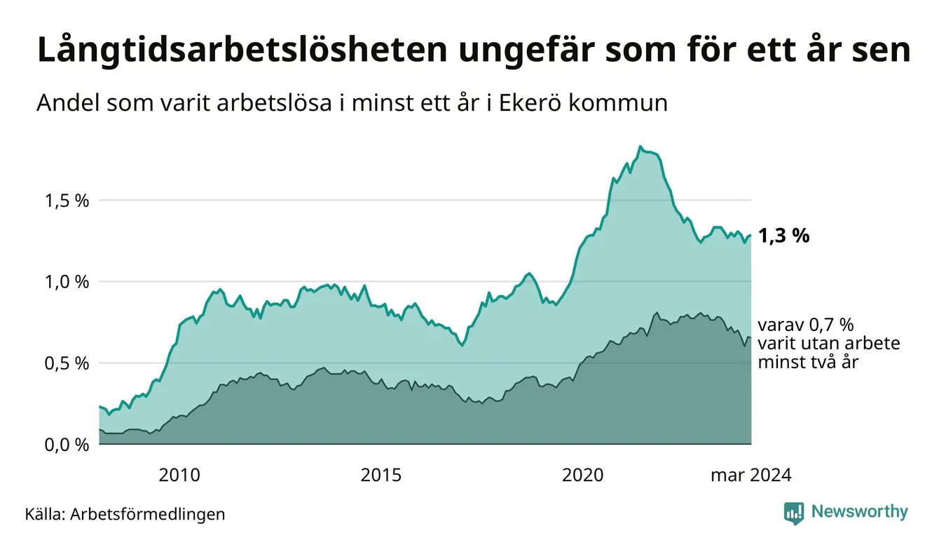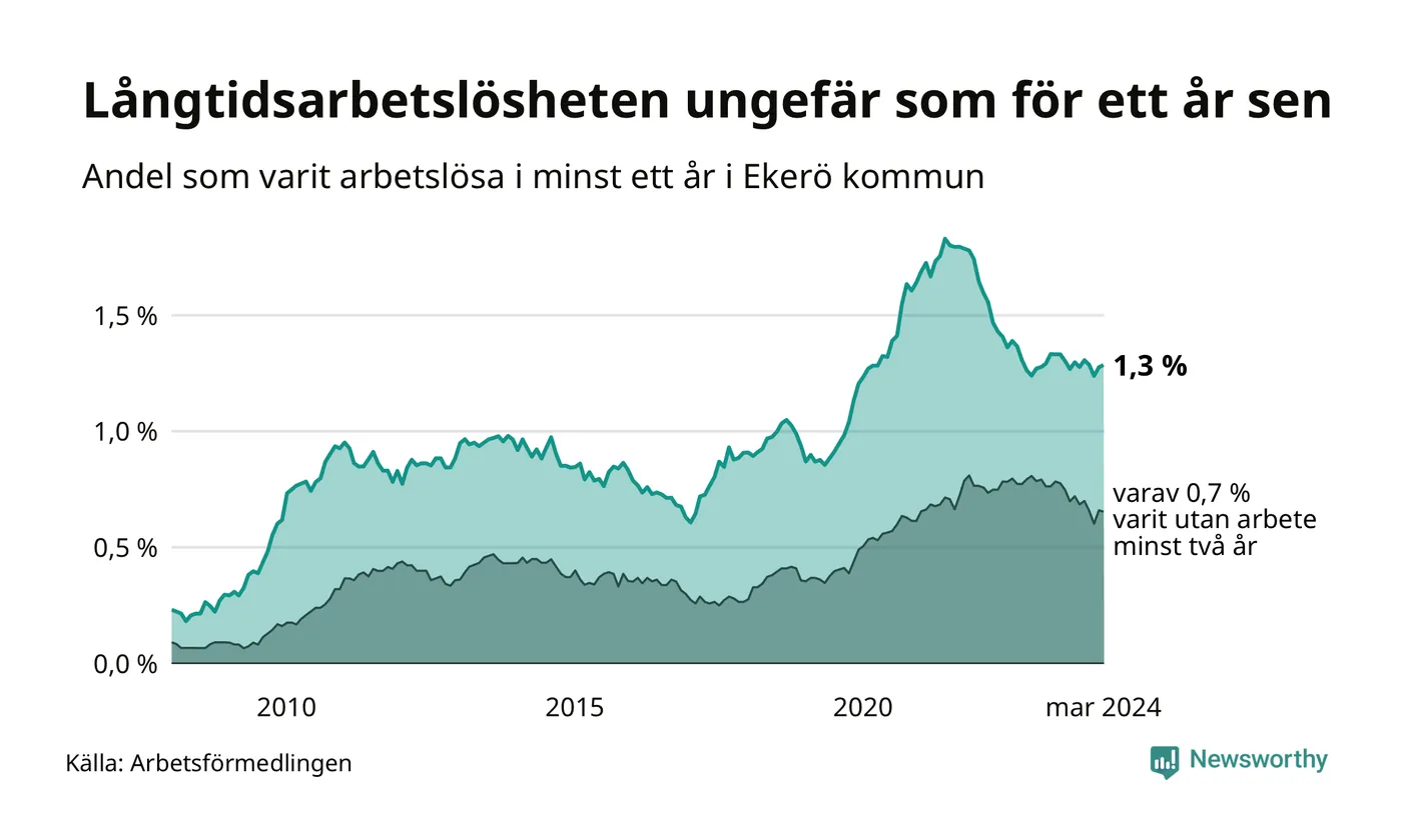 I mars hade 179 Ekeröbor varit arbetslösa i minst ett år, vilket är en fler än månaden innan. 179 personer motsvarar 1,3 procent av arbetskraften i kommunen – andelen långtidsarbetslösa är ungefär på samma nivå som för ett år sedan.