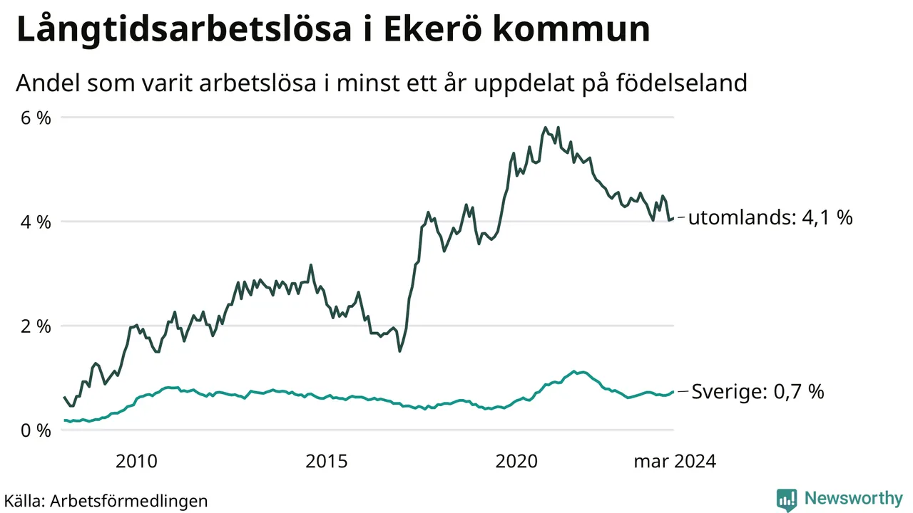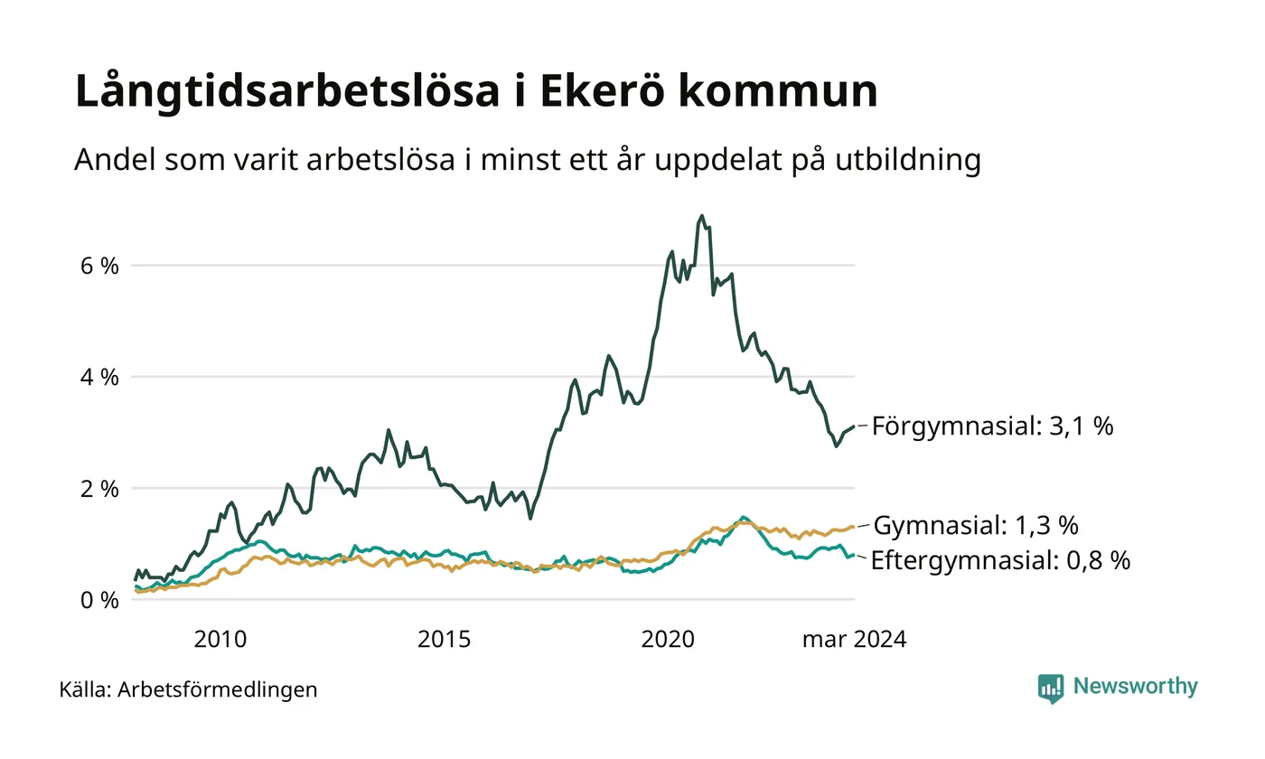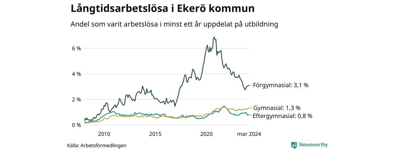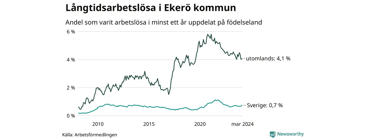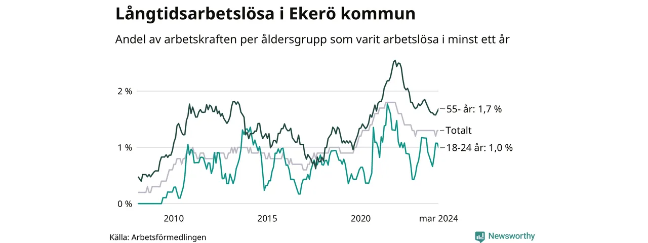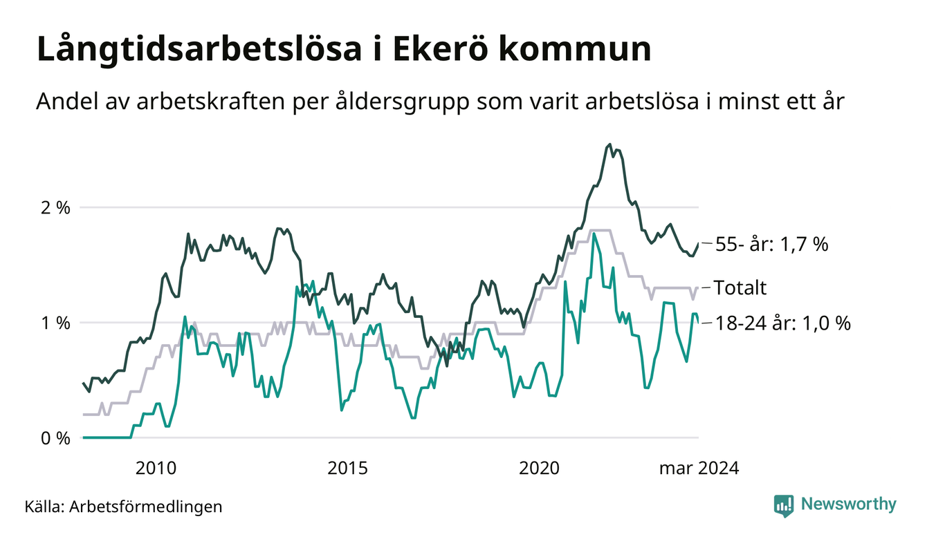 I mars hade 179 Ekeröbor varit arbetslösa i minst ett år, vilket är en fler än månaden innan. 179 personer motsvarar 1,3 procent av arbetskraften i kommunen – andelen långtidsarbetslösa är ungefär på samma nivå som för ett år sedan.