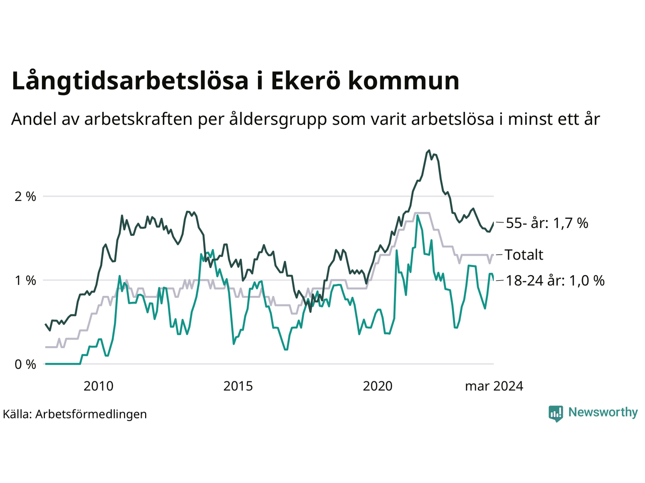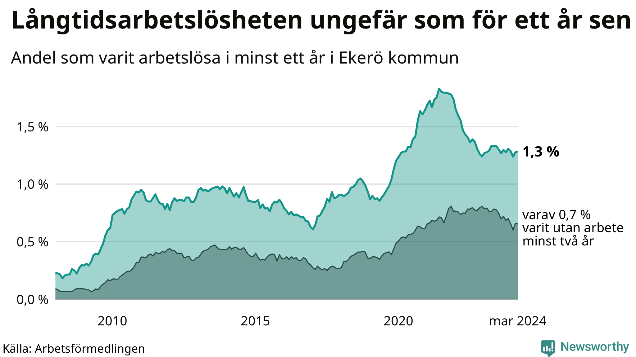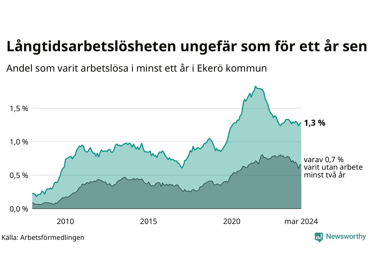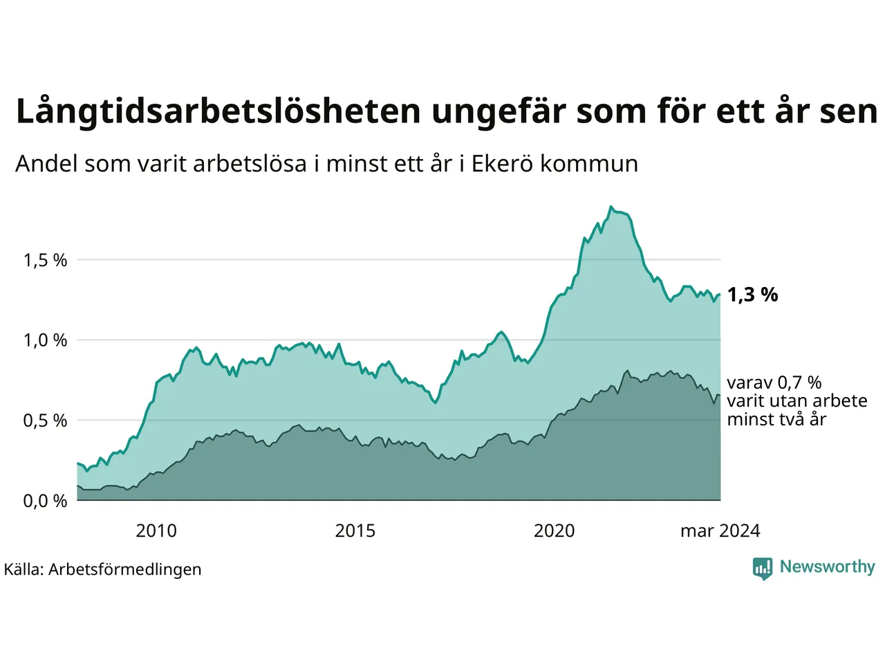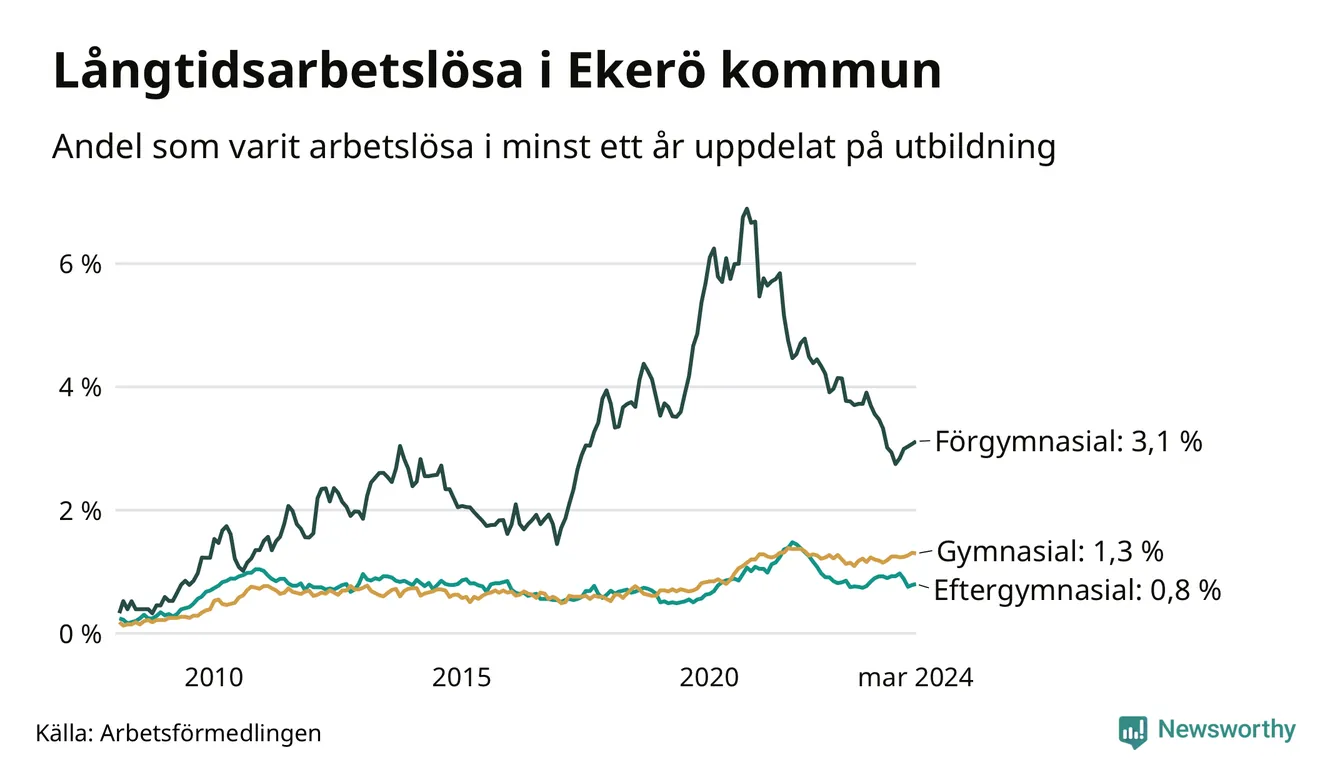 I mars hade 179 Ekeröbor varit arbetslösa i minst ett år, vilket är en fler än månaden innan. 179 personer motsvarar 1,3 procent av arbetskraften i kommunen – andelen långtidsarbetslösa är ungefär på samma nivå som för ett år sedan.