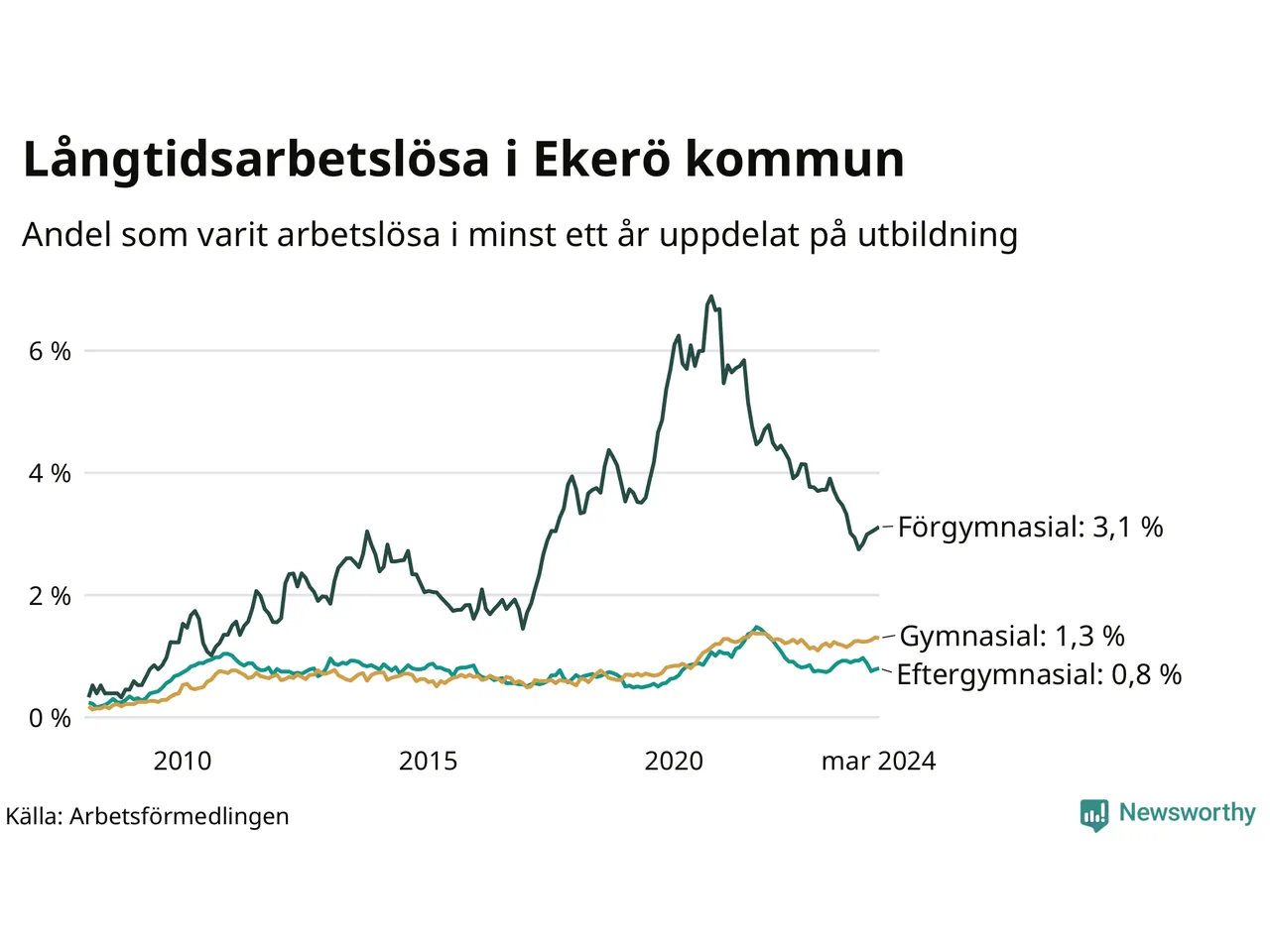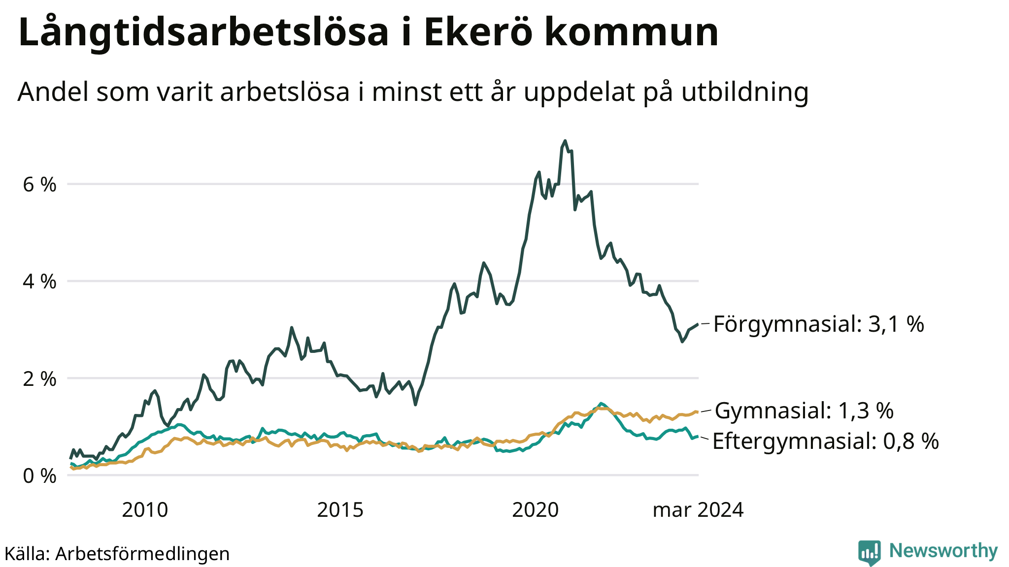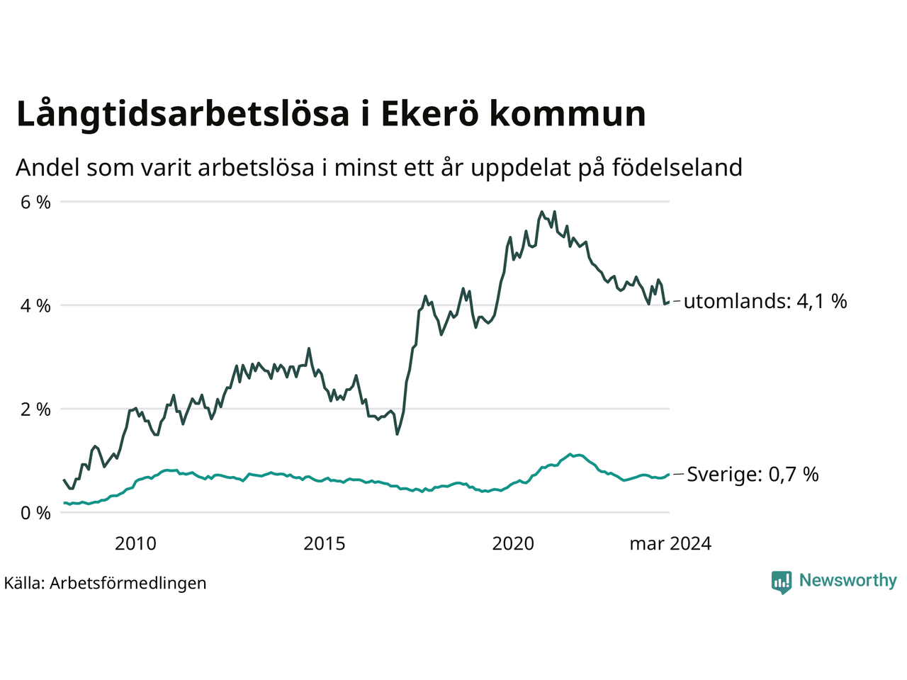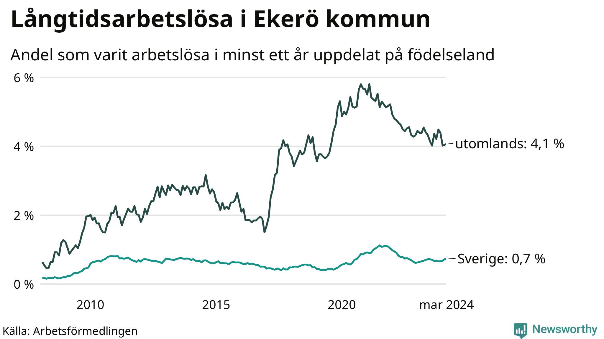 I mars hade 179 Ekeröbor varit arbetslösa i minst ett år, vilket är en fler än månaden innan. 179 personer motsvarar 1,3 procent av arbetskraften i kommunen – andelen långtidsarbetslösa är ungefär på samma nivå som för ett år sedan.