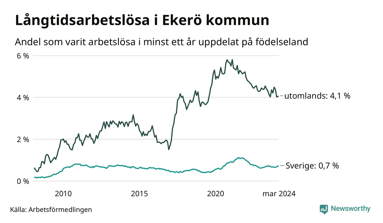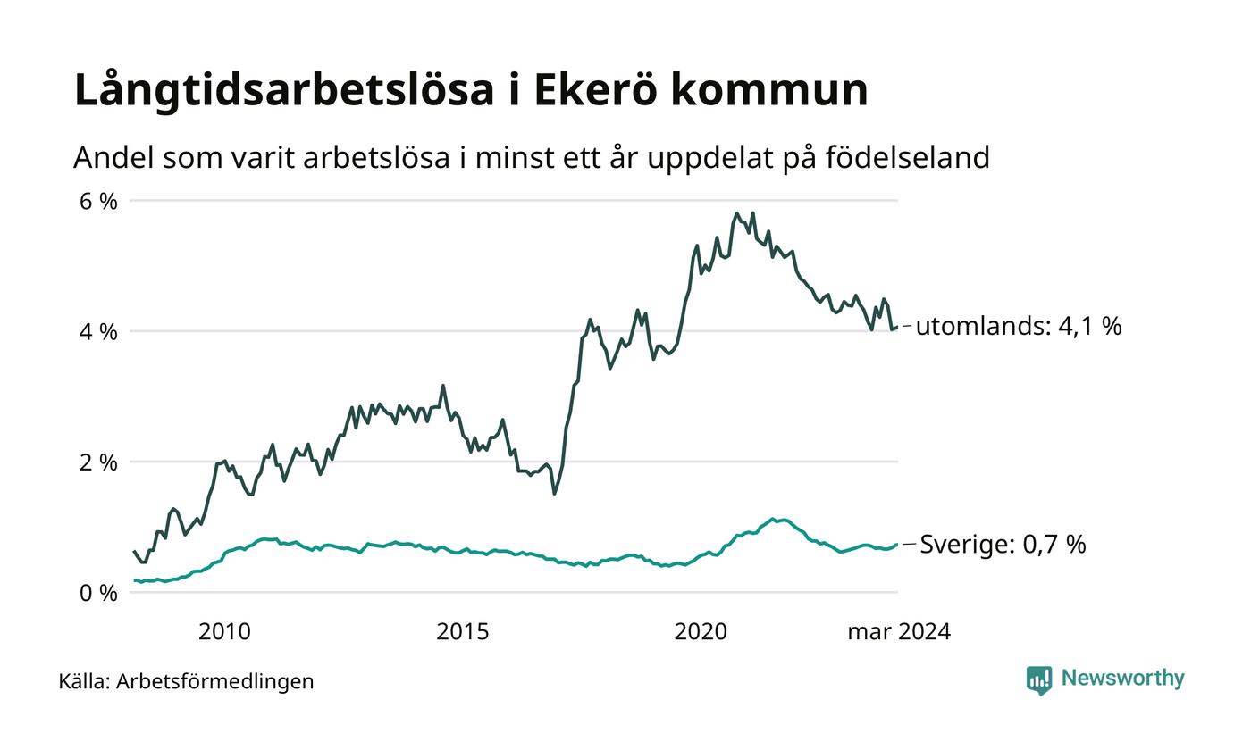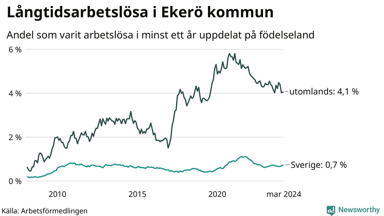 85 av de långtidsarbetslösa i Ekerö är födda i Sverige, medan 94 är födda utomlands. Det innebär att långtidsarbetslösheten bland Sverigefödda är 0,7 procent, medan den är sex gånger så hög – 4,1 procent – bland födda utomlands. Även i riket som helhet är arbetslösheten högre bland utrikesfödda.