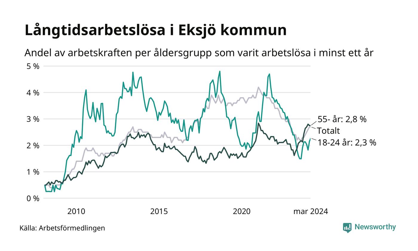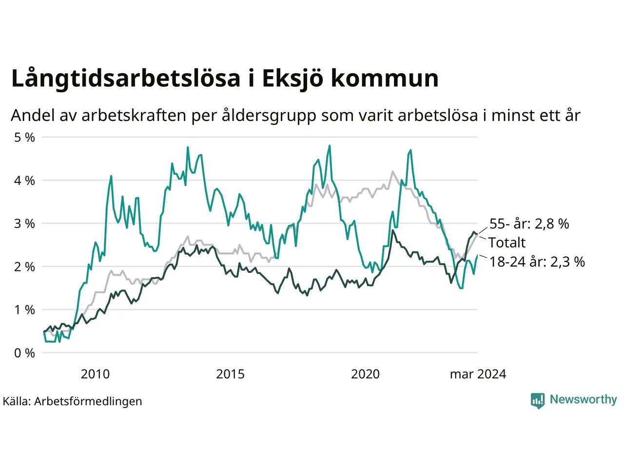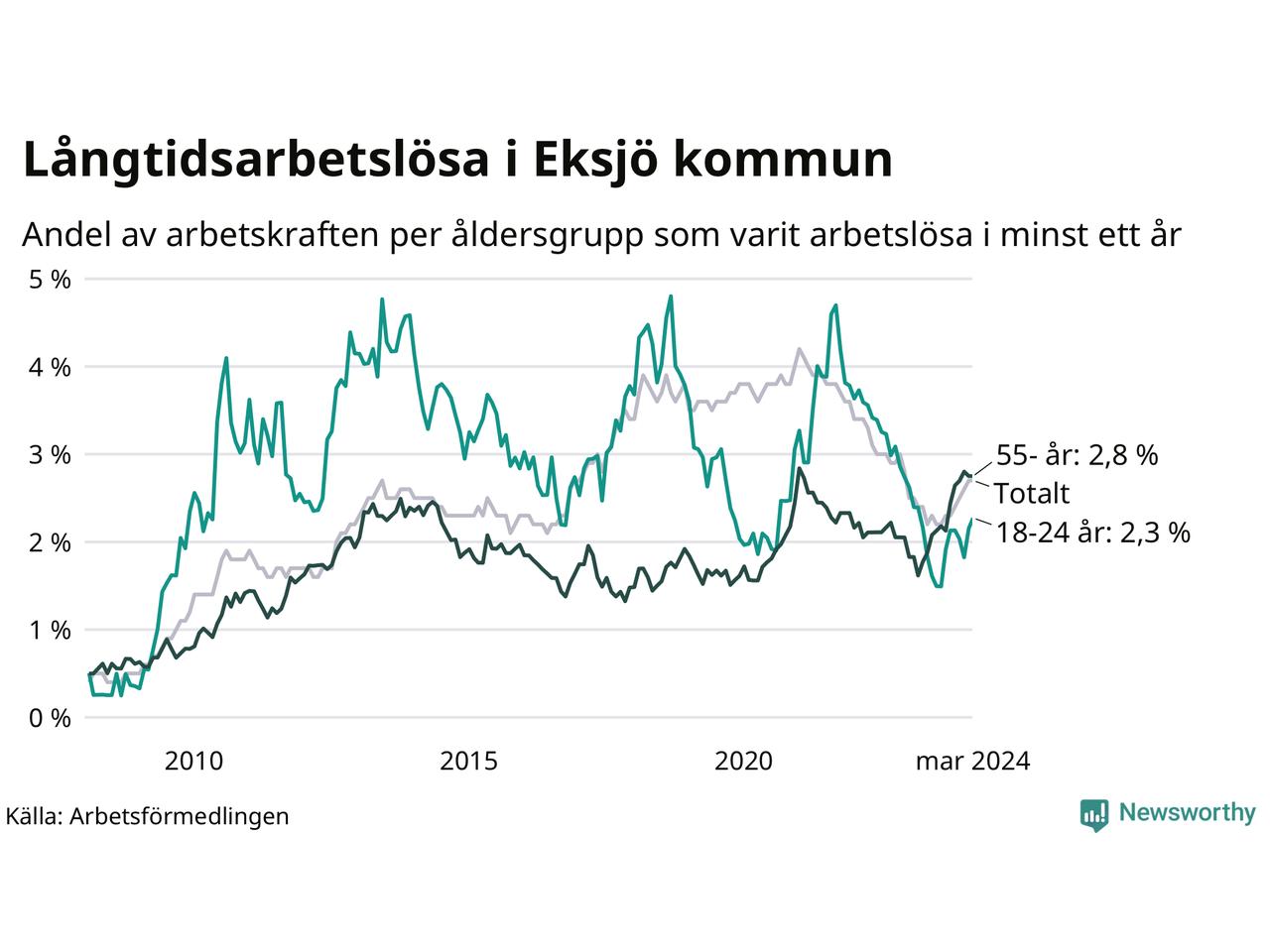 Av de 227 personerna som varit arbetslösa i mer än ett år i Eksjö kommun är 53 personer mellan 55 och 651 år och 21 är mellan 18 och 24 år. För den äldre gruppen är andelen arbetslösa 2,8 procent medan den i den yngre gruppen är 2,3 procent. Även i riket som helhet är långtidsarbetslösheten högre i gruppen äldre.