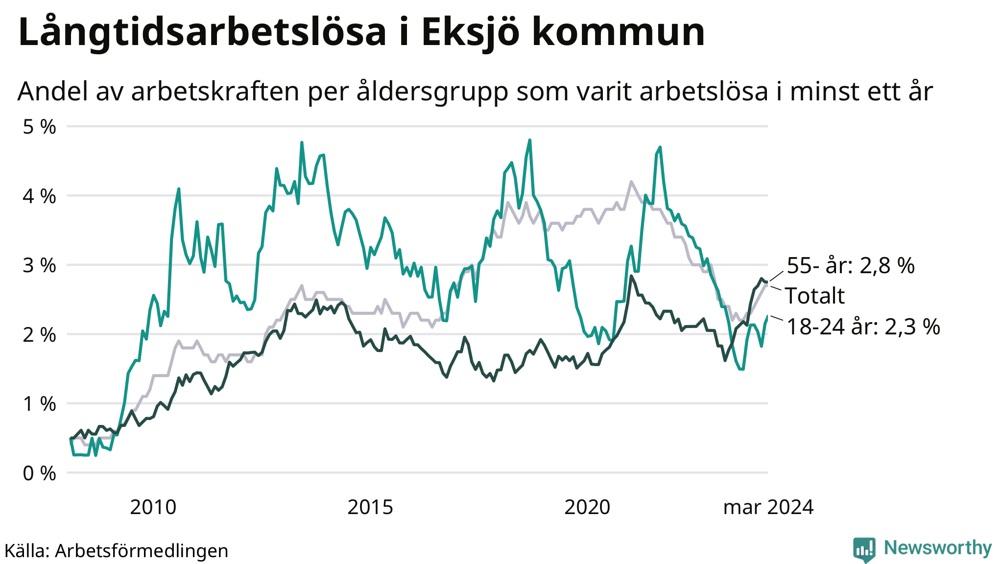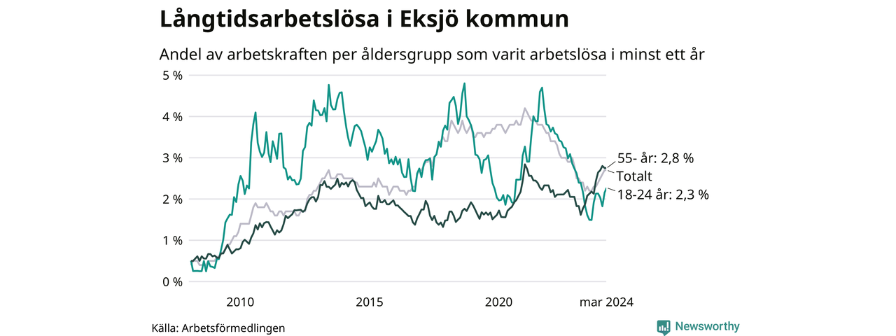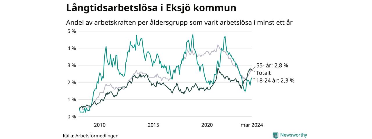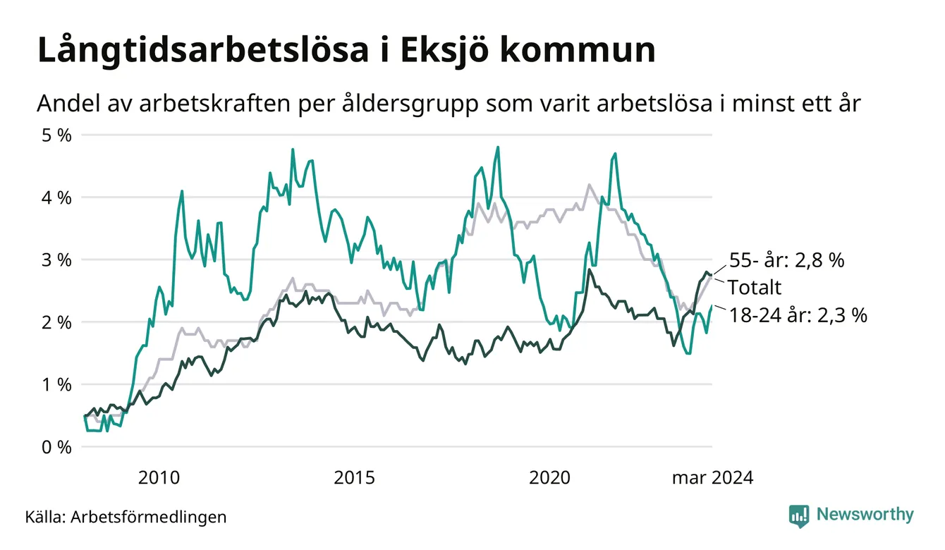 Av de 227 personerna som varit arbetslösa i mer än ett år i Eksjö kommun är 53 personer mellan 55 och 651 år och 21 är mellan 18 och 24 år. För den äldre gruppen är andelen arbetslösa 2,8 procent medan den i den yngre gruppen är 2,3 procent. Även i riket som helhet är långtidsarbetslösheten högre i gruppen äldre.