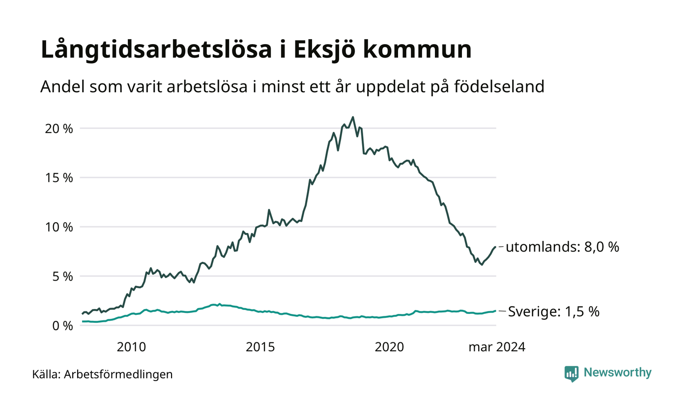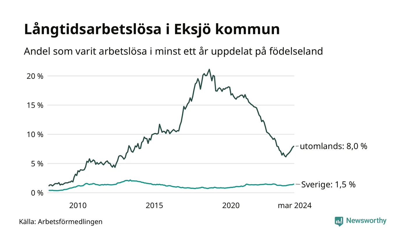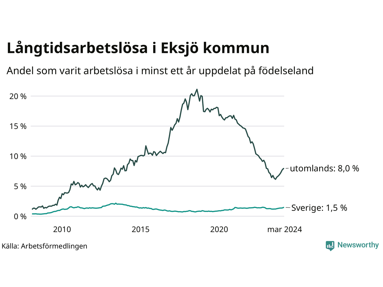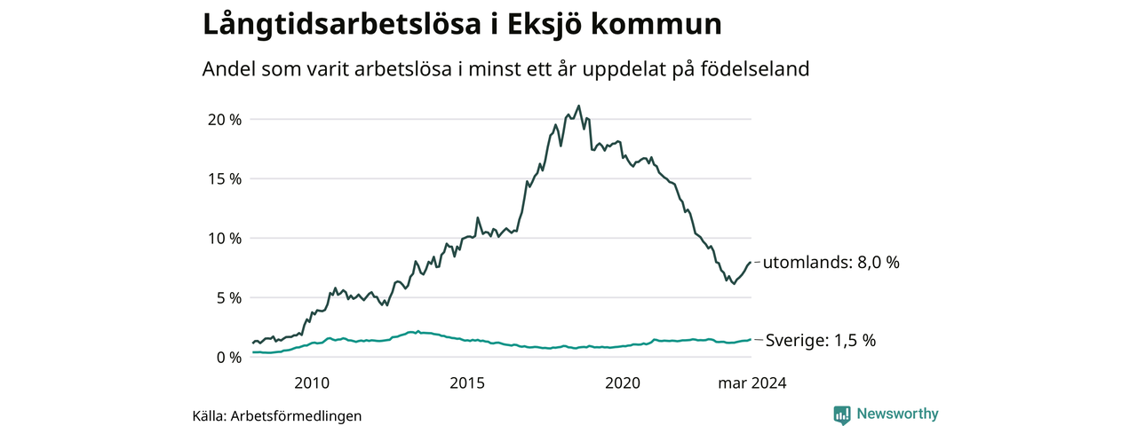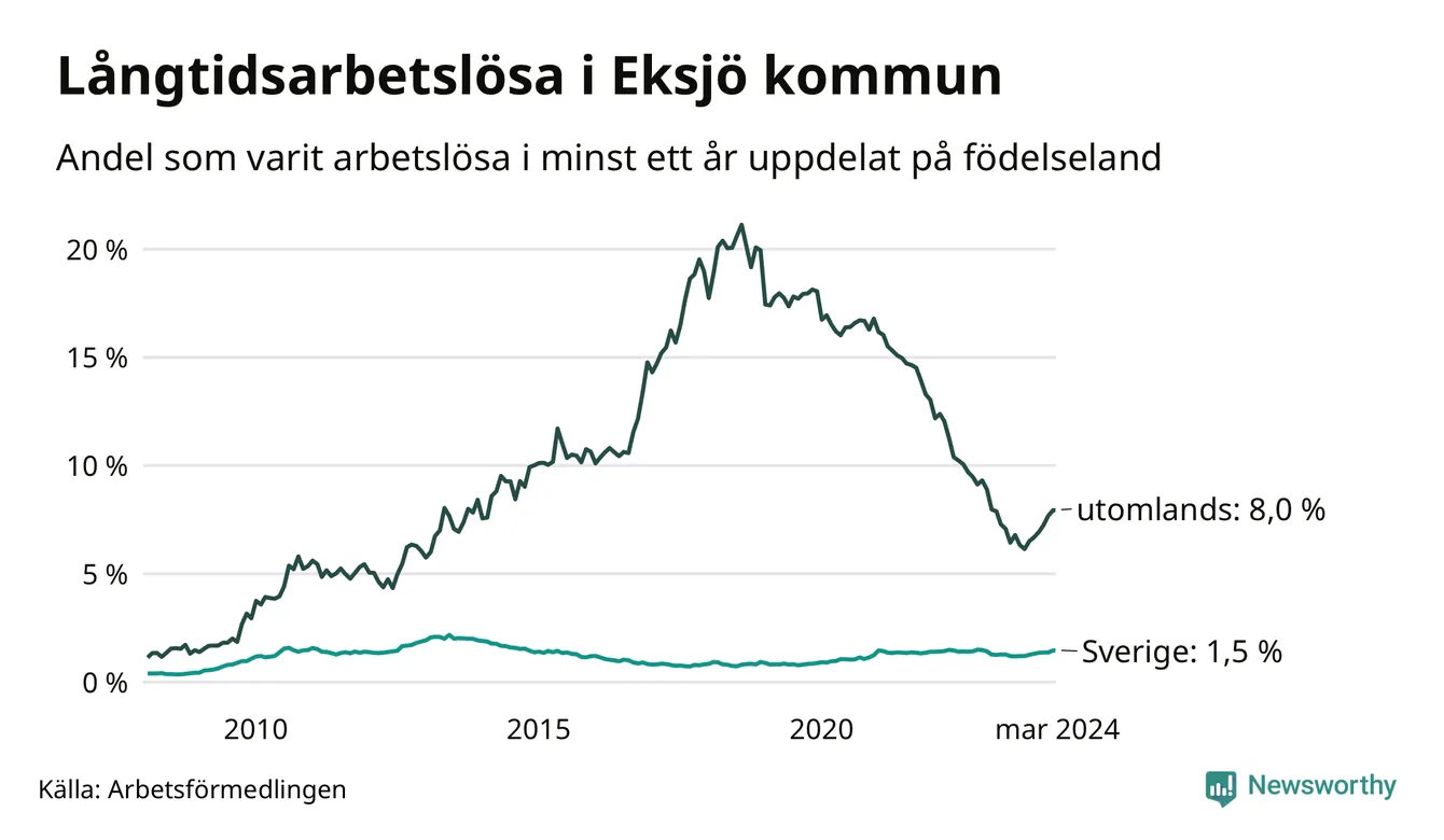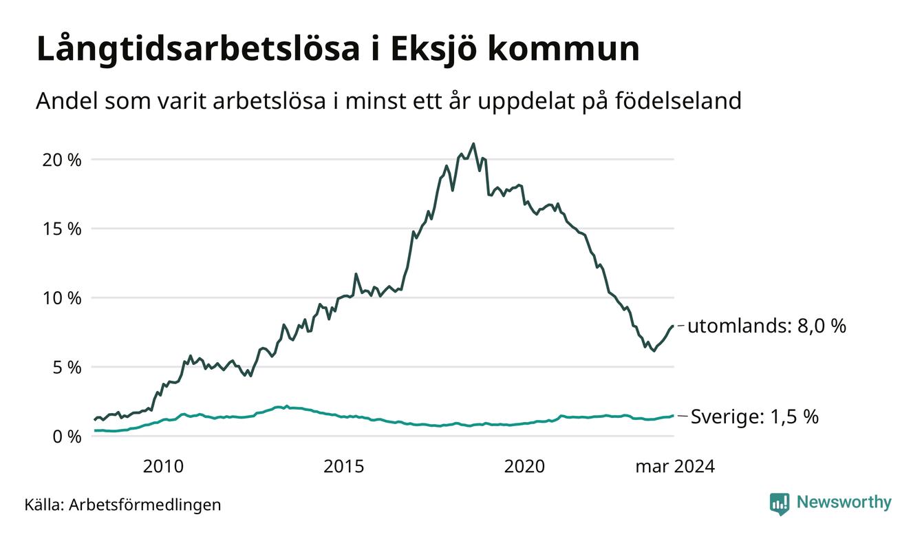 99 av de långtidsarbetslösa i Eksjö är födda i Sverige, medan 128 är födda utomlands. Det innebär att långtidsarbetslösheten bland Sverigefödda är 1,5 procent, medan den är fem gånger så hög – 8,0 procent – bland födda utomlands. Även i riket som helhet är arbetslösheten högre bland utrikesfödda.