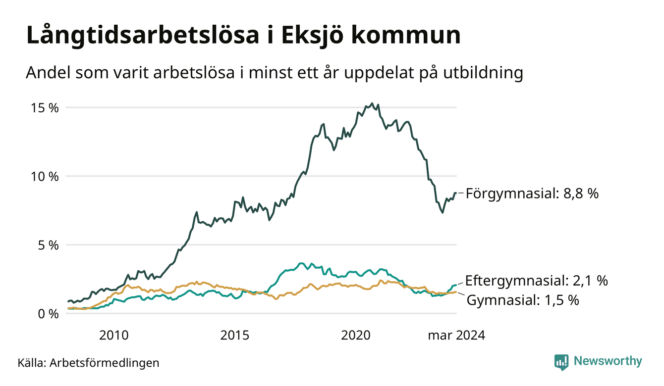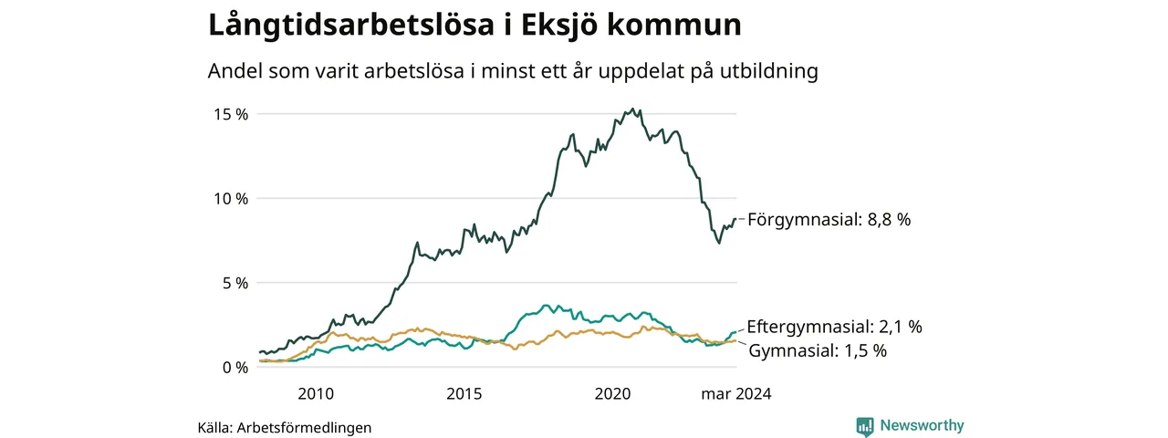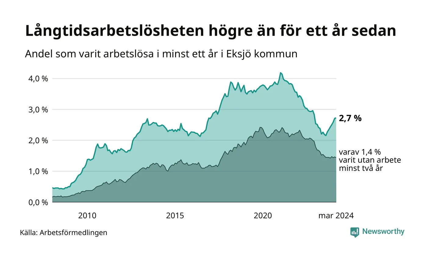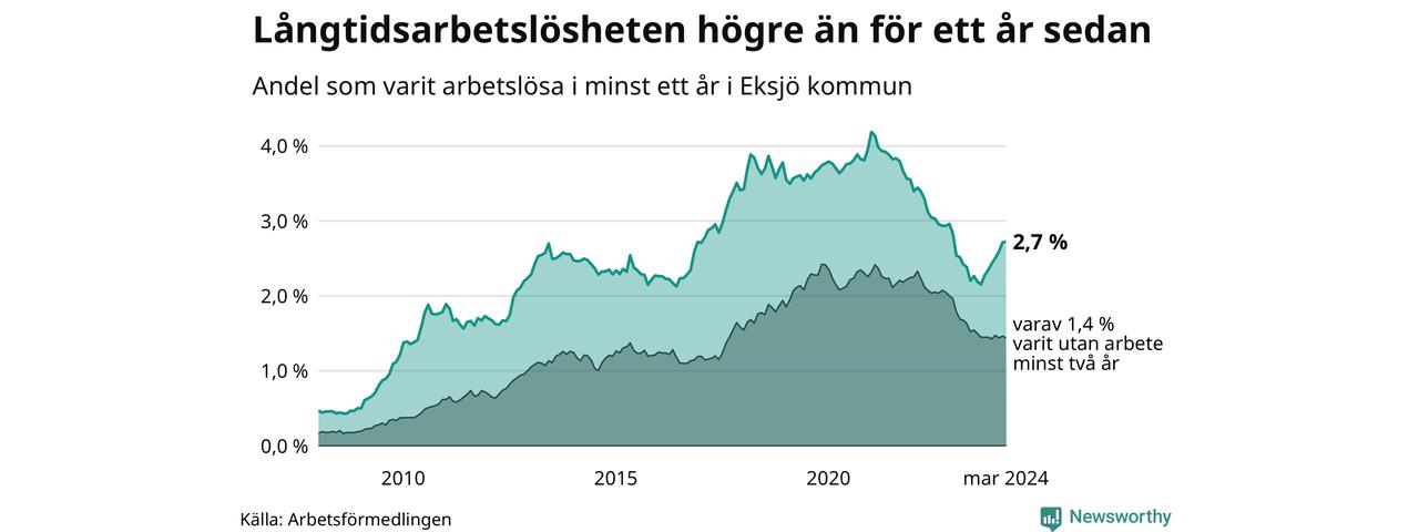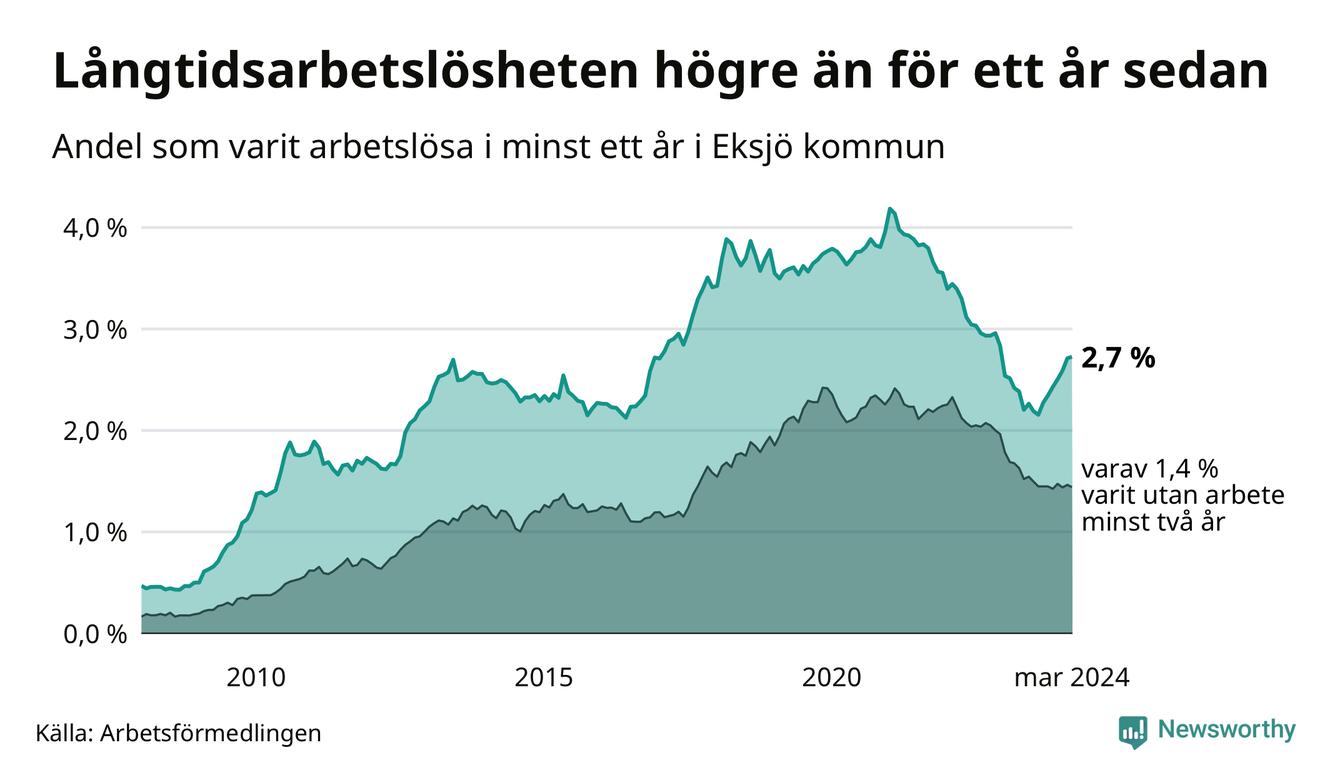 Inte sedan december 2022 har andelen långtidsarbetslösa varit så hög i Eksjö. Det visar Arbetsförmedlingens senaste månadsstatistik.