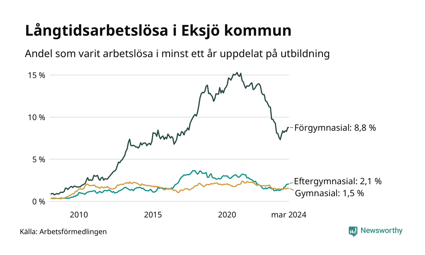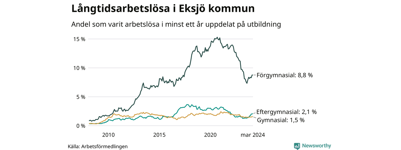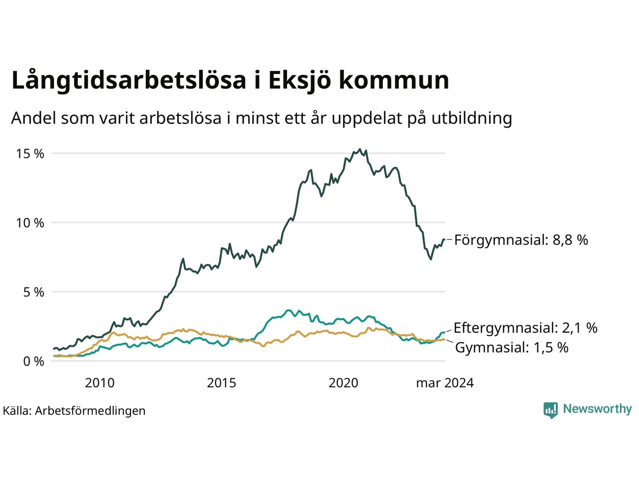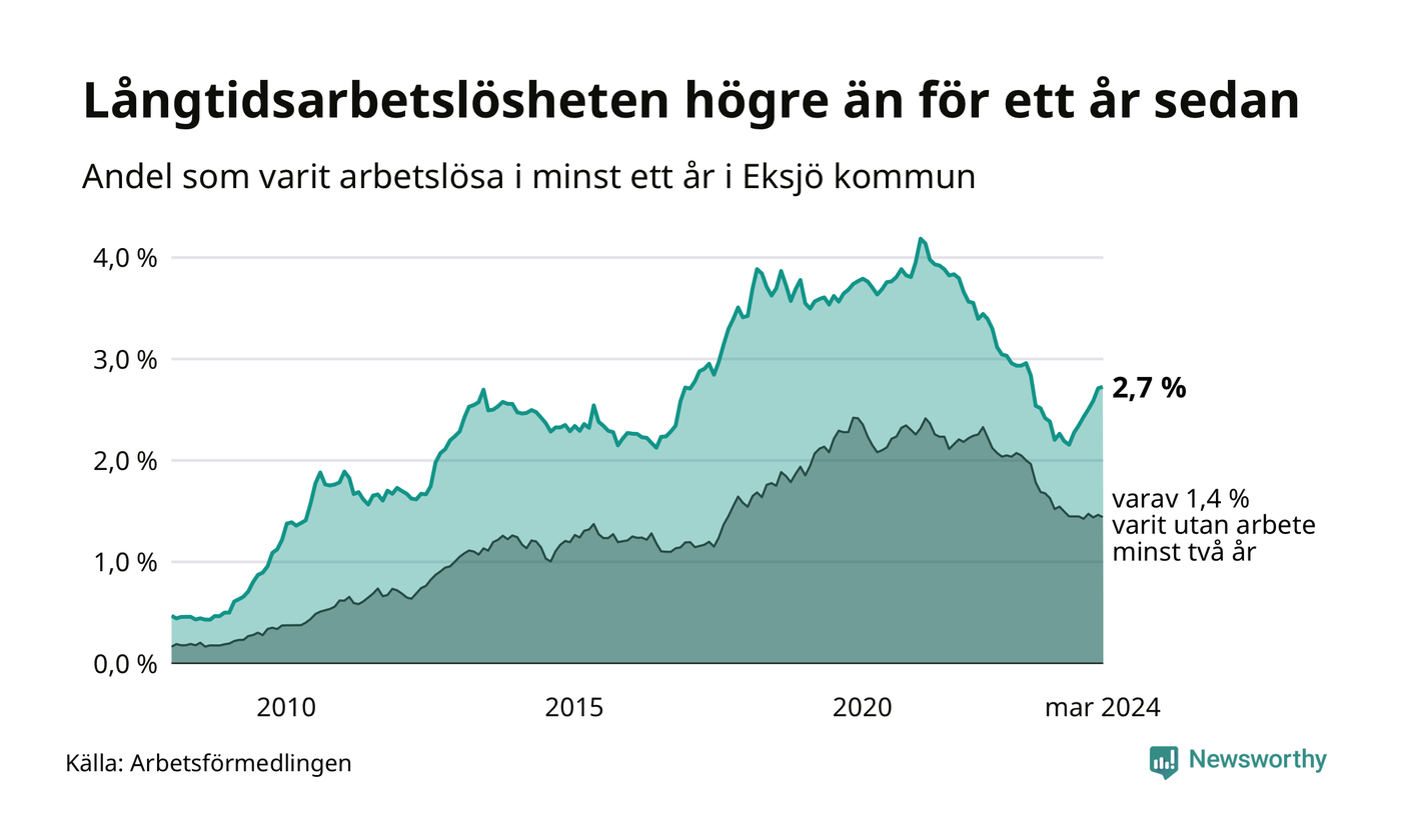 I mars hade 227 Eksjöbor varit arbetslösa i minst ett år, vilket är en fler än månaden innan. Det är den sjunde månaden i rad med ökande antal långtidsarbetslösa. 227 personer motsvarar 2,7 procent av arbetskraften i kommunen – andelen långtidsarbetslösa är 0,3 procentenheter högre än samma månad för ett år sedan.