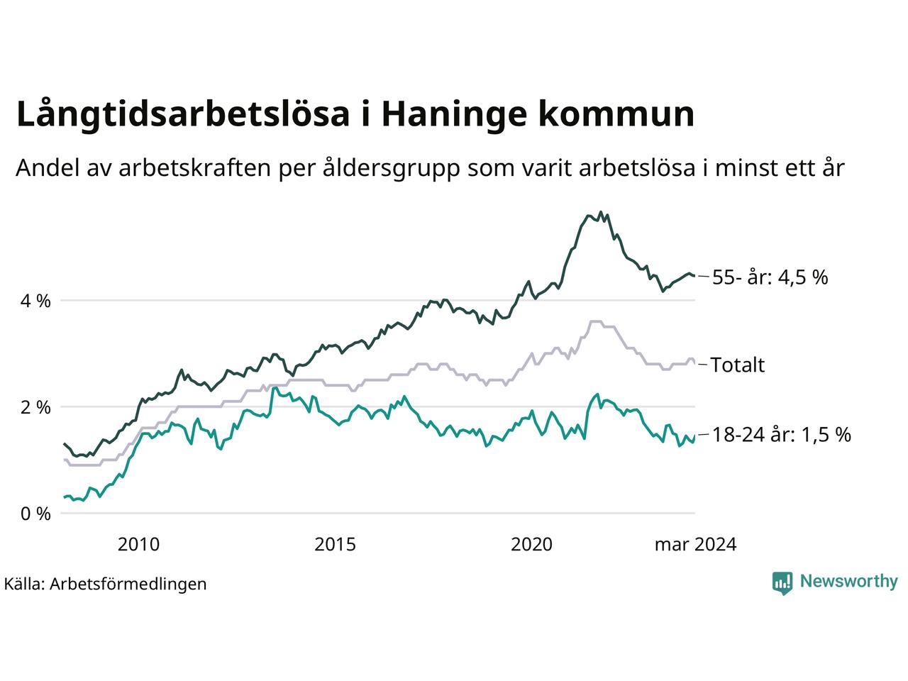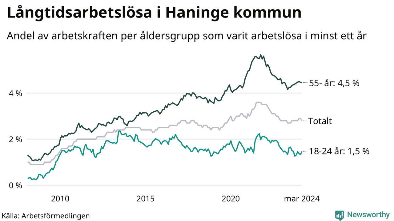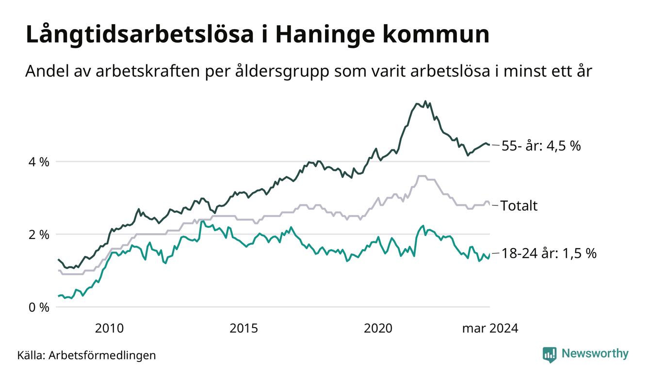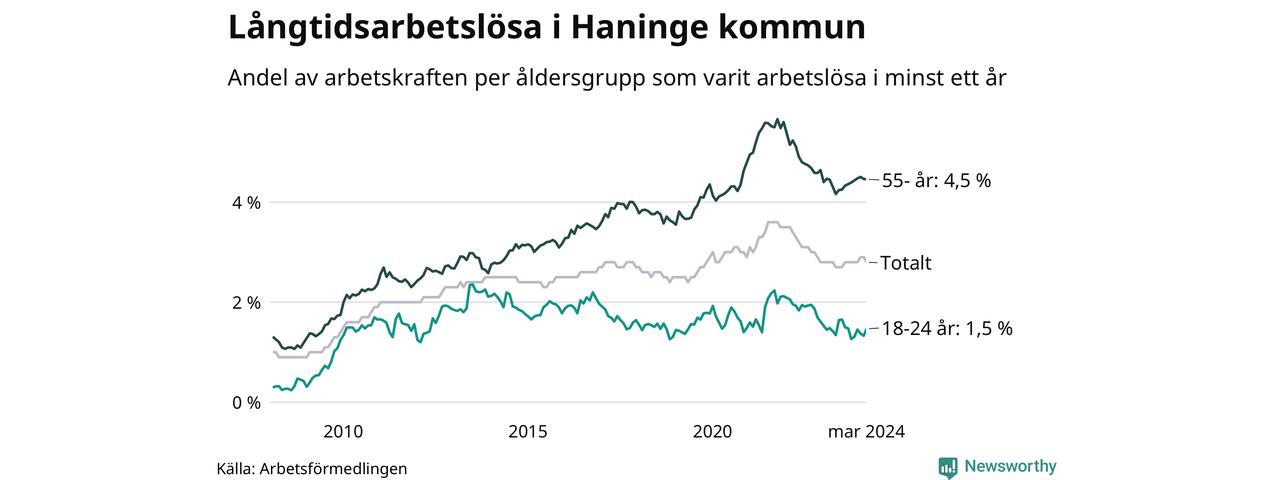 Av de 1 477 personerna som varit arbetslösa i mer än ett år i Haninge kommun är 395 personer mellan 55 och 651 år och 81 är mellan 18 och 24 år. För den äldre gruppen är andelen arbetslösa 4,5 procent medan den i den yngre gruppen är 1,5 procent. Även i riket som helhet är långtidsarbetslösheten högre i gruppen äldre.