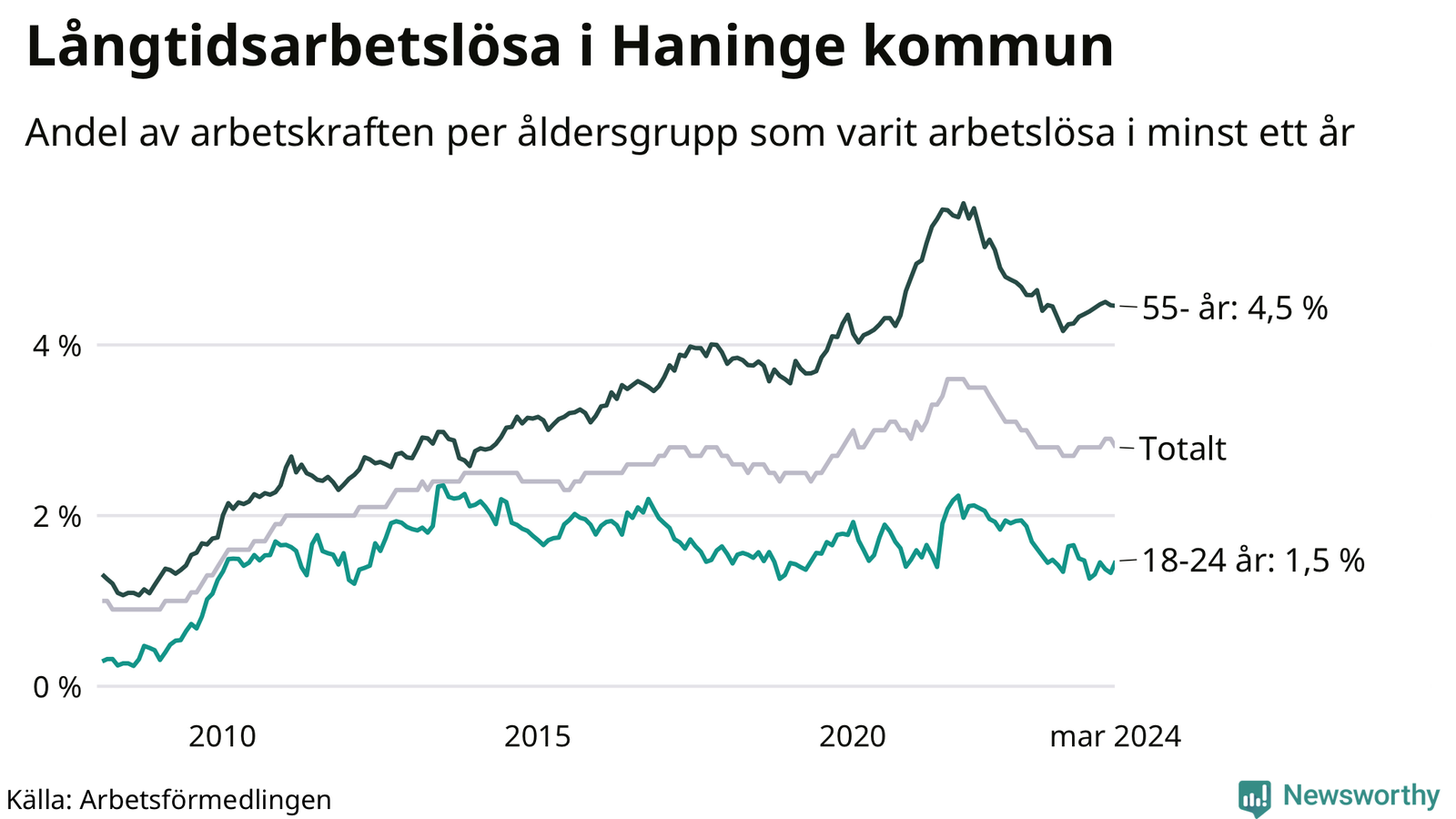 Graf: Andel arbetslösa uppdelat i åldersgrupper i Haninge