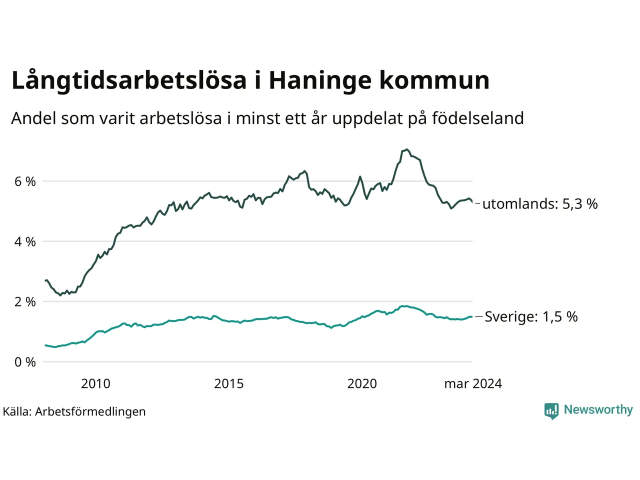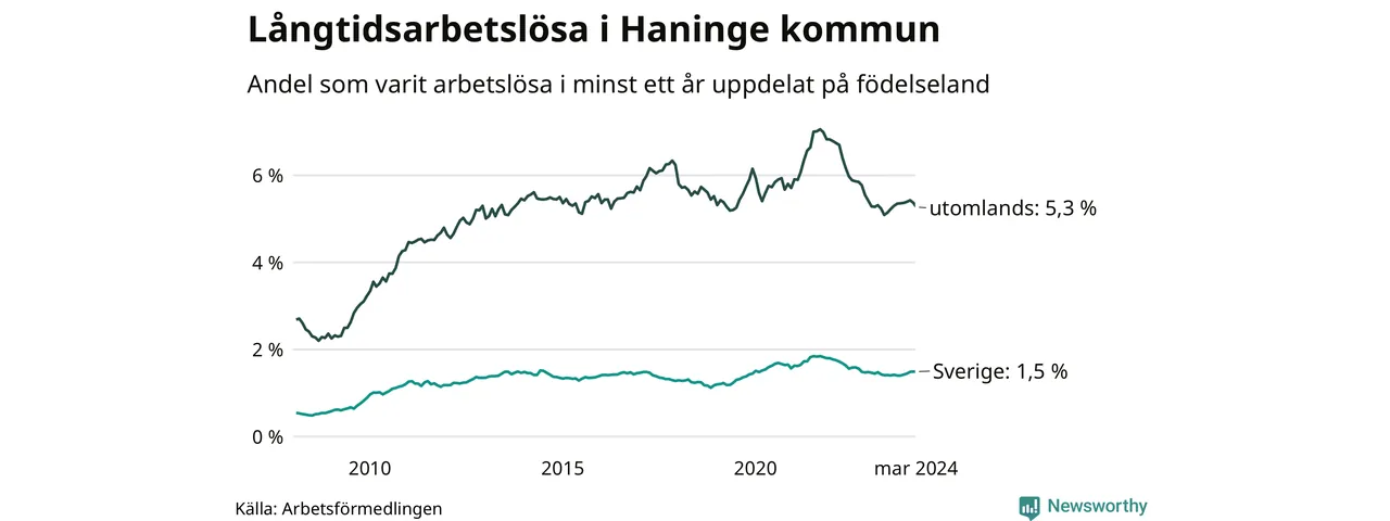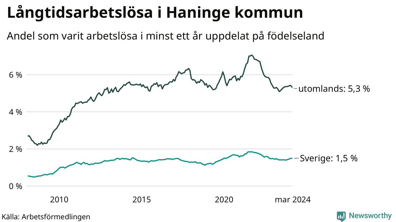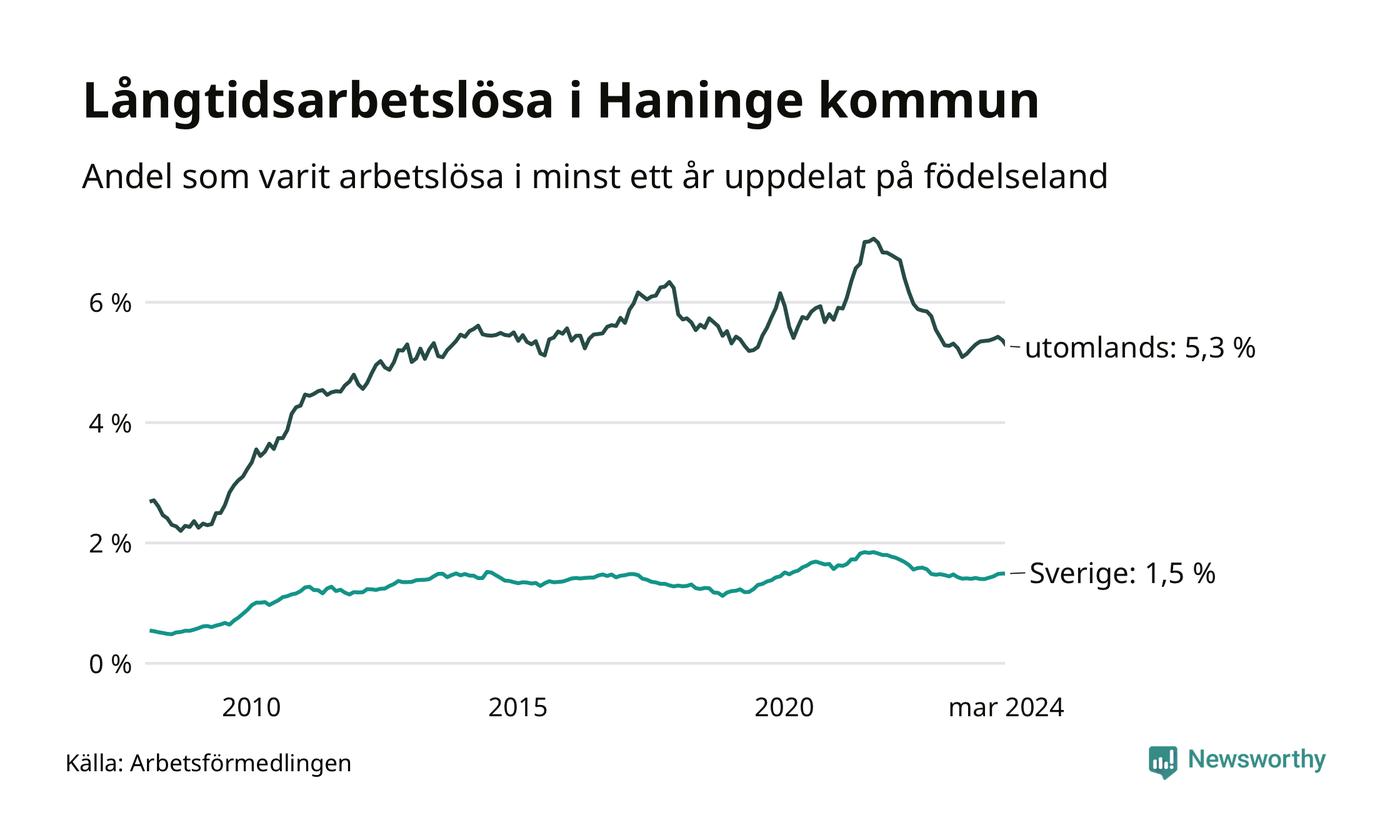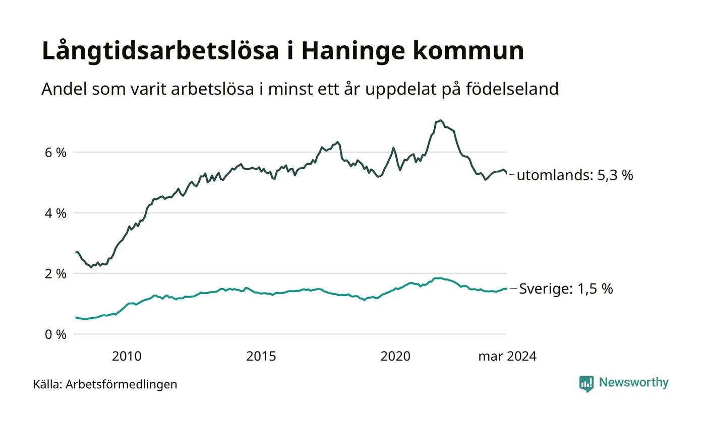 498 av de långtidsarbetslösa i Haninge är födda i Sverige, medan 979 är födda utomlands. Det innebär att långtidsarbetslösheten bland Sverigefödda är 1,5 procent, medan den är fyra gånger så hög – 5,3 procent – bland födda utomlands. Även i riket som helhet är arbetslösheten högre bland utrikesfödda.