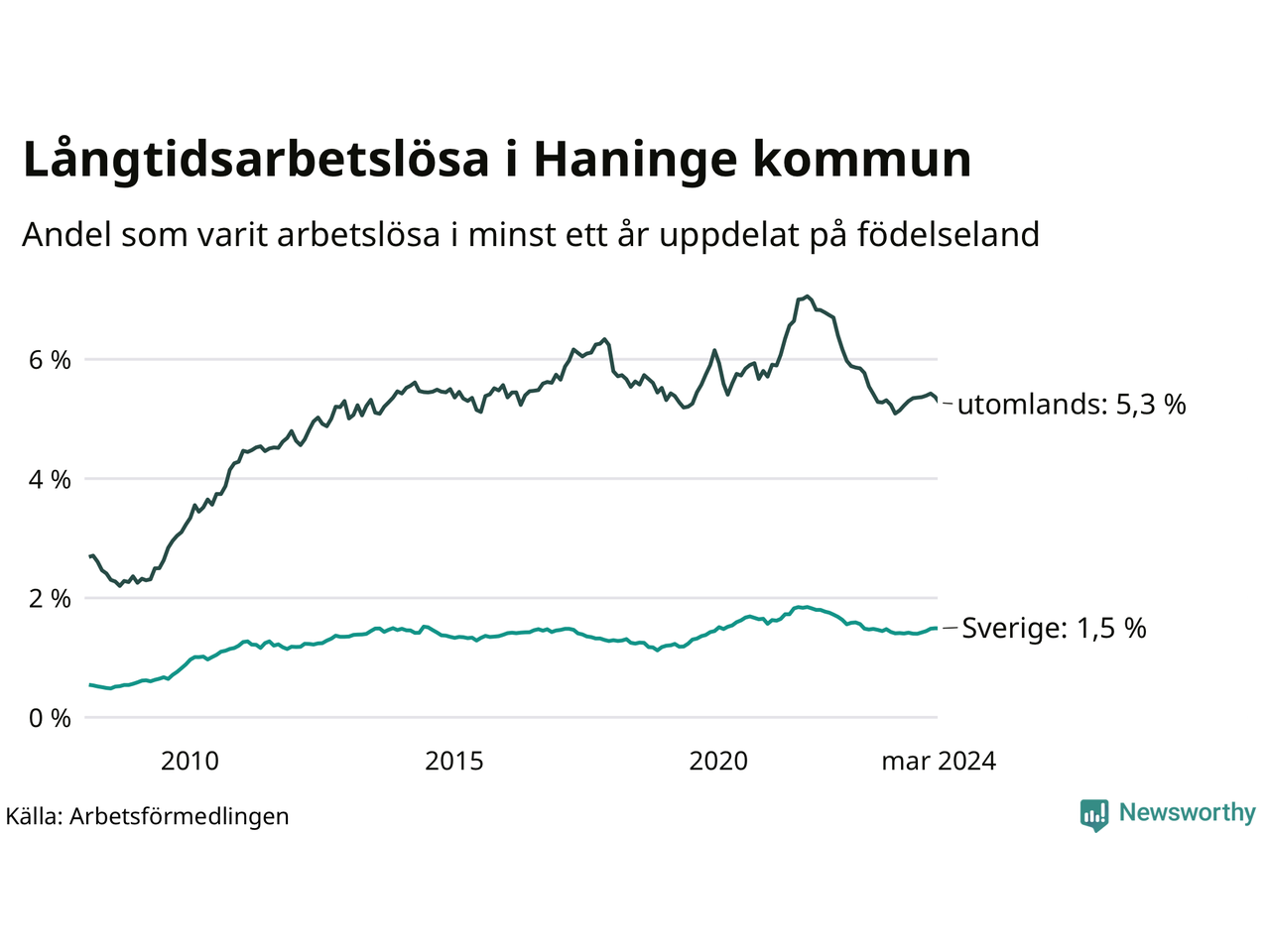 Graf: Andel arbetslösa uppdelat på födelseland i Haninge
